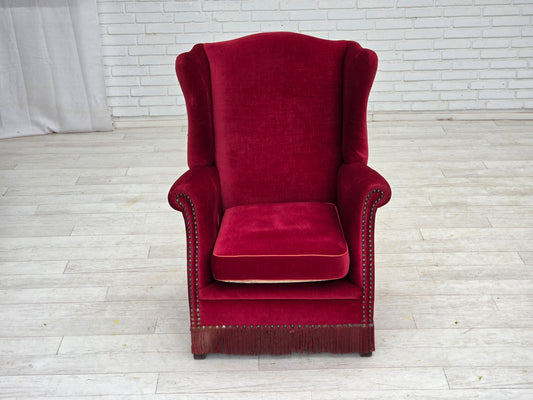 1970s, Danish highback armchair, red furniture velour, ash wood.