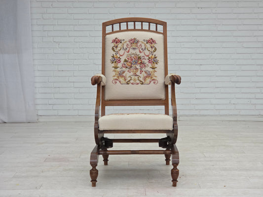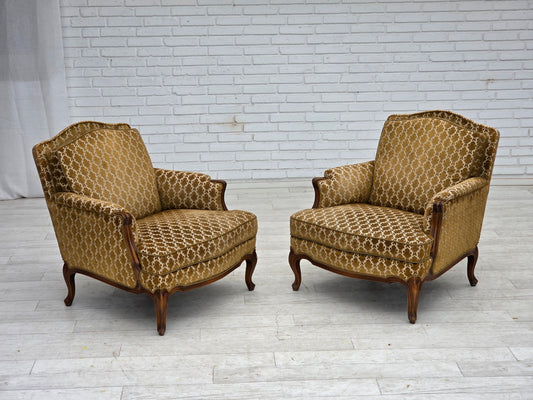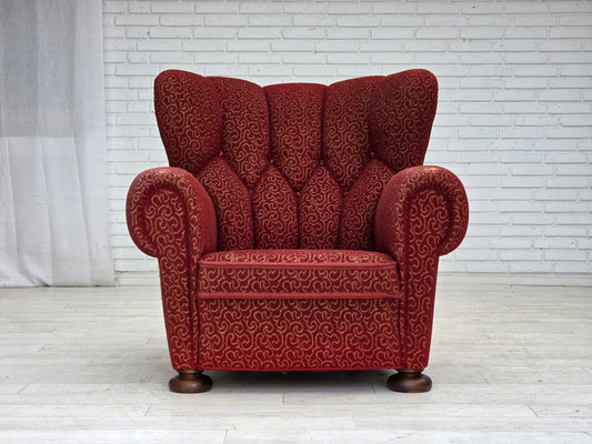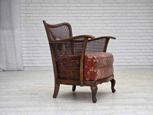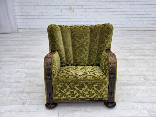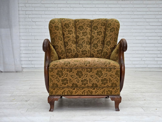 1920-30s, Danish armchair, furniture cotton fabric, hand carved oak wood.