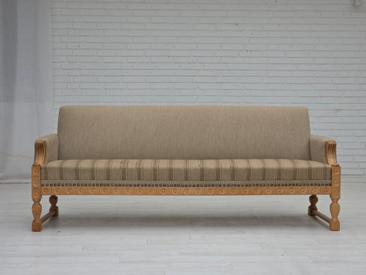 1970s, 3-seater Danish sofa, original beige furniture wool, solid oak wood.