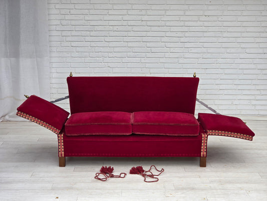 1970s, Danish 2-seater "Spanish" drop arm sofa, cherry-red furniture velour.