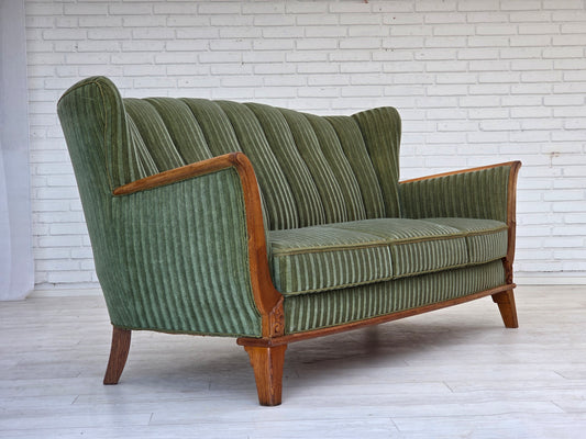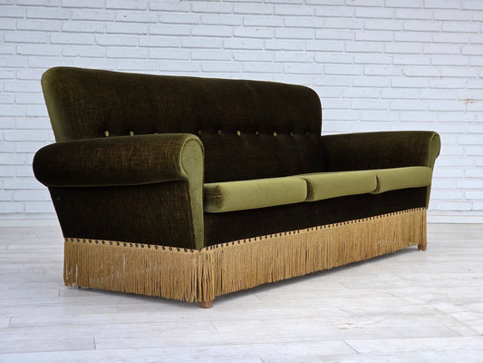 1960s, Danish 3-seater sofa, original green furniture velour, oak wood.