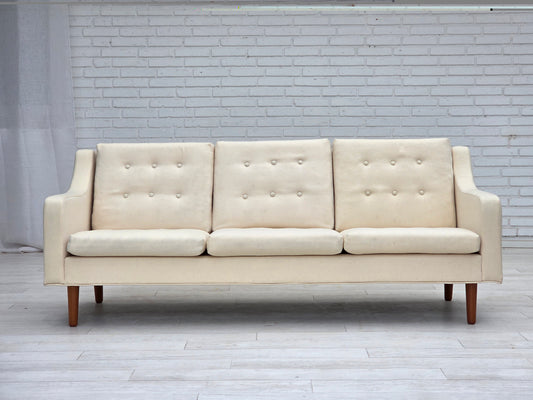 1970s, 3-seater Danish sofa, beige/white furniture wool, teak wood legs.