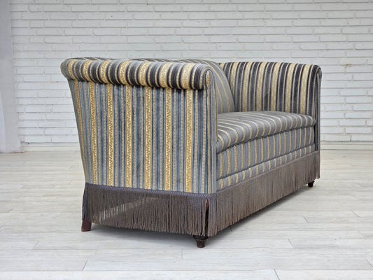 1960s, Danish 3-seater sofa, blue/beige furniture velour, beech wood legs.