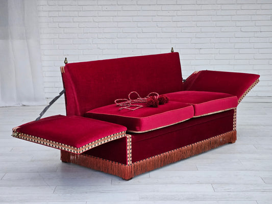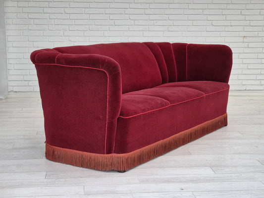 1960s, Danish 3 seater sofa, original condition, cherry-red furniture velour.