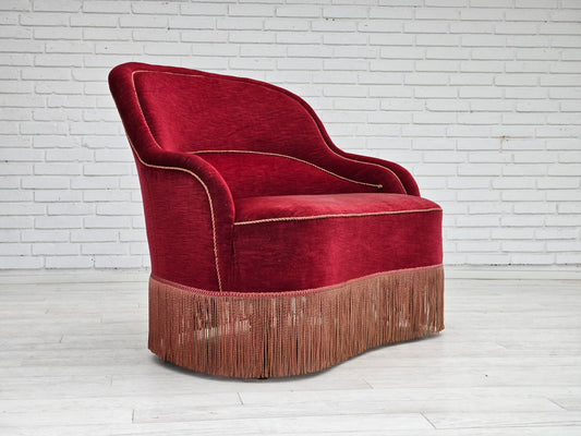 1950s, Danish 2-seater curved sofa, cherry-red furniture velour.