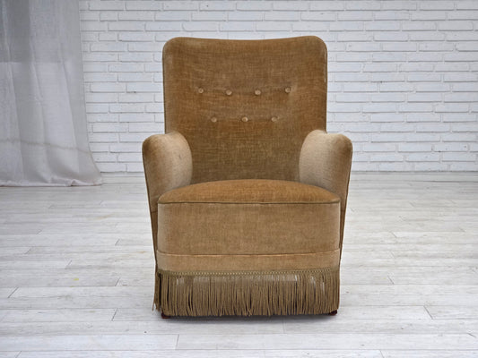 1950s, Danish relax chair, furniture velour with patina, oak wood legs.