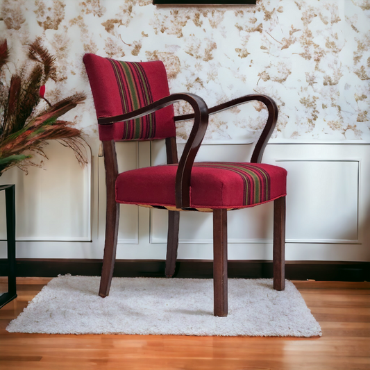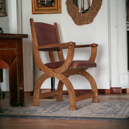 1950s, Danish design, reupholstered armchair, natural brown leather, oak wood.