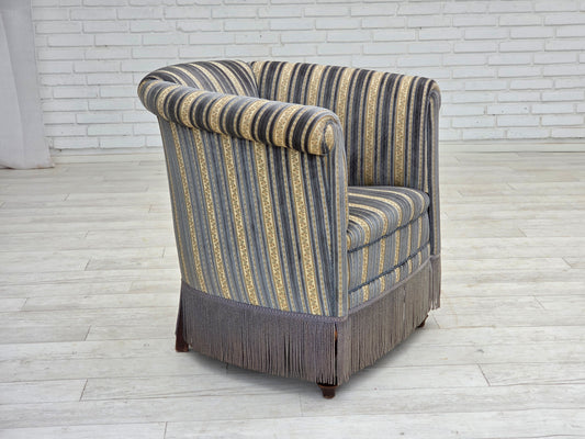 1960s, Danish lounge chair, blue/beige furniture velour, beech wood legs.