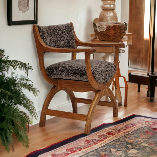 1960s, Danish design by Henning Kjærnulf, chair model "Kurul", sheepskin, oak wood.