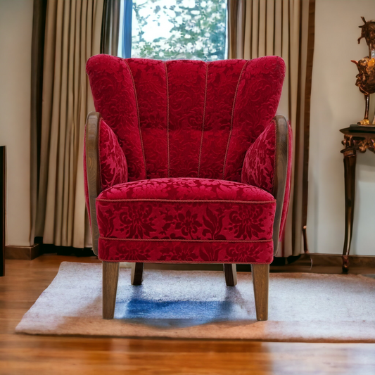 1960s, Danish vintage highback armchair in cherry-red velvet.
