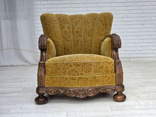1960s, Danish armchair, green furniture velour, carved oak wood.