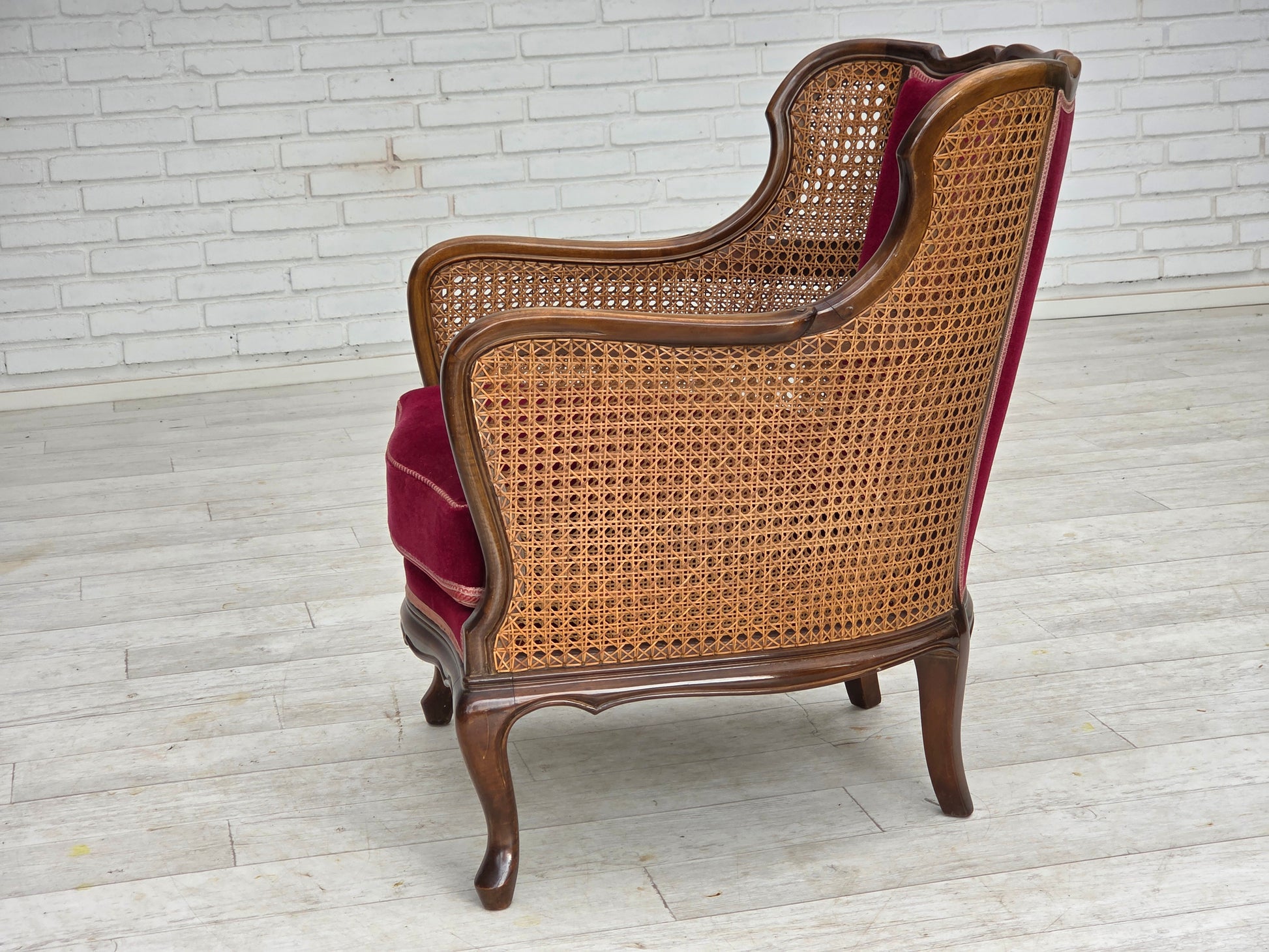 DESCRIPTION: 1950s, Danish armchair. Original cherry-red furniture velour, ash wood, furniture mesh. Double sided seat cushions with springs inside. Original very good condition: no smells, no stains and stable construction. Manufactured by Danish furniture maker in about 1950-55s. Original Scandinavian vintage design directly from Denmark. The chair was checked by craftsman.