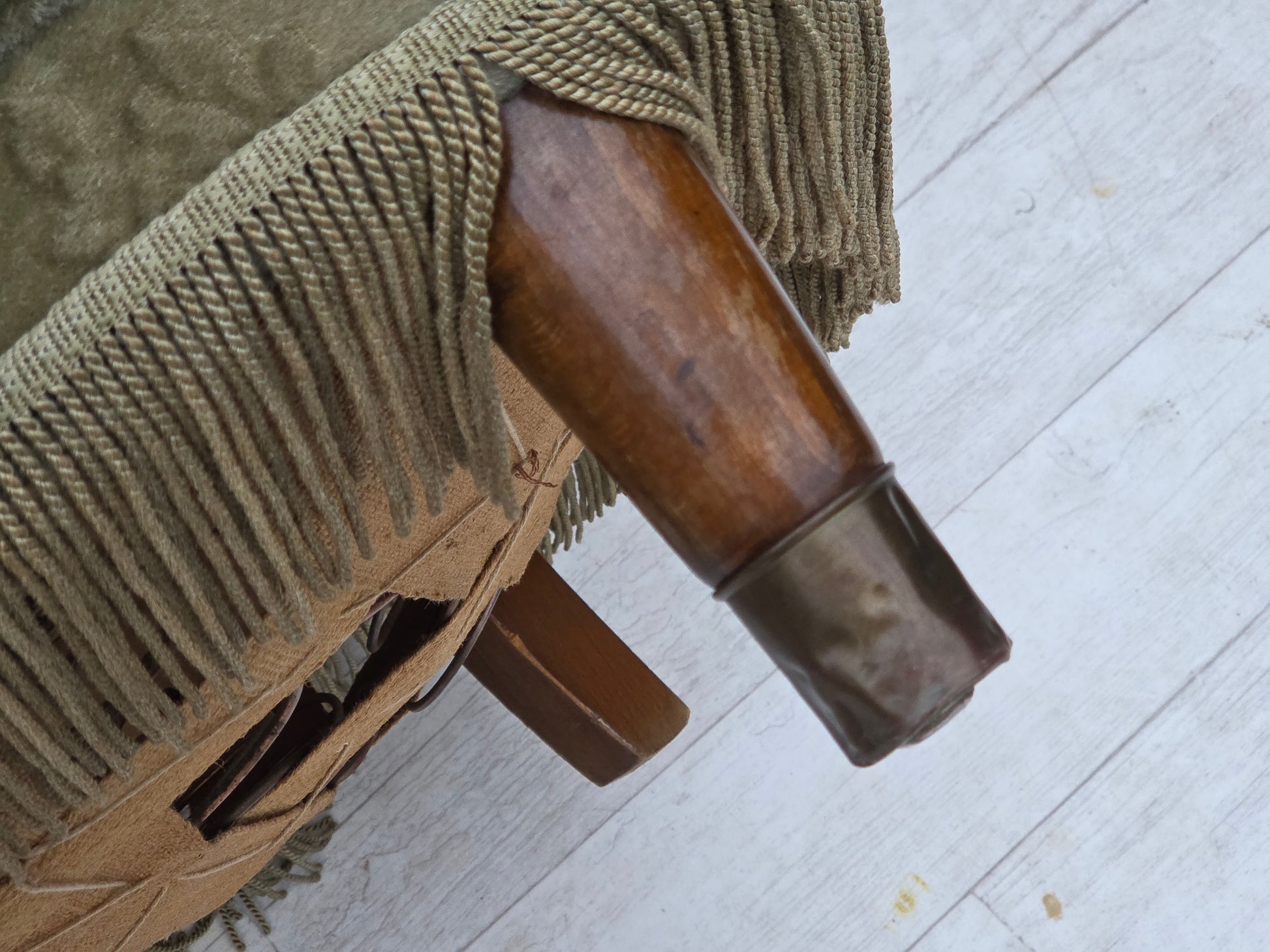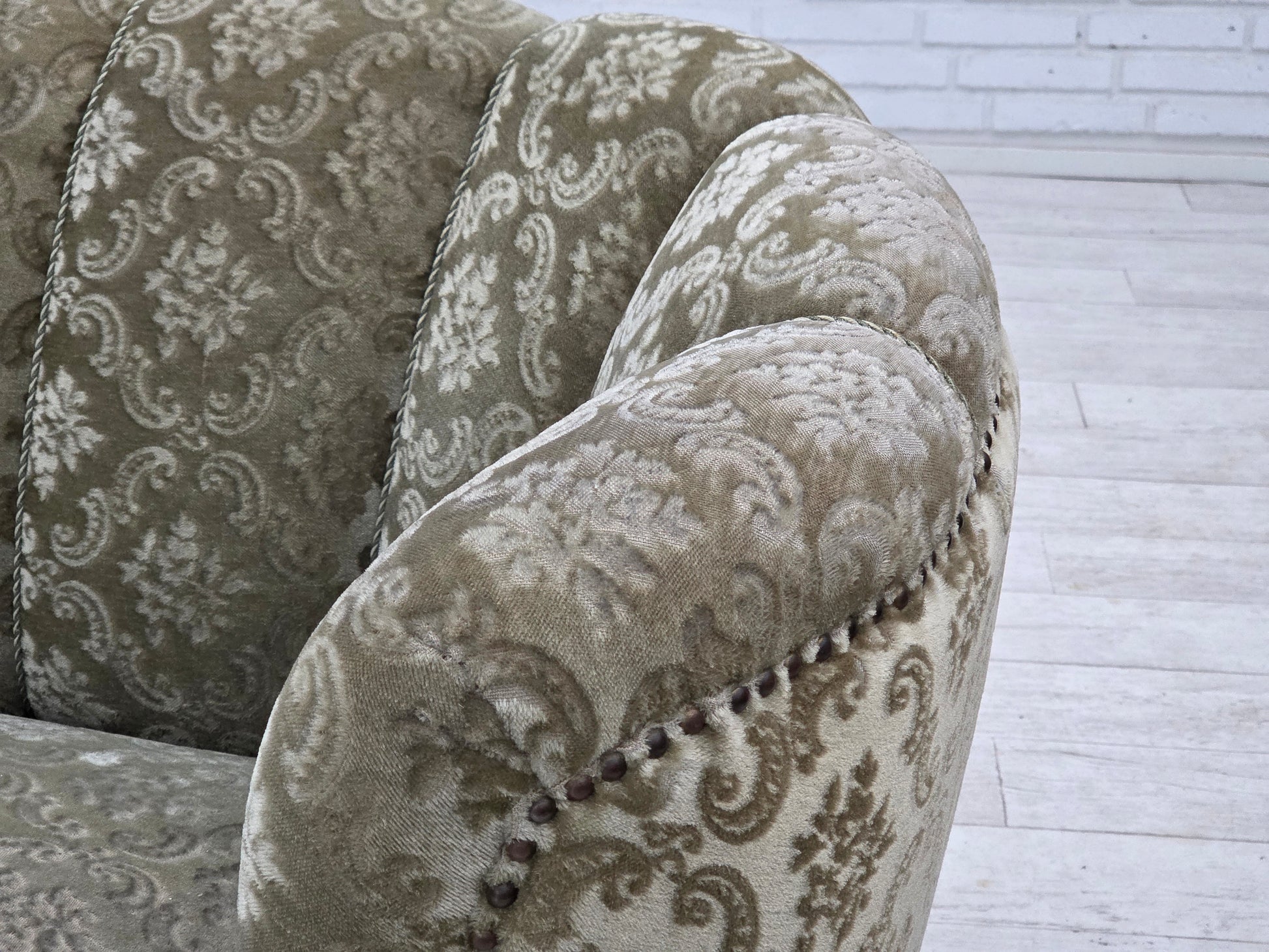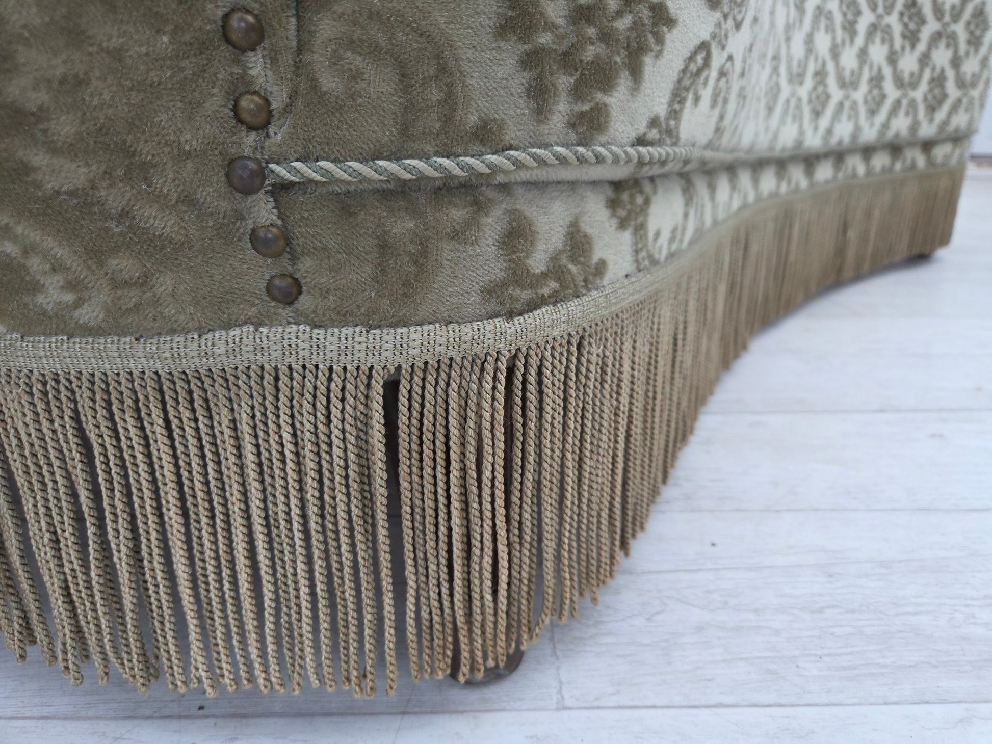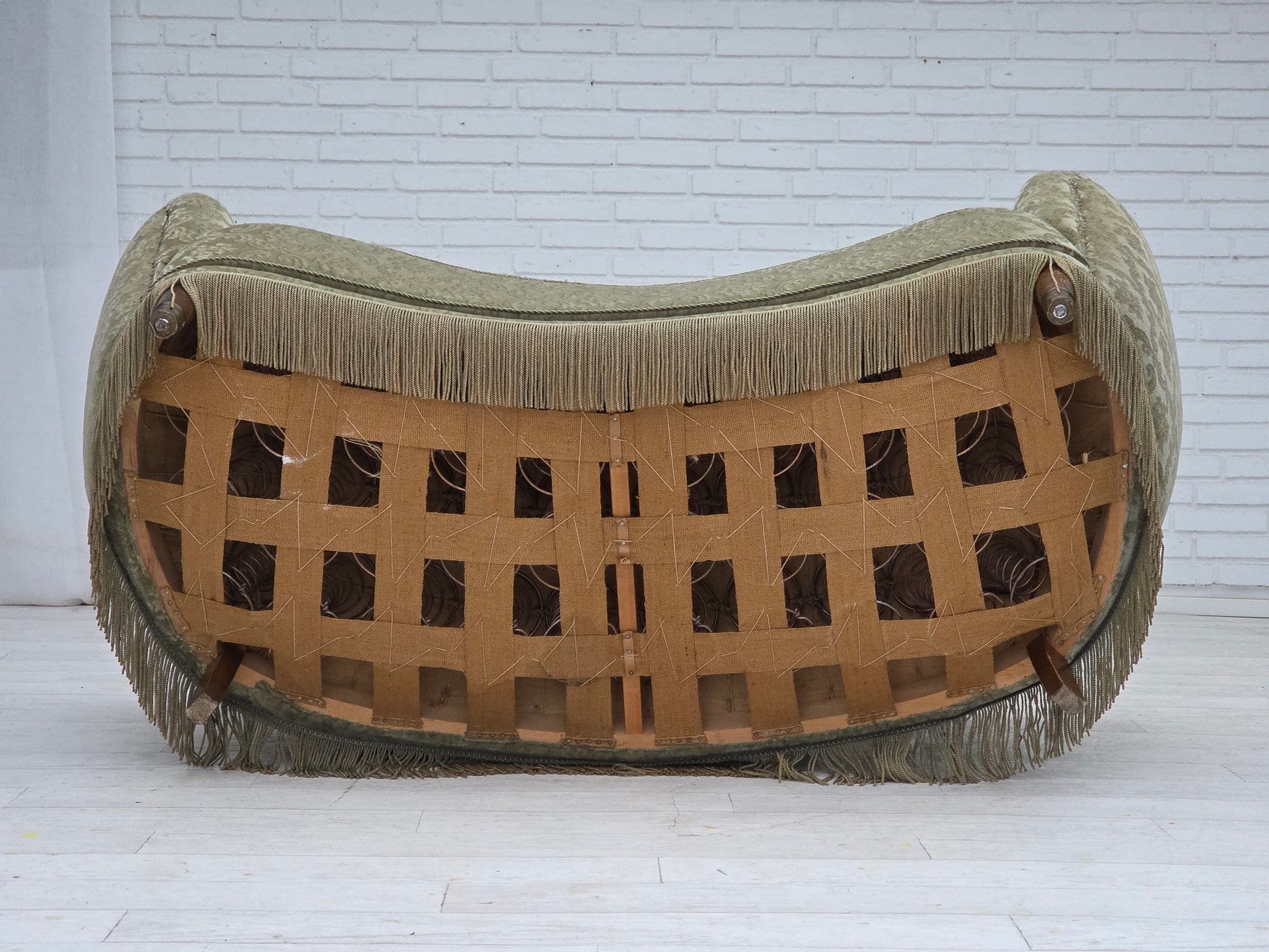 DESCRIPTION: 1960s, Danish 2-seater curved sofa. Original light green furniture velour, beech wood legs with brass plugs, brass springs. Original good condition: no smells, no stains and stable construction. Manufactured by Danish furniture maker in about 1960-65s. Original Scandinavian vintage design directly from Denmark. The sofa was checked by craftsman.