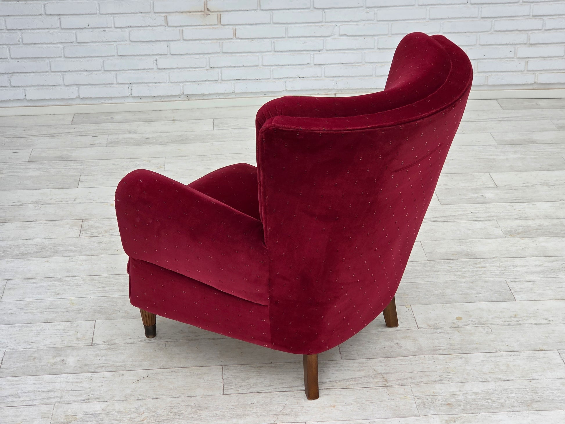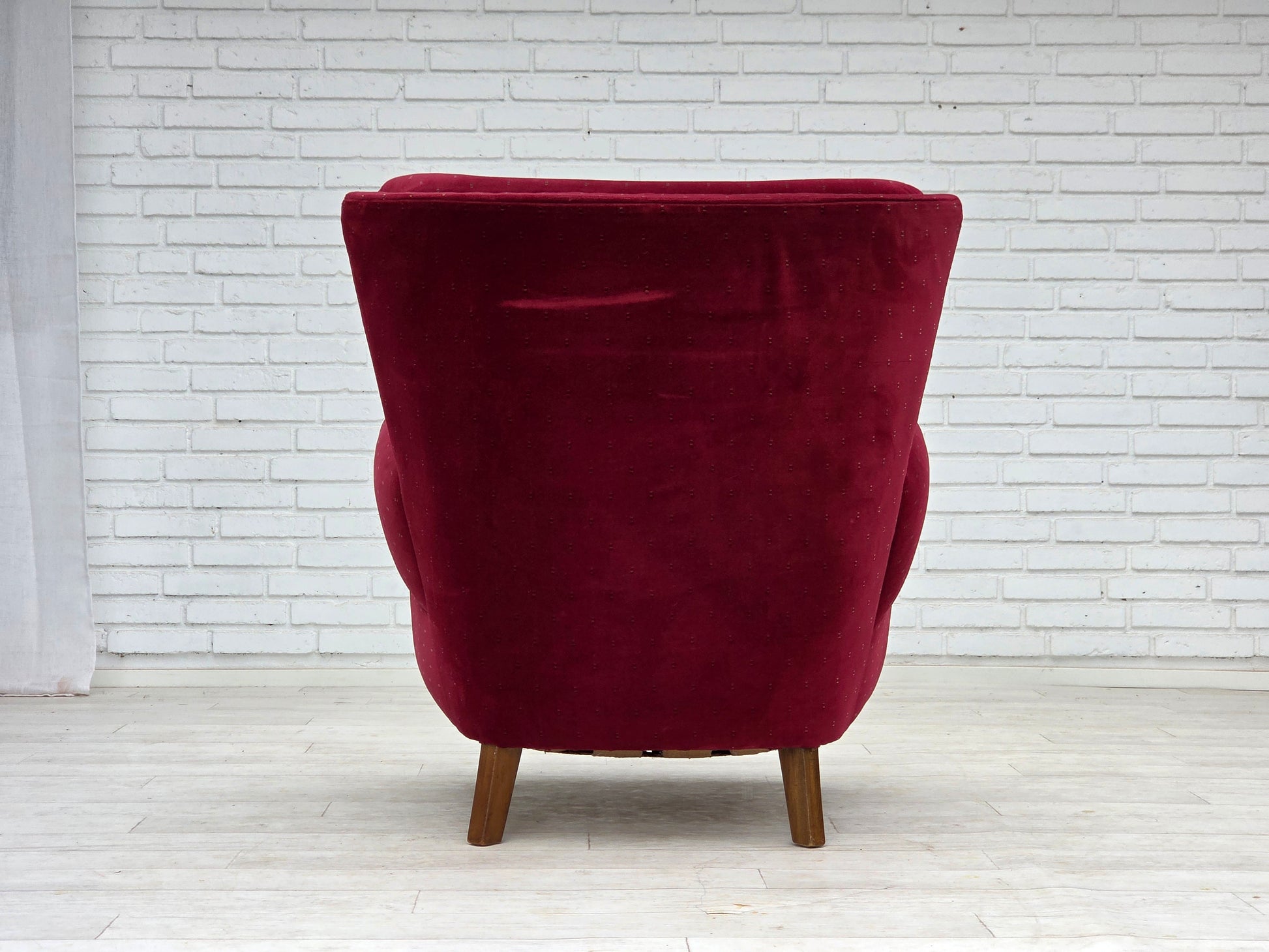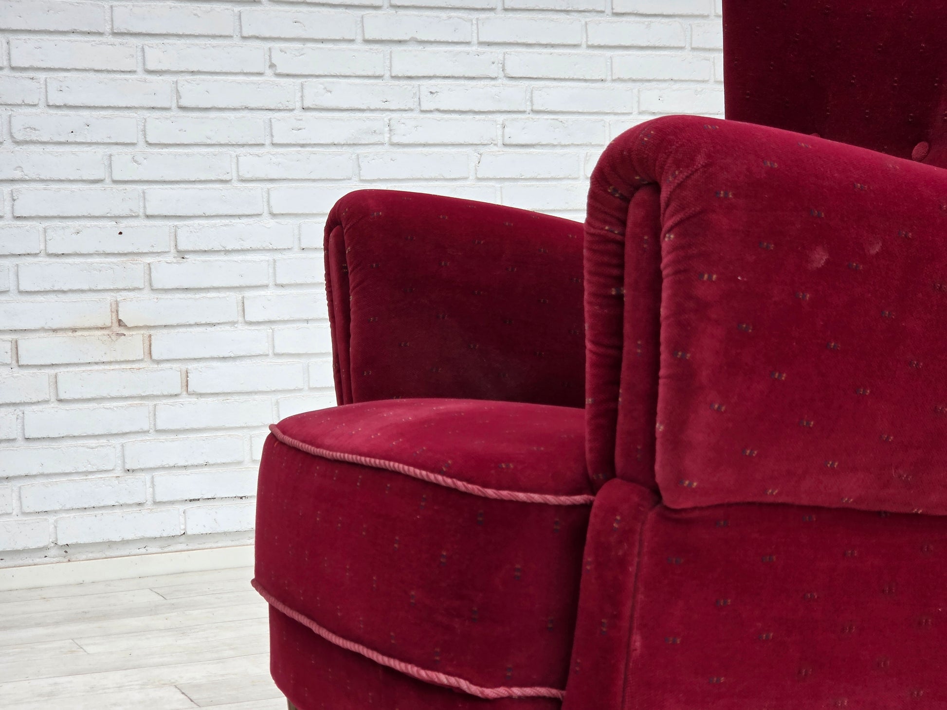 DESCRIPTION: 1960s, Danish armchair. Reupholstered by craftsman about 10-15 years ago. Very good condition: no smells, no stains and stable construction. Cherry-red furniture velour, beech wood legs with brass plugs, brass springs in the seat. Manufactured by Danish furniture maker in about 1960-65s. Original Scandinavian vintage design directly from Denmark. The chair was checked by craftsman.