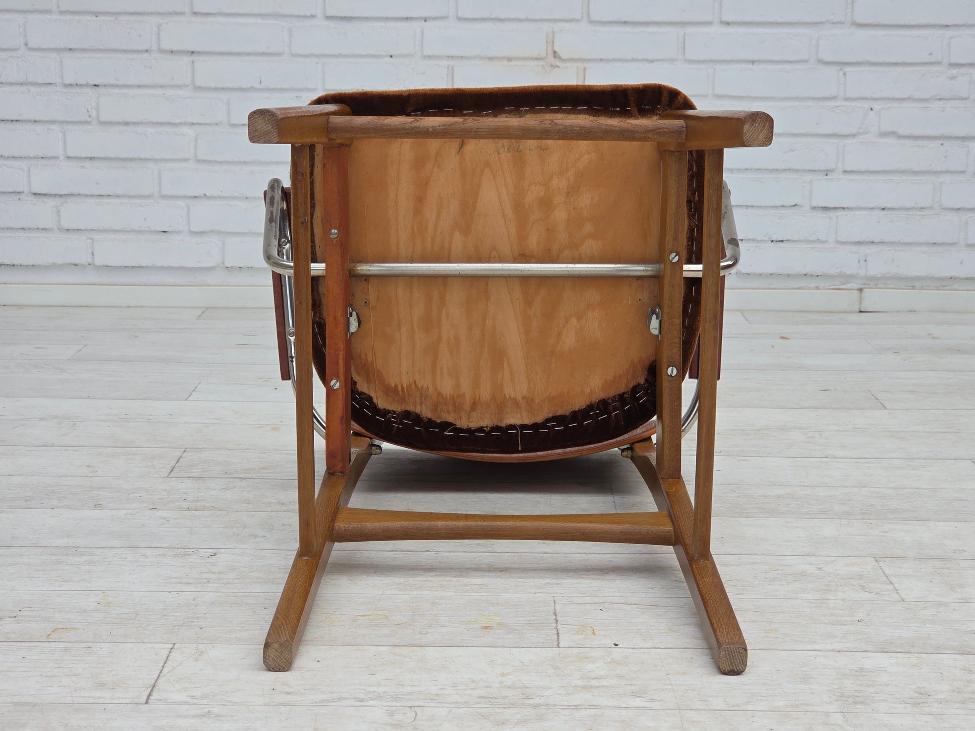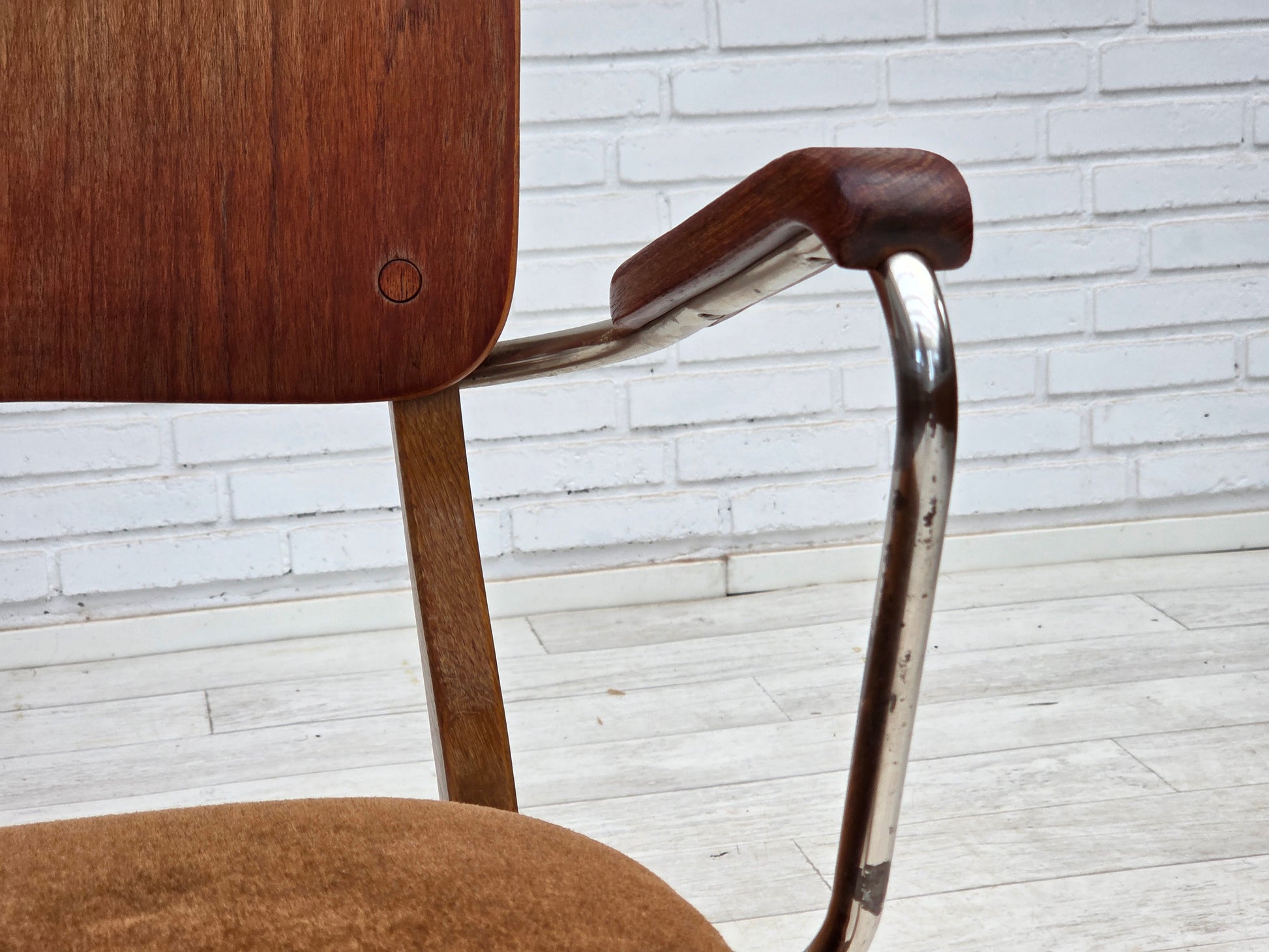 DESCRIPTION: 1960s, Danish armchair. Brown furniture velour, teak wood armrests, oak wood legs, chrome steel armrests. Original good condition: no smells, no stains and stable construction. Slight wear of chrome steel armrests. Manufactured by Danish furniture maker in about 1960-65s. Original Scandinavian vintage design directly from Denmark. The chair was checked by craftsman.