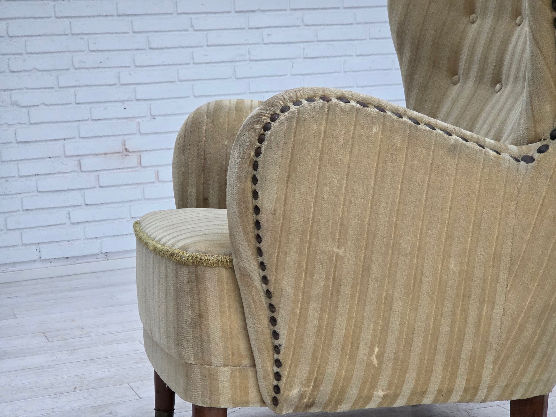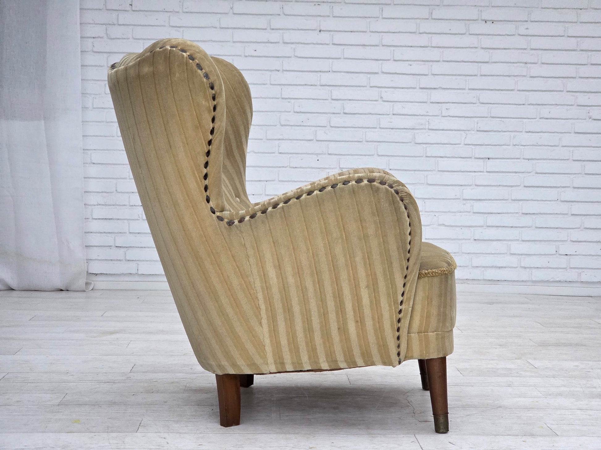 DESCRIPTION: 1960s, Danish armchair. Original light green furniture velour, beech wood legs with brass plugs, brass springs in the seat. Original good condition with patina: no smells, no stains and stable construction. Manufactured by Danish furniture maker in about 1960-65s. Original Scandinavian vintage design directly from Denmark. The chair was checked by craftsman.