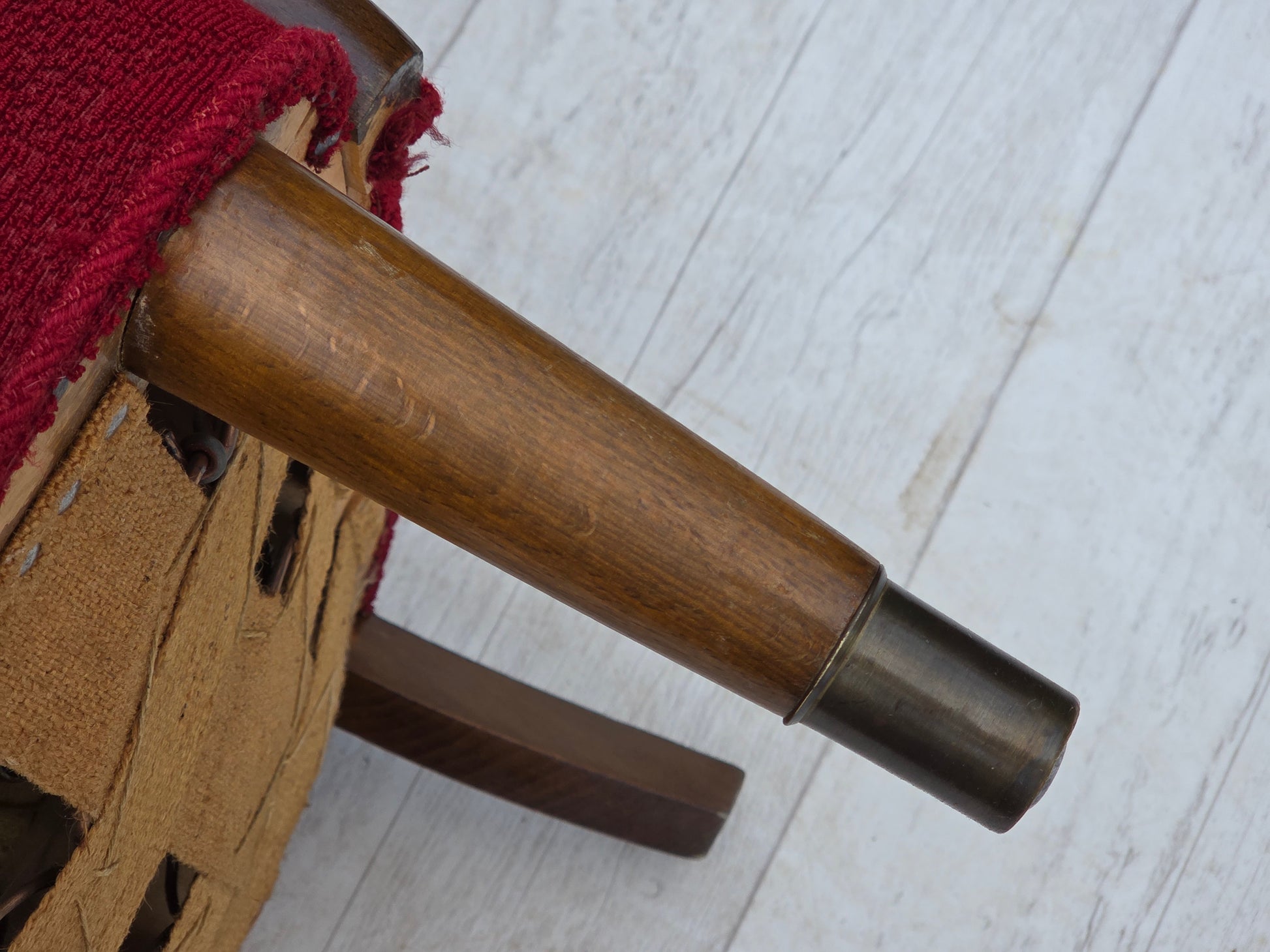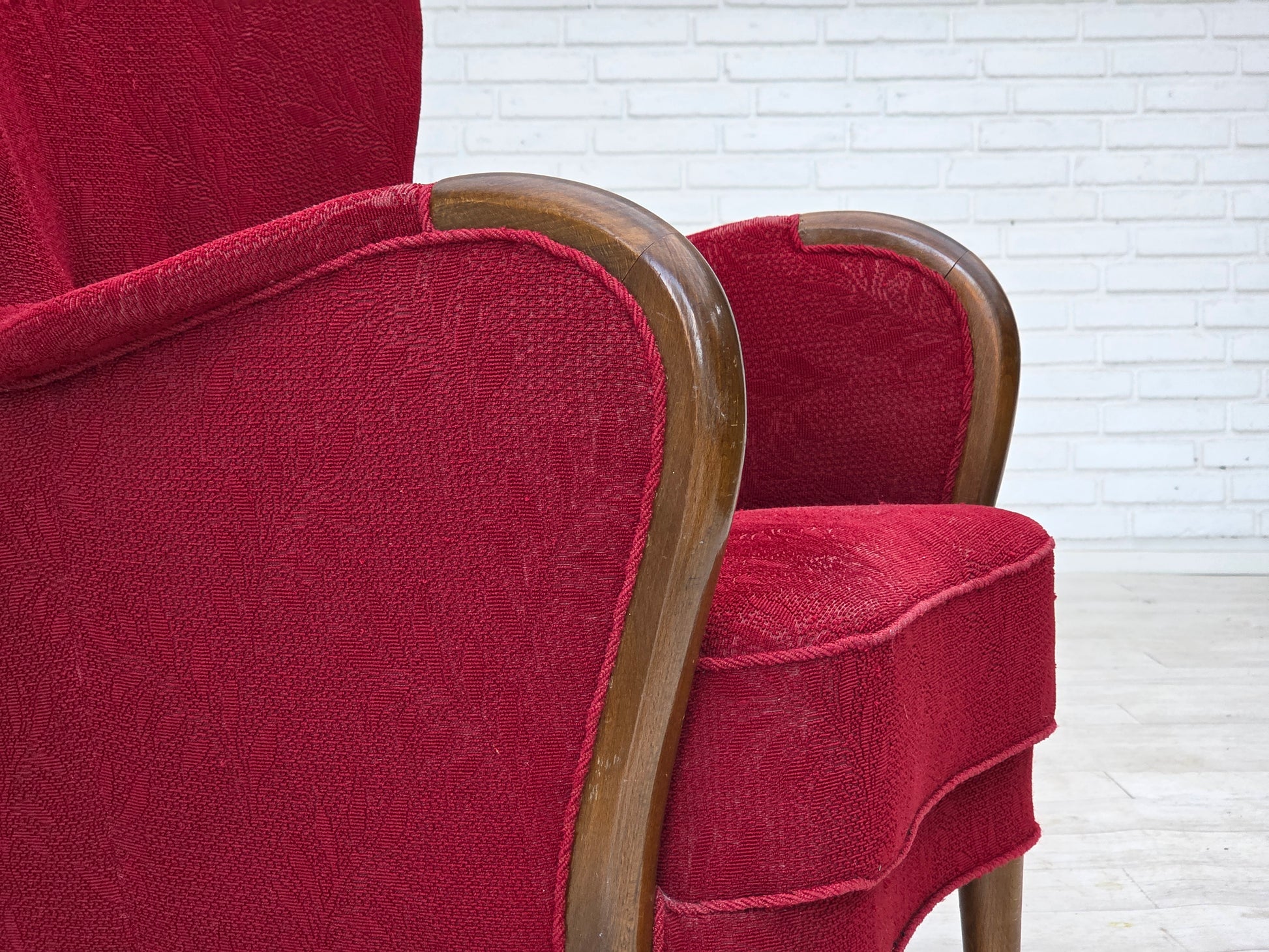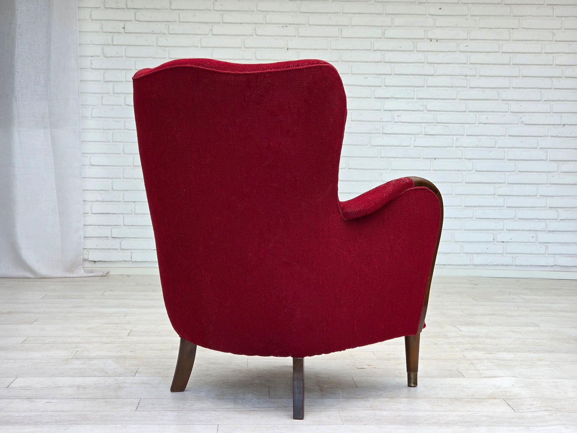 DESCRIPTION: 1960s, Danish armchair. Original good condition: no smells, no stains and stable construction. Original red furniture wool fabric, beech wood legs with brass plugs, brass springs in the seat. Slightly signs of wear on the armrests. Manufactured by Danish furniture maker in about 1955-60s. Original Scandinavian craftsmanship vintage design directly from Denmark. The chair was checked by craftsman.