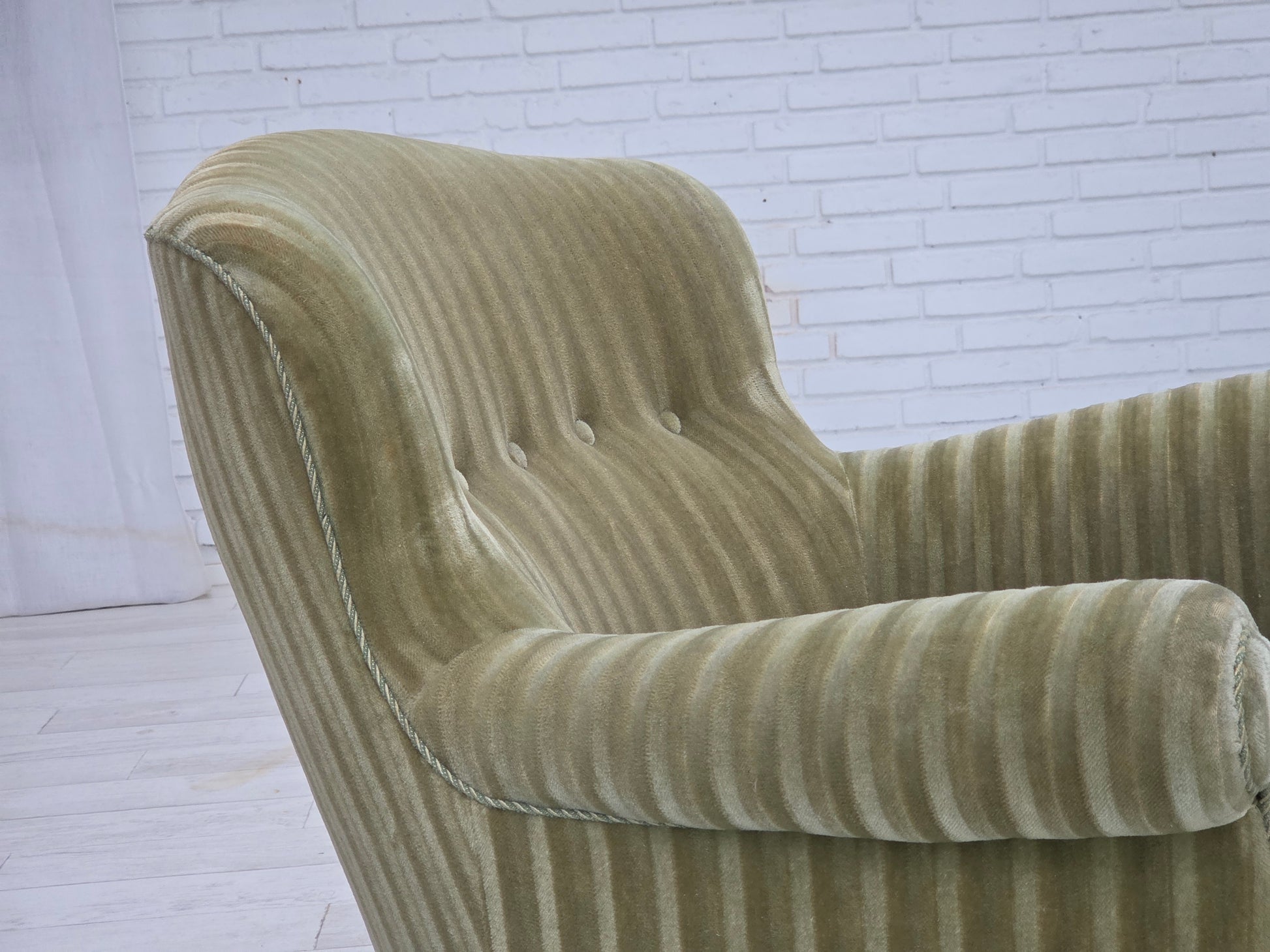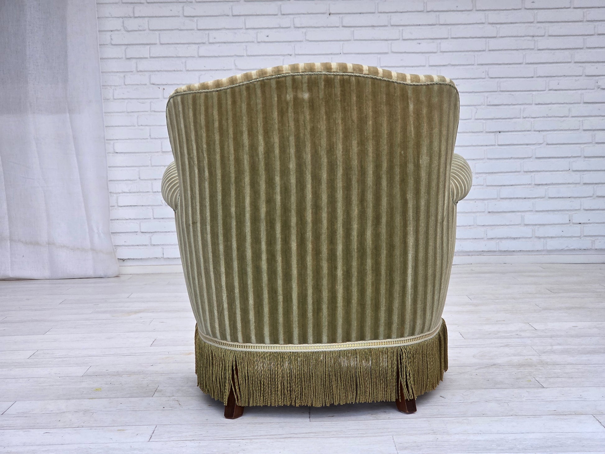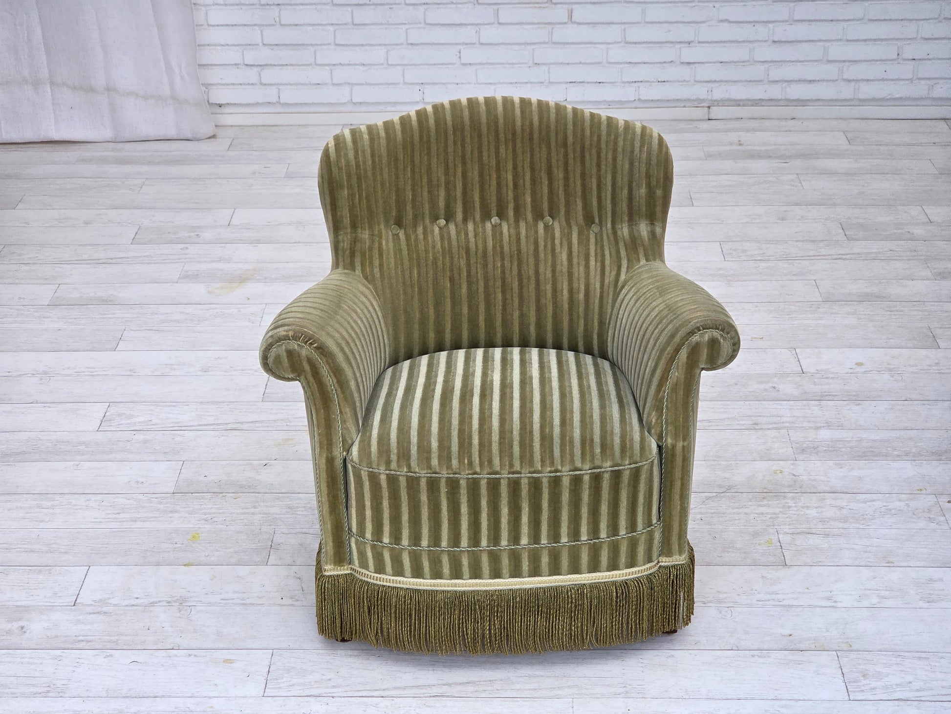 DESCRIPTION: 1960s, Danish armchair. Original striped furniture velour, beech wood legs, brass springs in the seat. Original good condition: no smells, no stains and stable construction. Manufactured by Danish furniture maker in about 1955-60s. Original Scandinavian vintage design directly from Denmark. The chair was checked by craftsman.