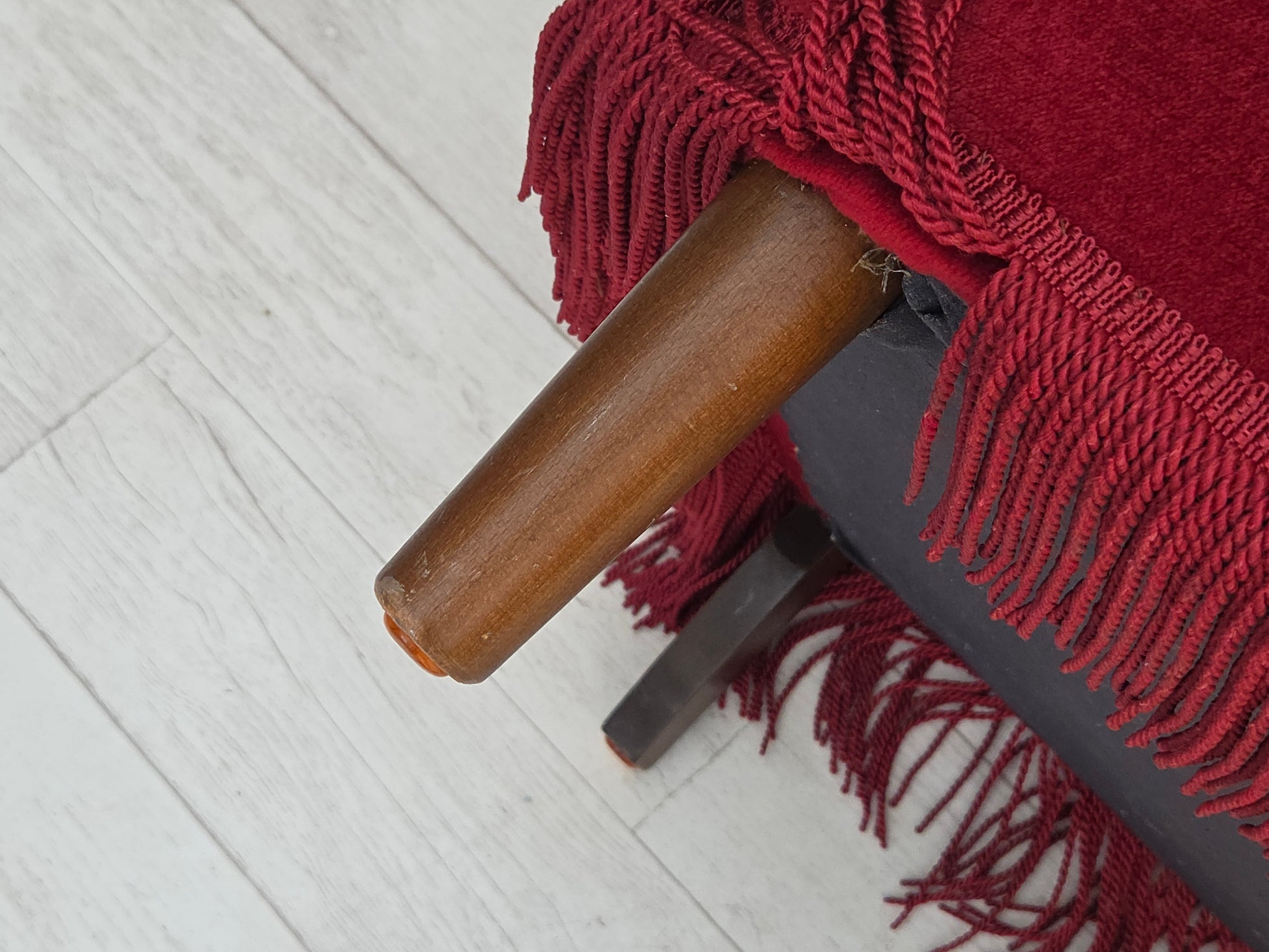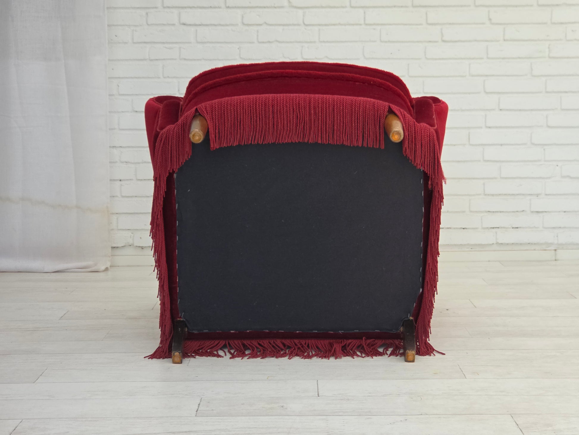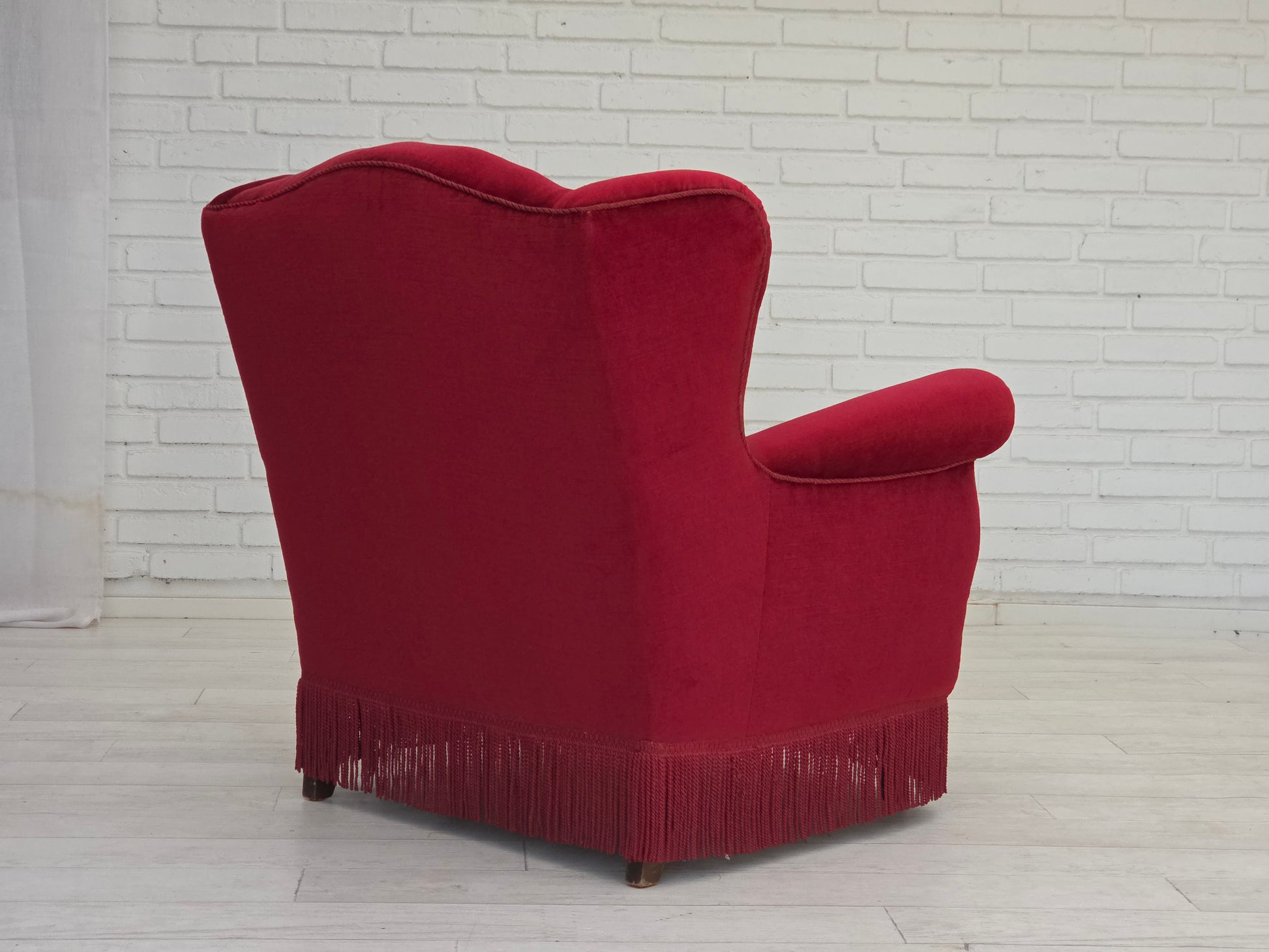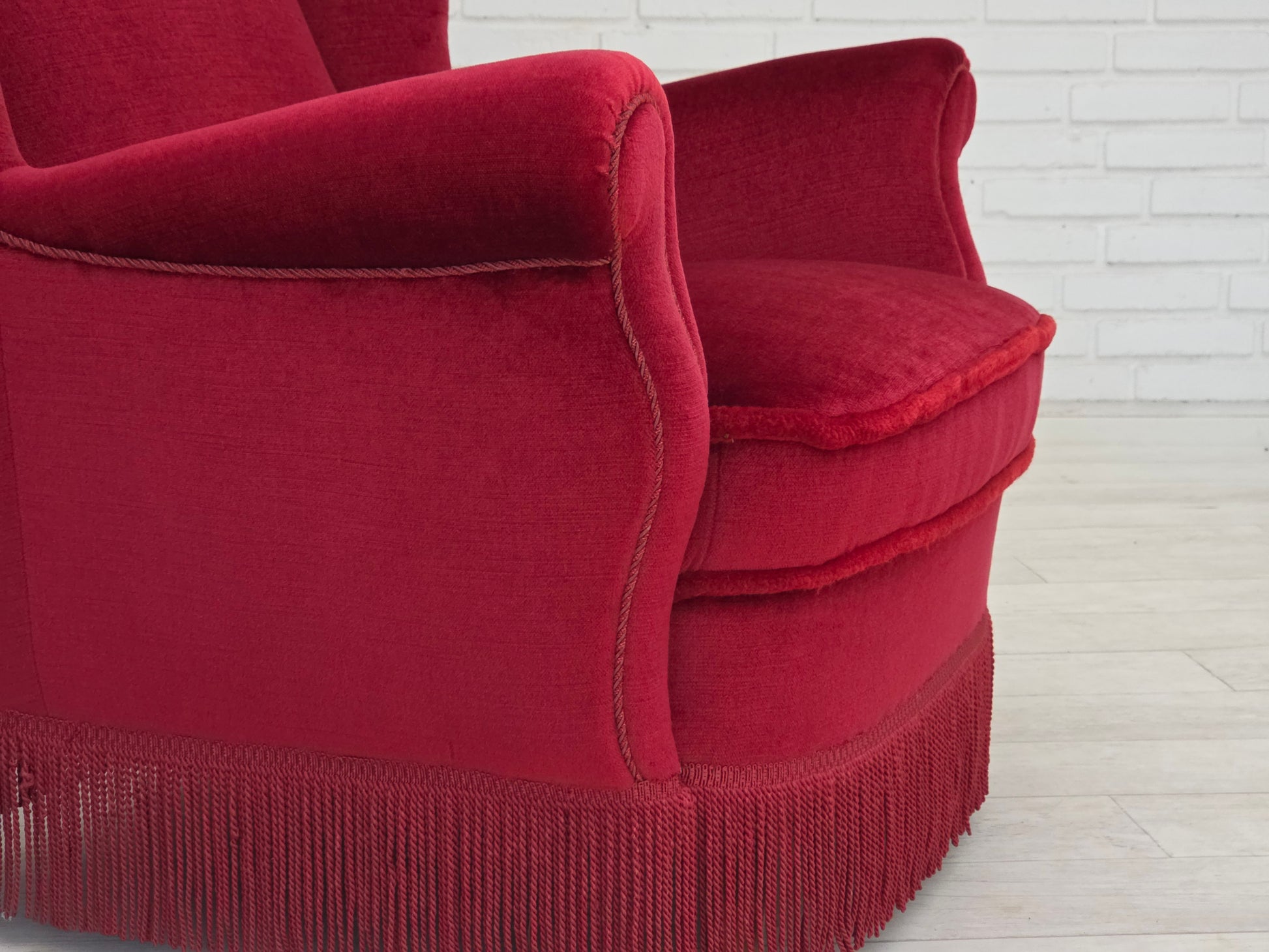 DESCRIPTION: 1960s, Danish armchair. Red furniture velour, beech wood legs and springs in the seat. The chair was reupholstered about 15 years ago by craftsman. Very good condition: no smells, no stains and stable construction. Manufactured by Danish furniture maker in about 1955-60s. Original Scandinavian vintage design directly from Denmark. The chair was checked by craftsman.