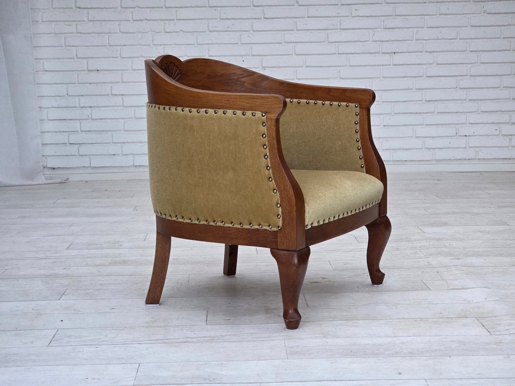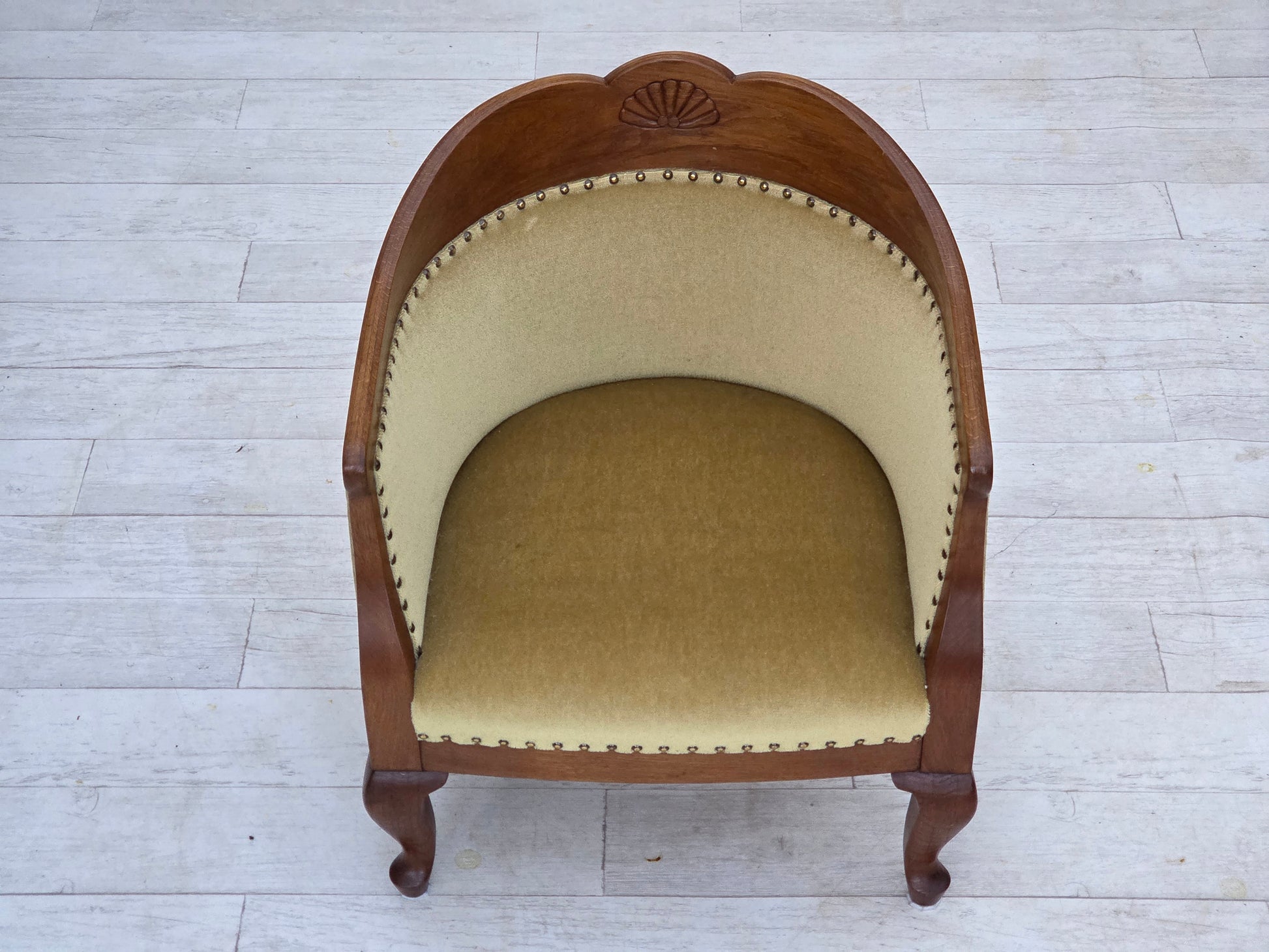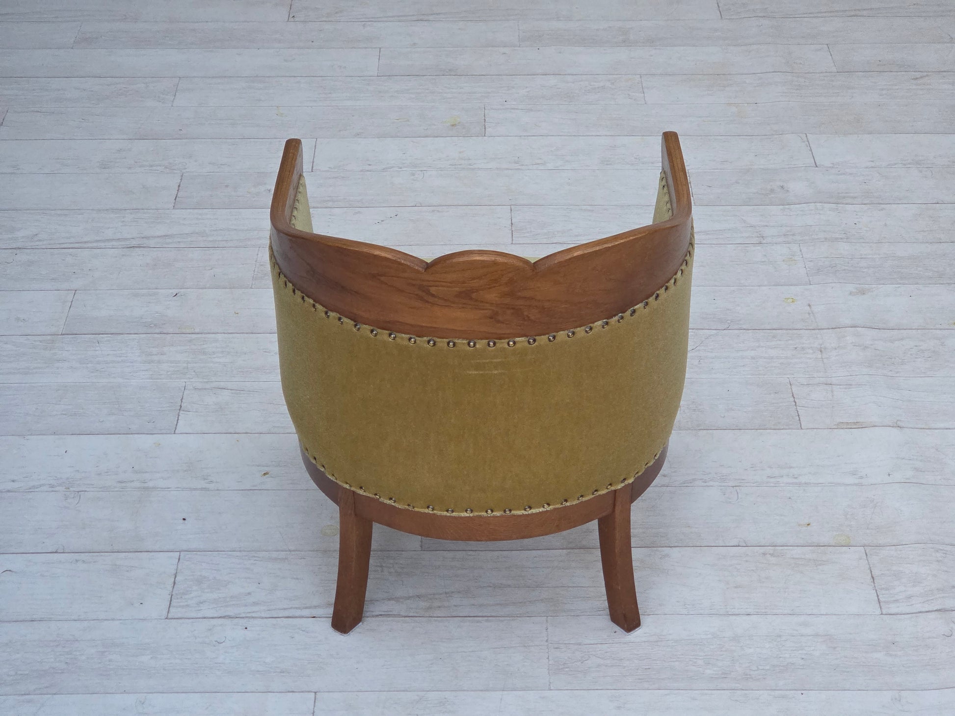DESCRIPTION: 1960s, Danish side/children's armchair. Light green furniture velour, oak wood, brass springs in the seat. Original very good condition: no smells, no stains and stable construction. Manufactured by Danish furniture maker in about 1960-65s. Original Scandinavian craftsmanship vintage design directly from Denmark. The chair was checked by craftsman.