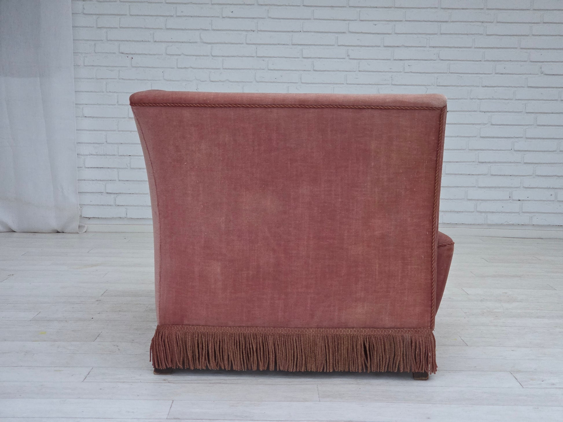 DESCRIPTION: 1970s, Danish 2-seater sofa. Original salmon pink furniture velour, ash wood legs, springs in the seat. Original good condition: no smells, no stains and stable construction. Manufactured by Danish furniture maker in about 1970-75s. Original Scandinavian vintage design directly from Denmark. The sofa was checked by craftsman.