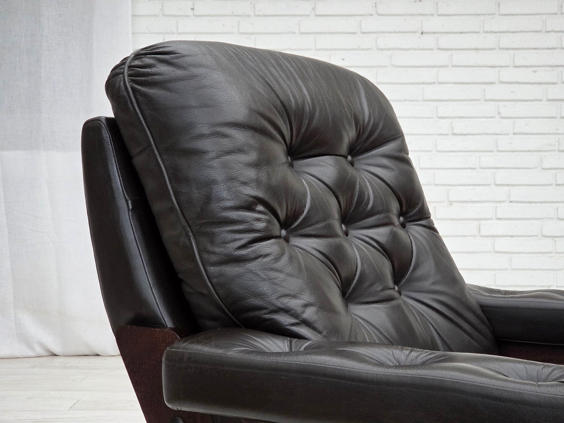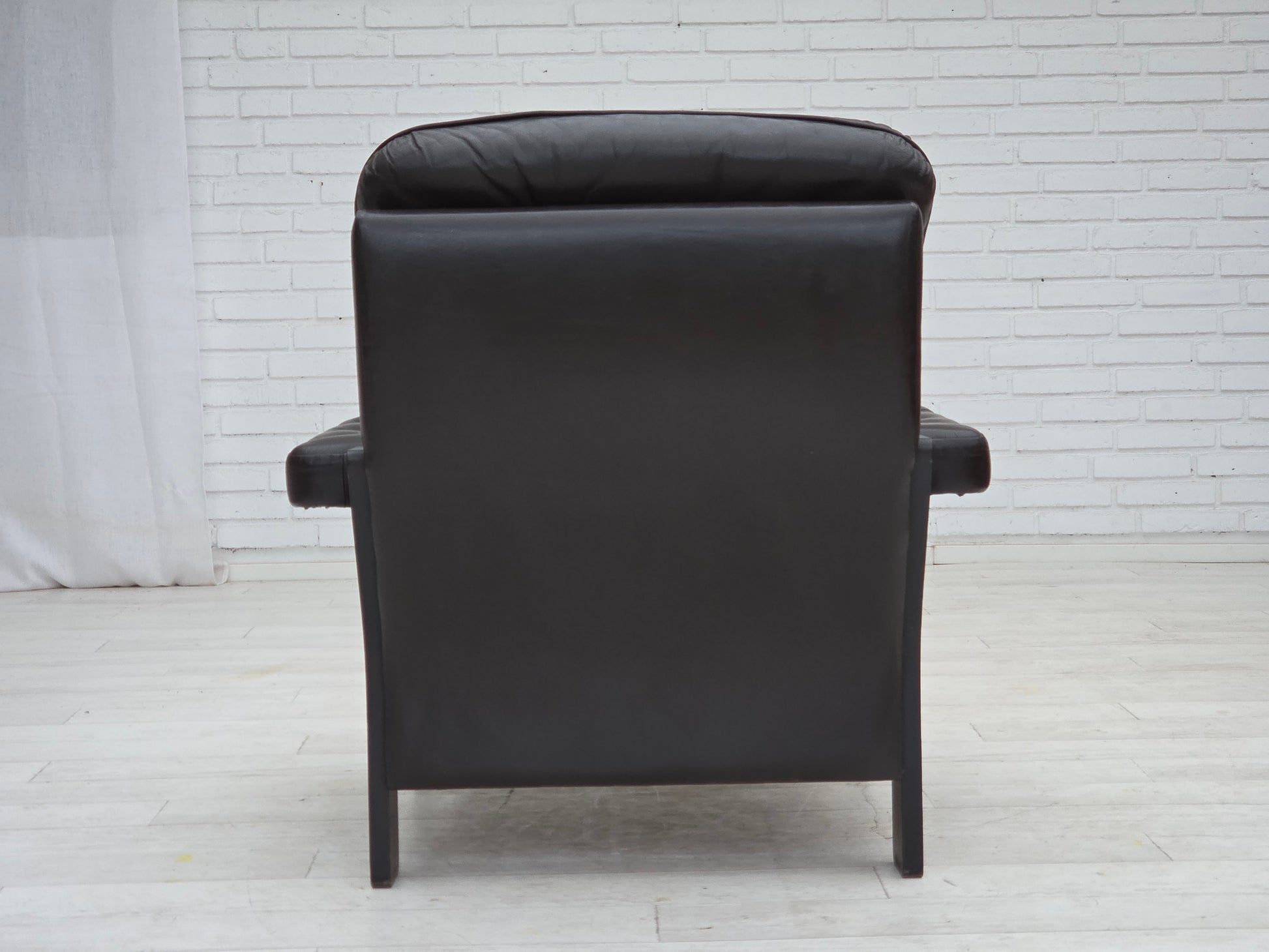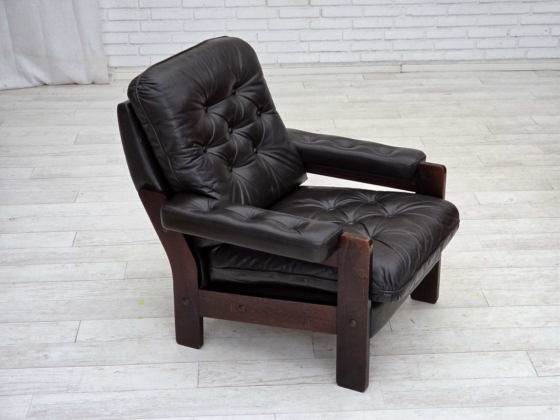 DESCRIPTION: 1970s, Danish armchair. Brown furniture leather, oak wood. Original good condition: no smells, no stains and stable construction. Manufactured by Danish furniture maker in about 1970-75s. Original Scandinavian vintage design directly from Denmark. The chair was checked by craftsman.