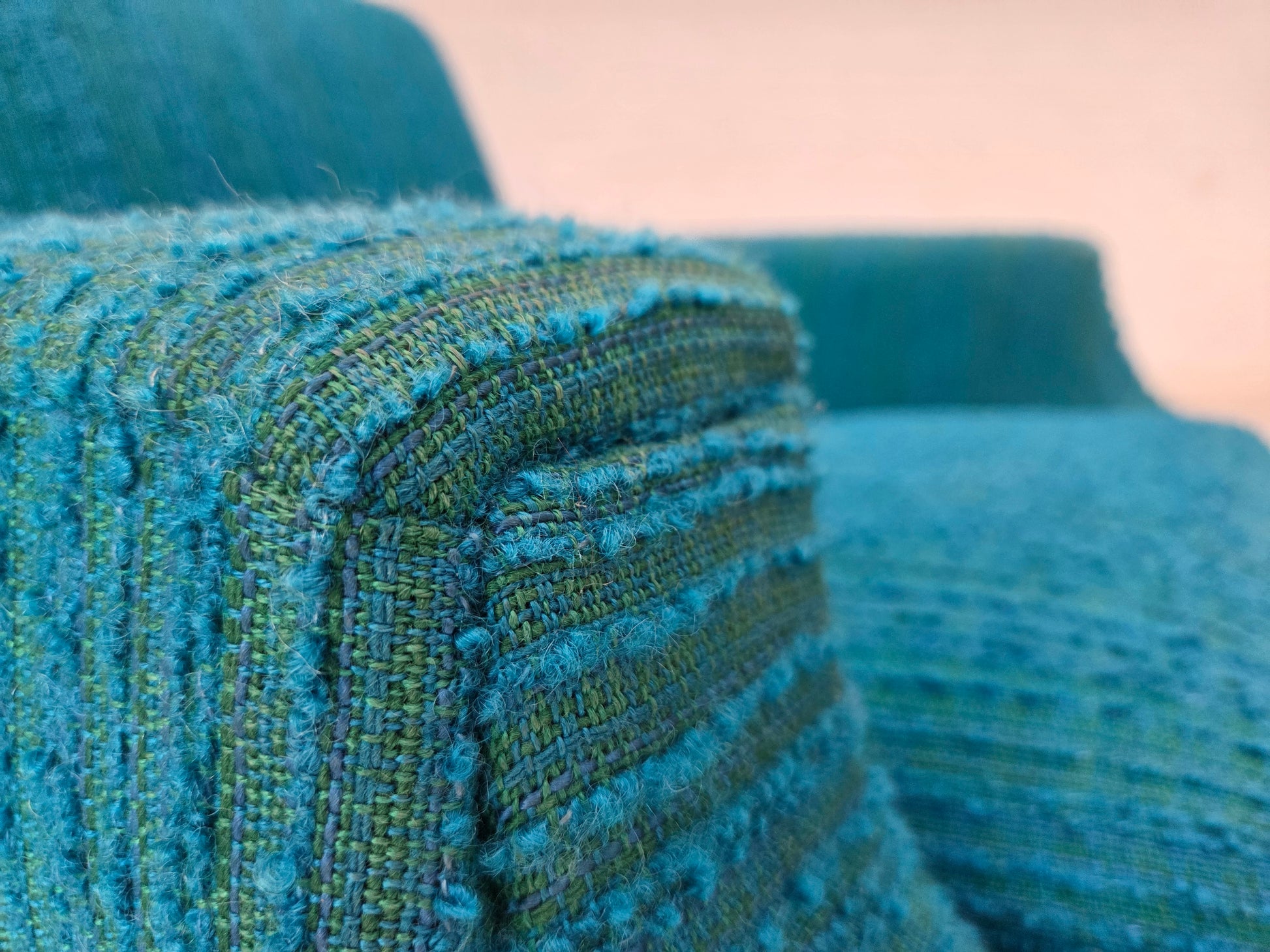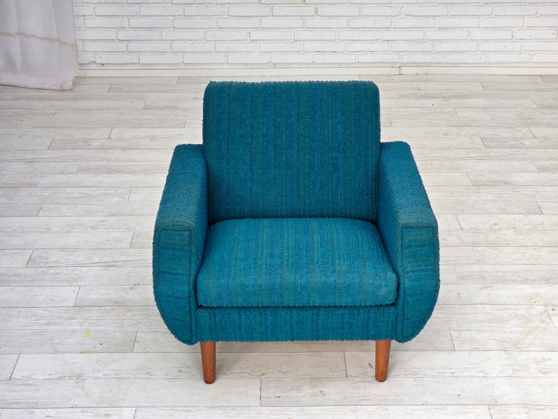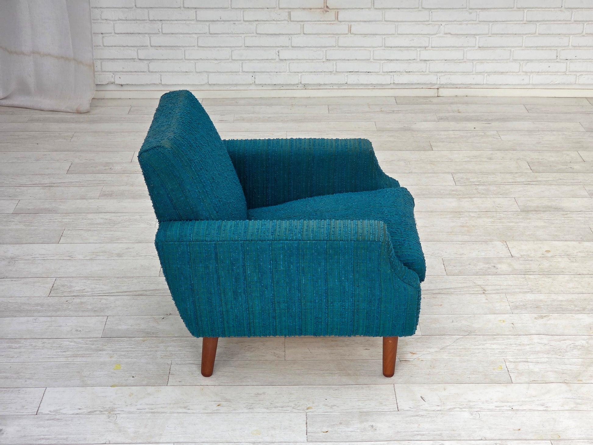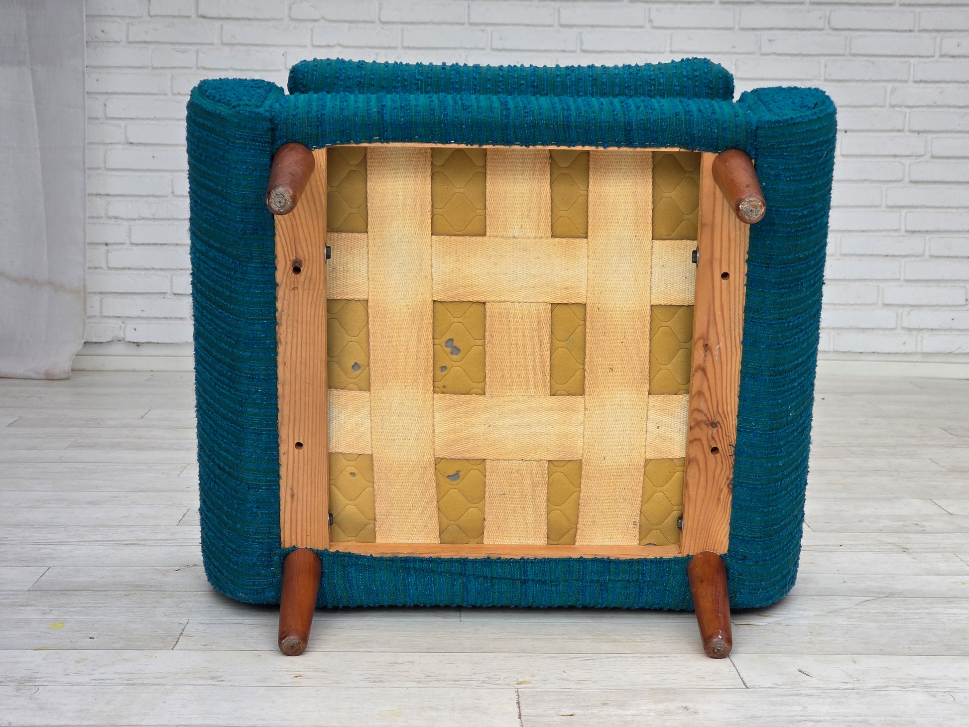DESCRIPTION: 1970s, Danish armchair. Original blue/green furniture wool, teak wood legs, springs in the seat cushions. Original good condition: no smells, no stains and stable construction. Manufactured by Danish furniture maker in about 1970-75s. Original Scandinavian vintage design directly from Denmark. The chairs were checked by craftsman.