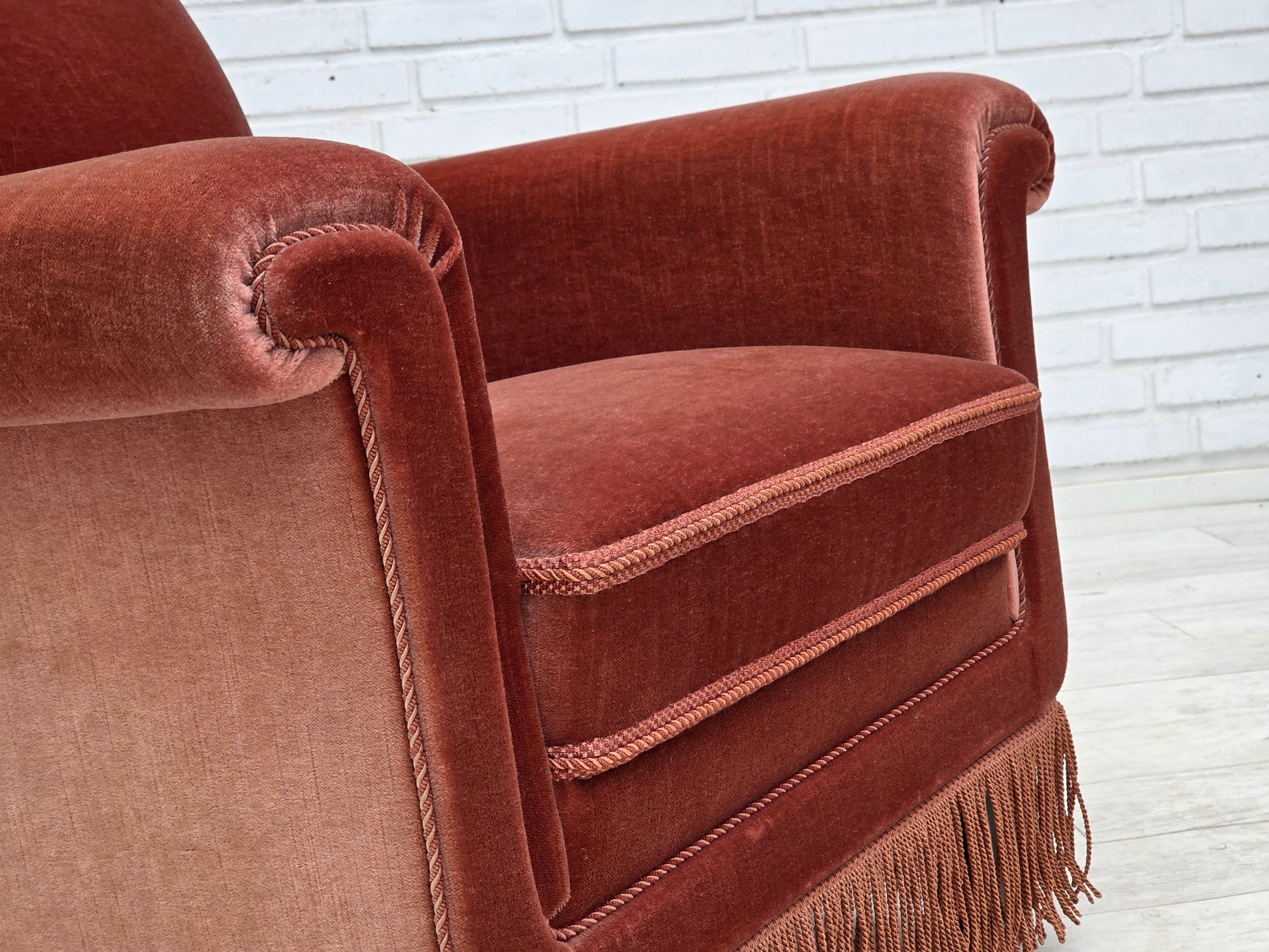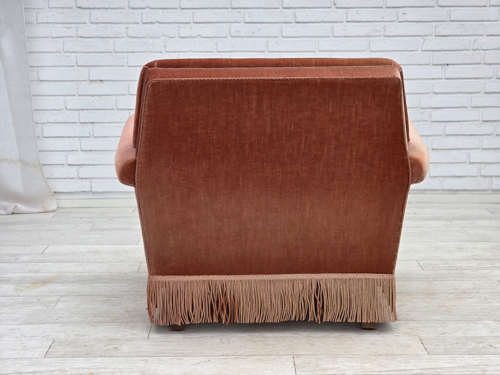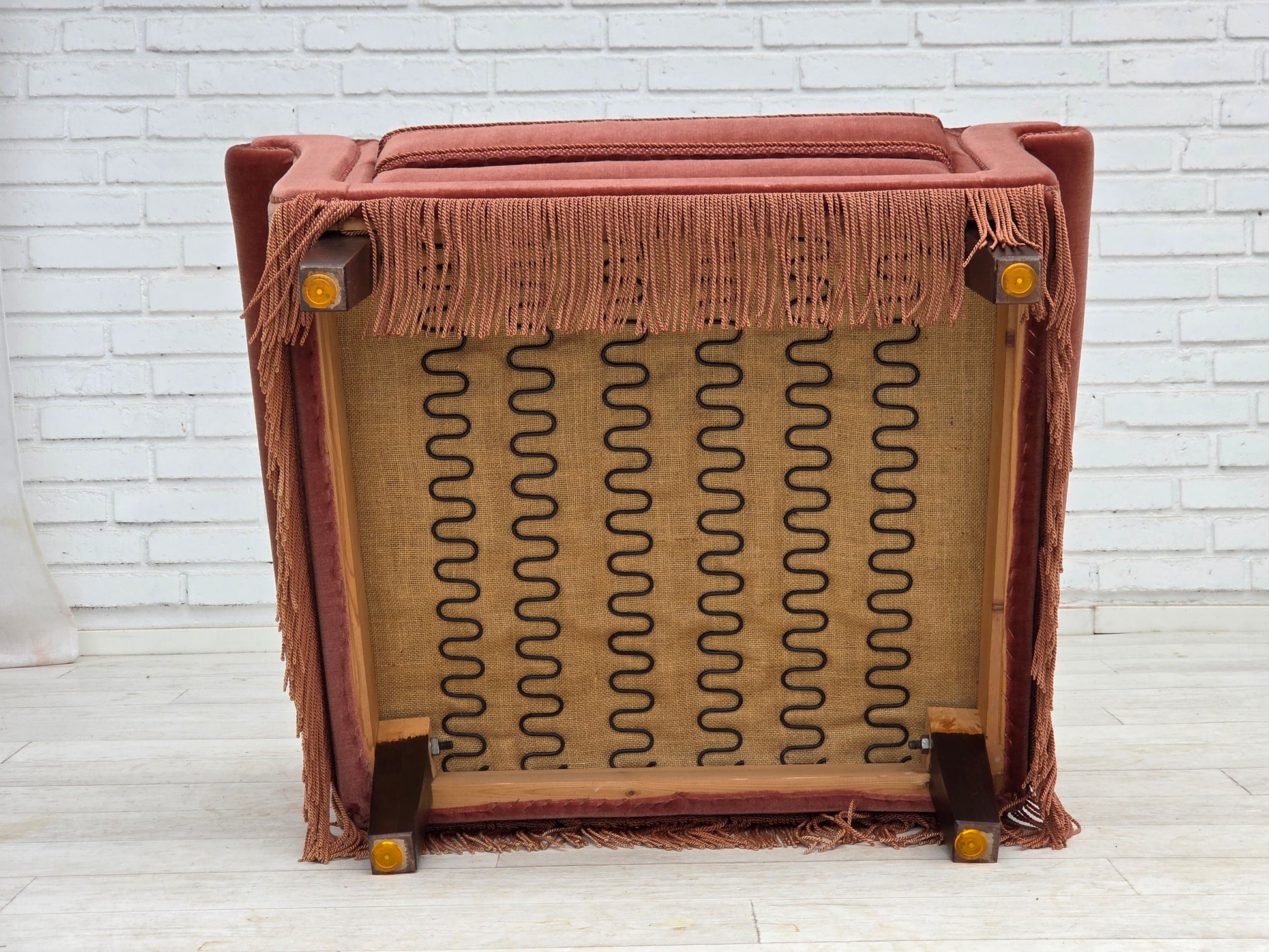DESCRIPTION: 1970s, Danish armchair. Salmon pink furniture velour, beech wood legs, springs in the seat. Original very good condition: no smells, no stains and stable construction. Manufactured by Danish furniture maker in about 1970-75s. Original Scandinavian vintage design directly from Denmark. The chair was checked by craftsman.