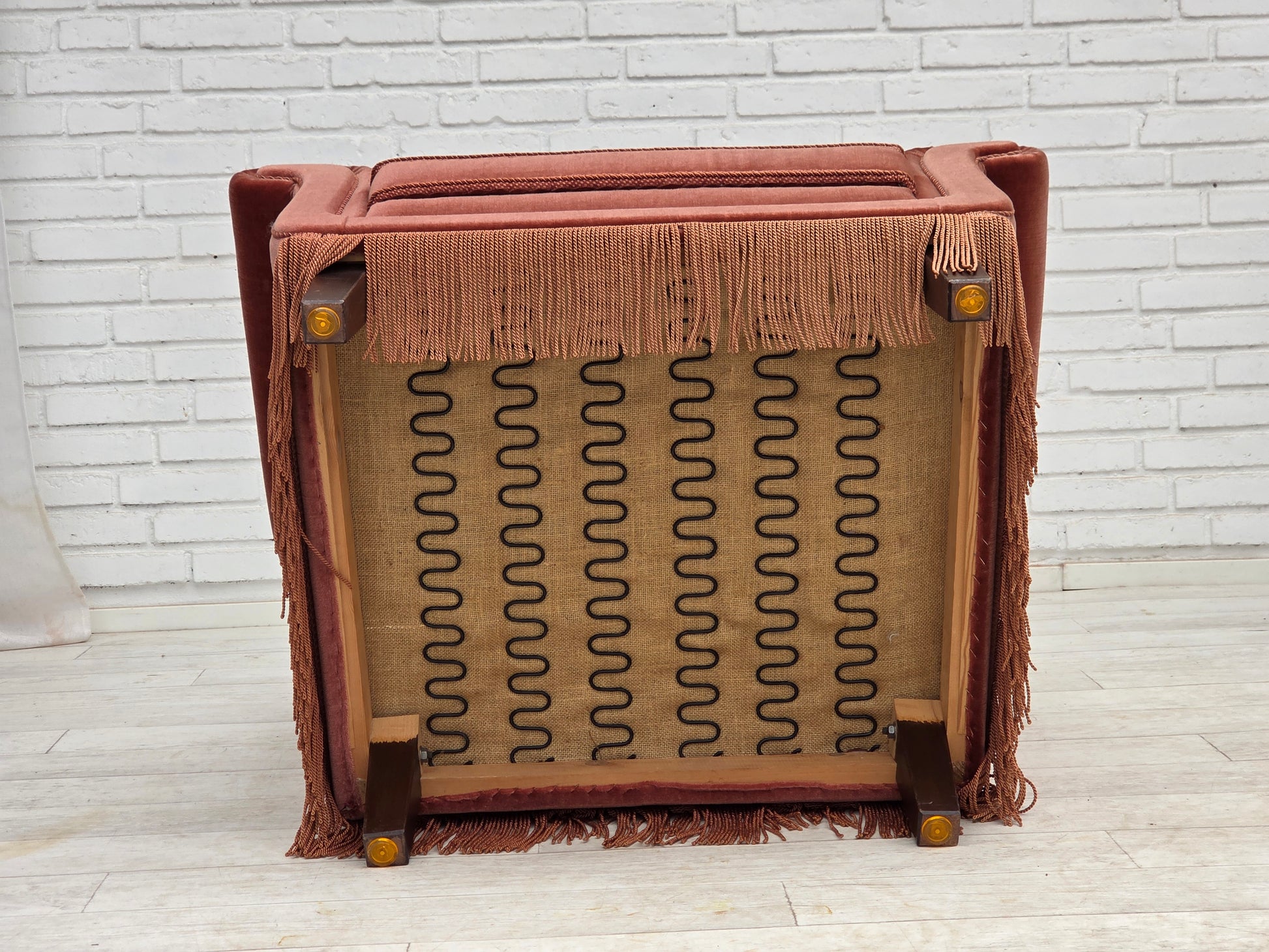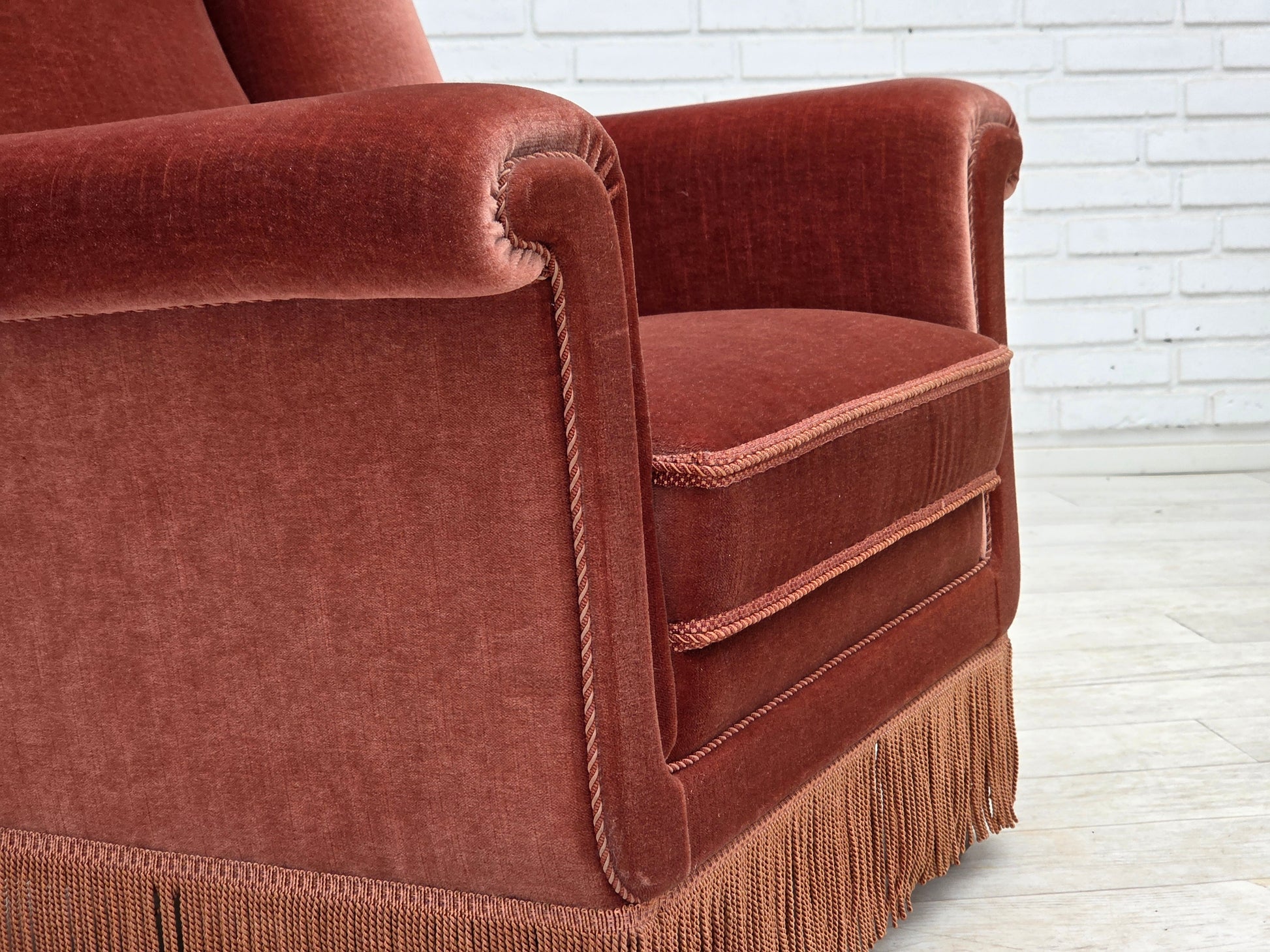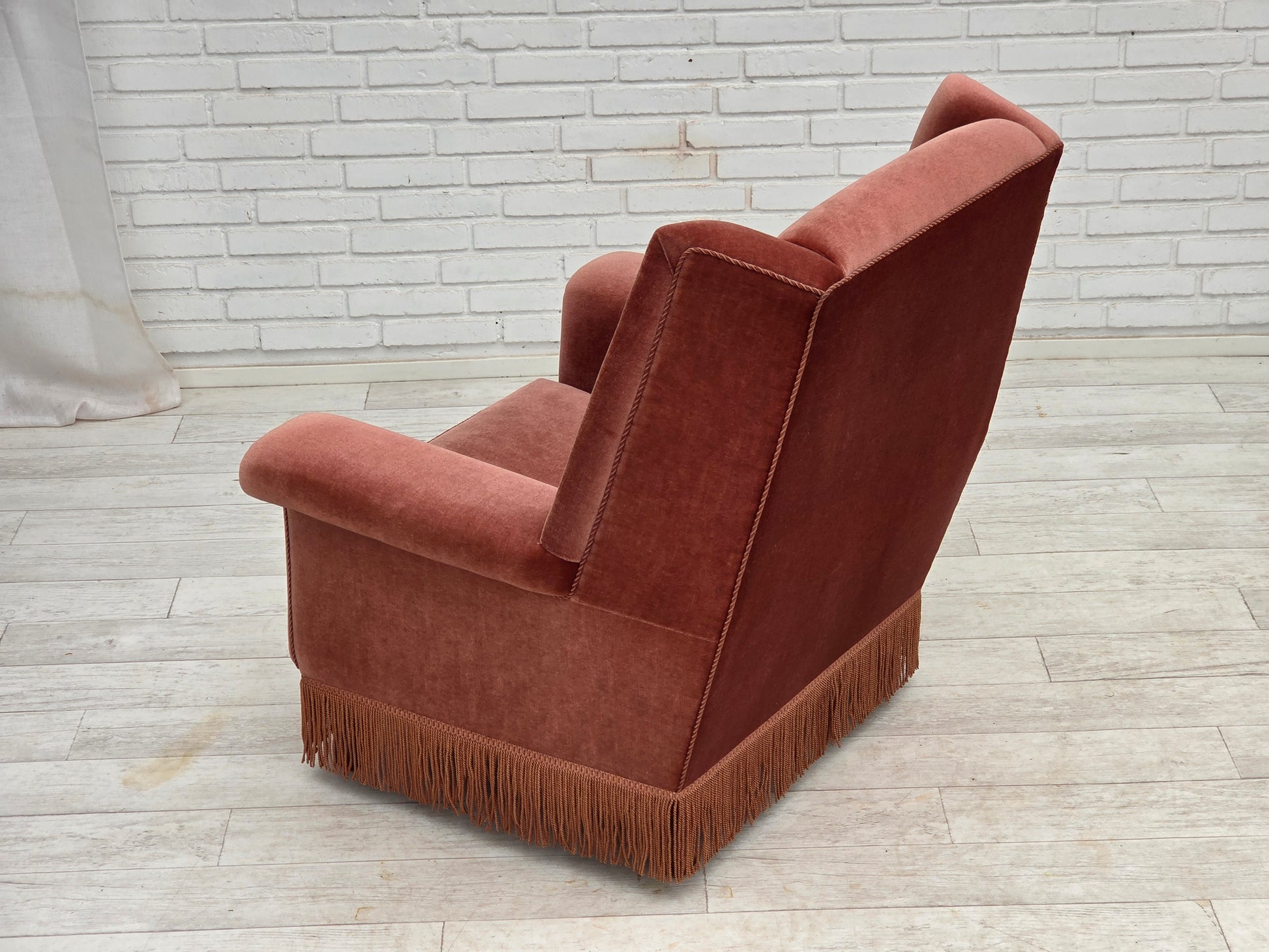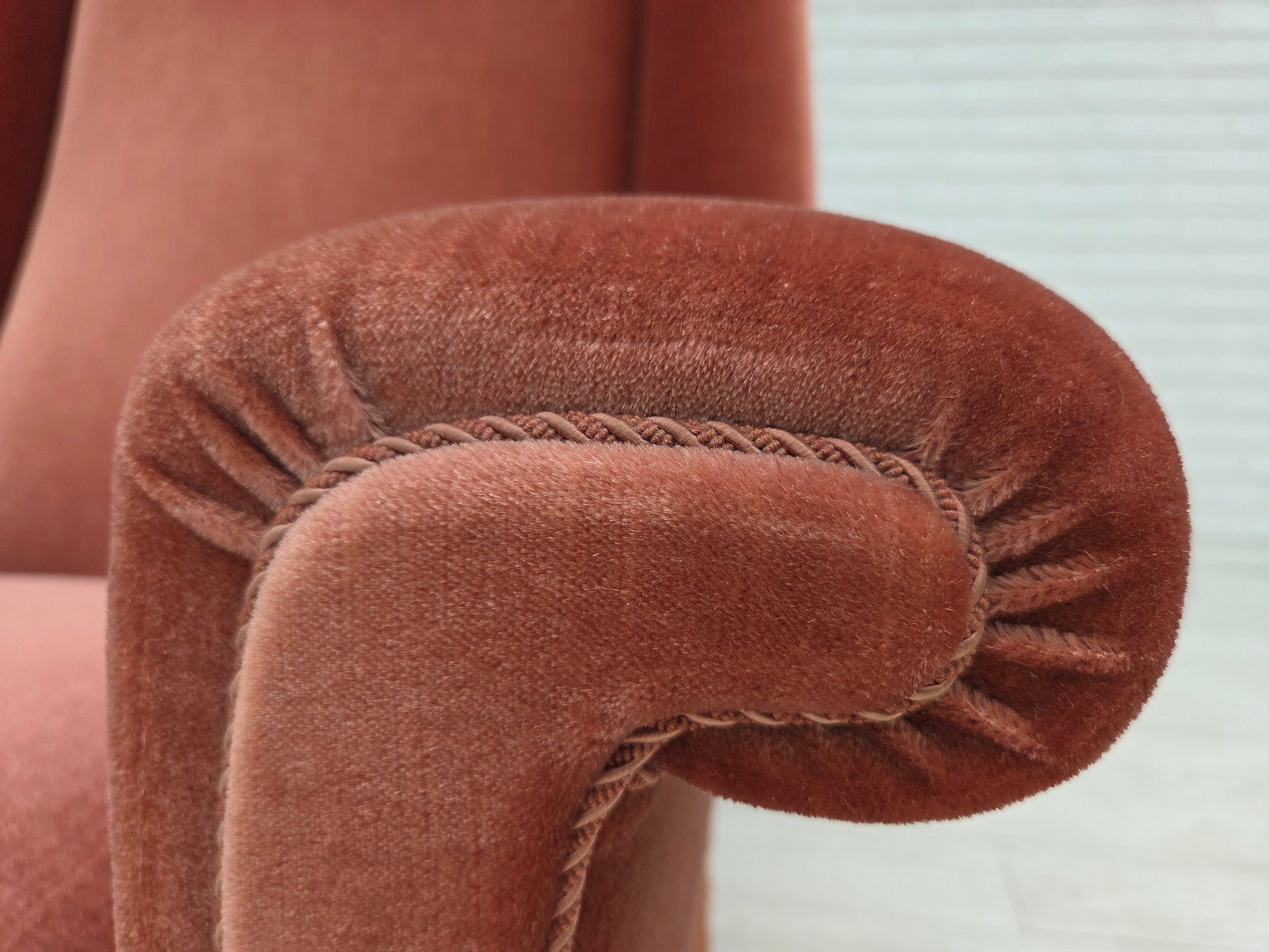 DESCRIPTION: 1970s, Danish highback armchair. Salmon pink furniture velour, beech wood legs, springs in the seat. Original very good condition: no smells, no stains and stable construction. Manufactured by Danish furniture maker in about 1970-75s. Original Scandinavian vintage design directly from Denmark. The chair was checked by craftsman.