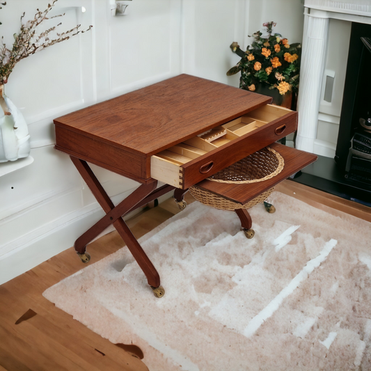 Table à coudre vintage danoise des années 1960, bois de teck, rotin.