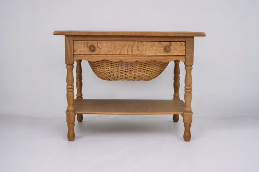 Commode à couture danoise des années 1970, bois de chêne massif, rotin.