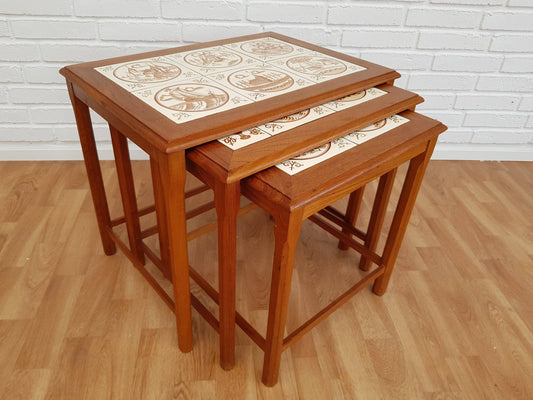 Années 1970, table gigogne, design danois, carreaux de céramique peints à la main, bois de teck.