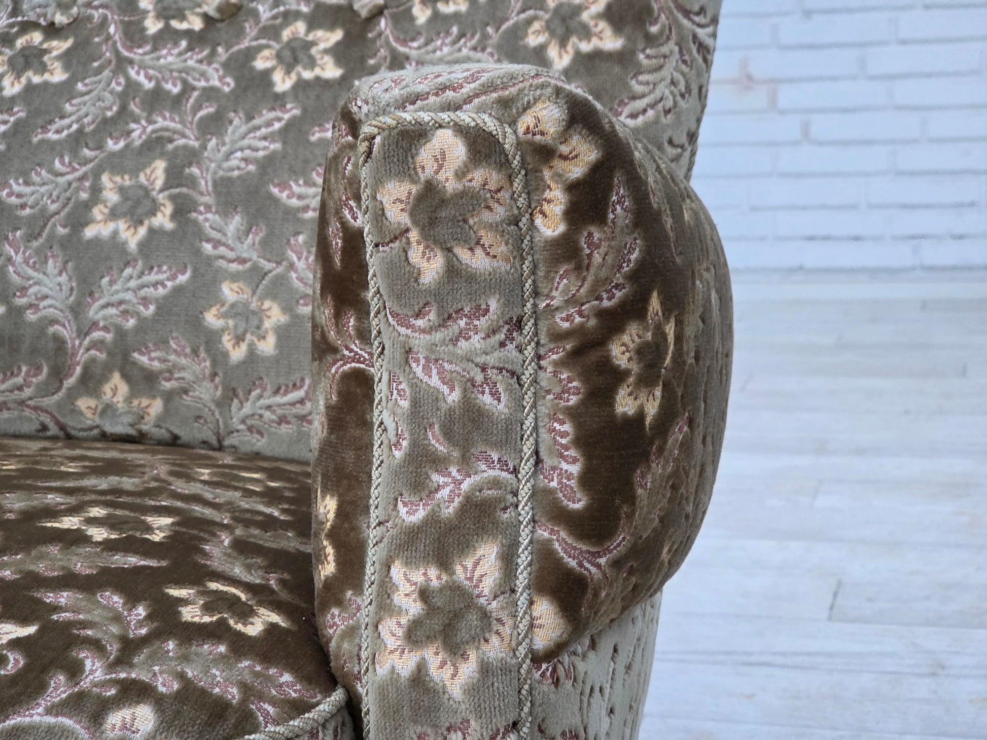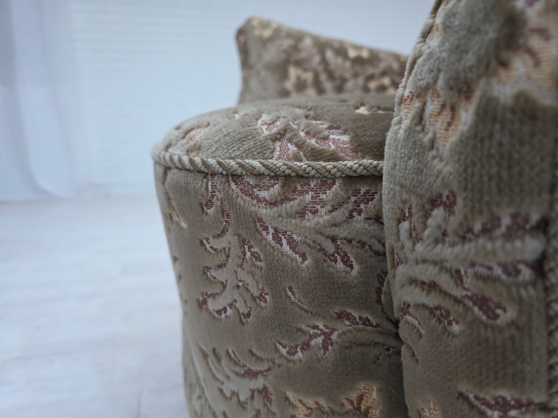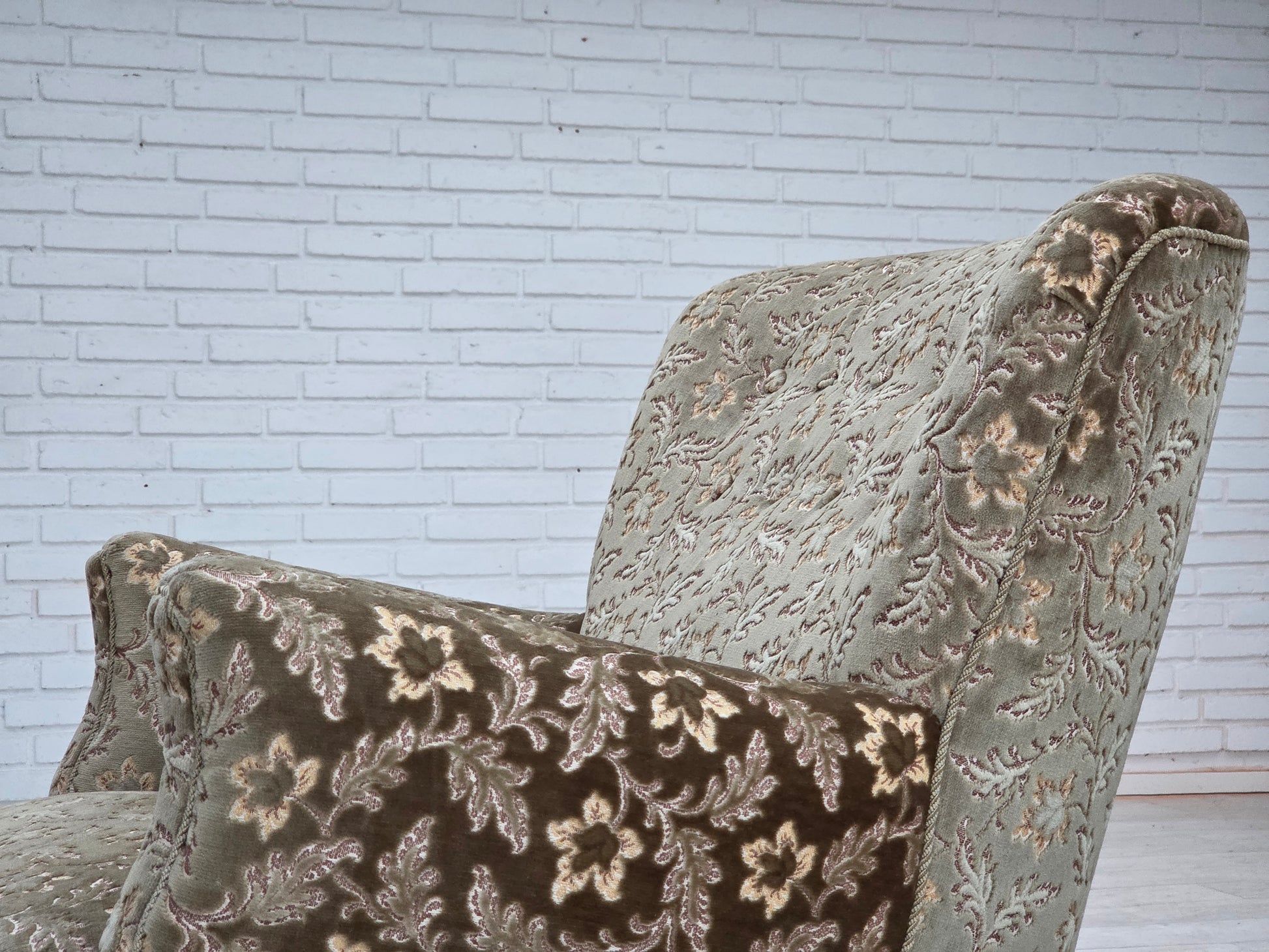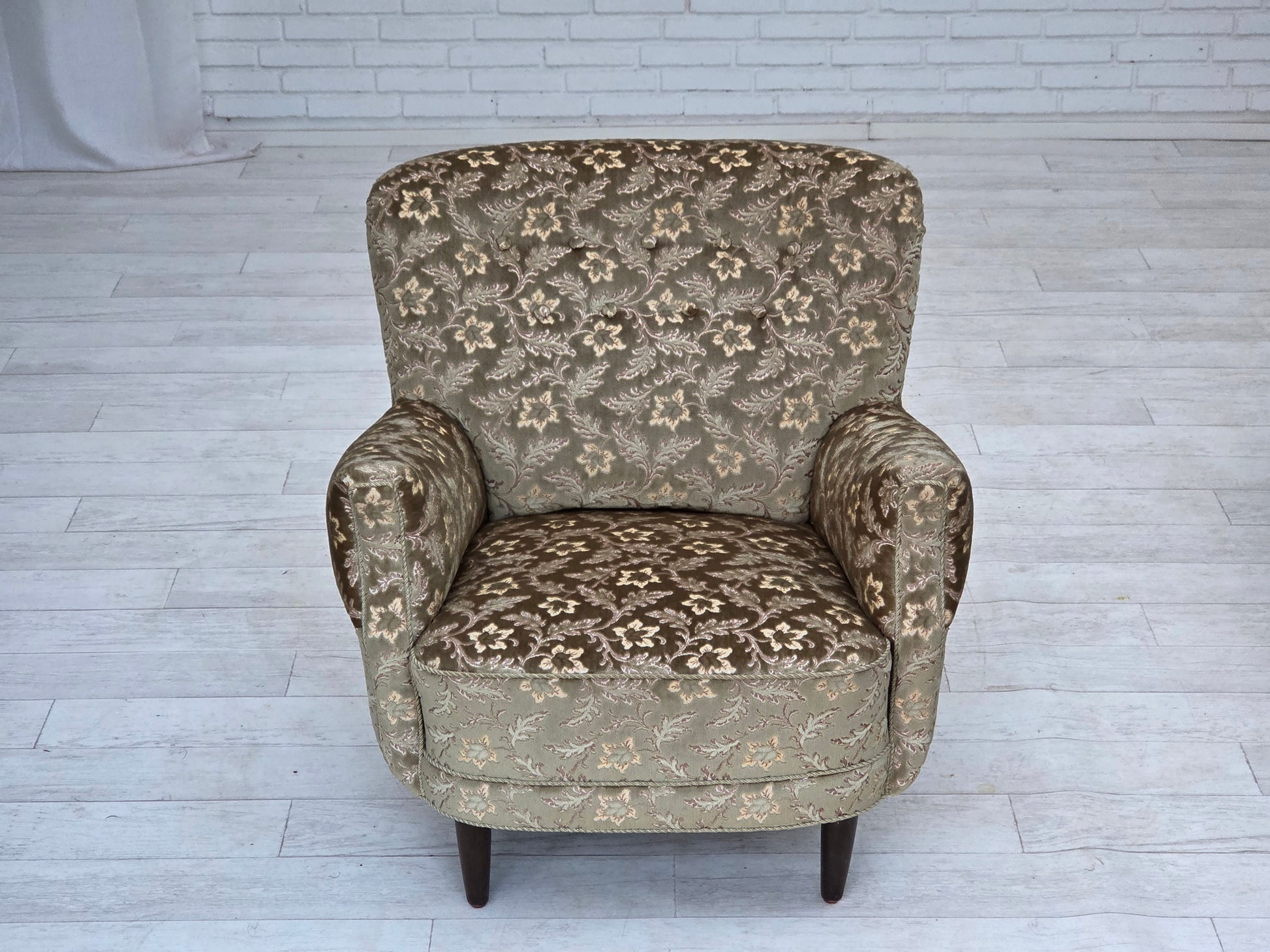 DESCRIPTION: 1960s, Danish armchair. Light green furniture velour, teak wood legs, springs in the seat. The chair was reupholstered by craftsman about 10-15 years ago. Very good condition: no smells, no stains and stable construction. Manufactured by Danish furniture maker in about 1960-65s. Original Scandinavian vintage design directly from Denmark.