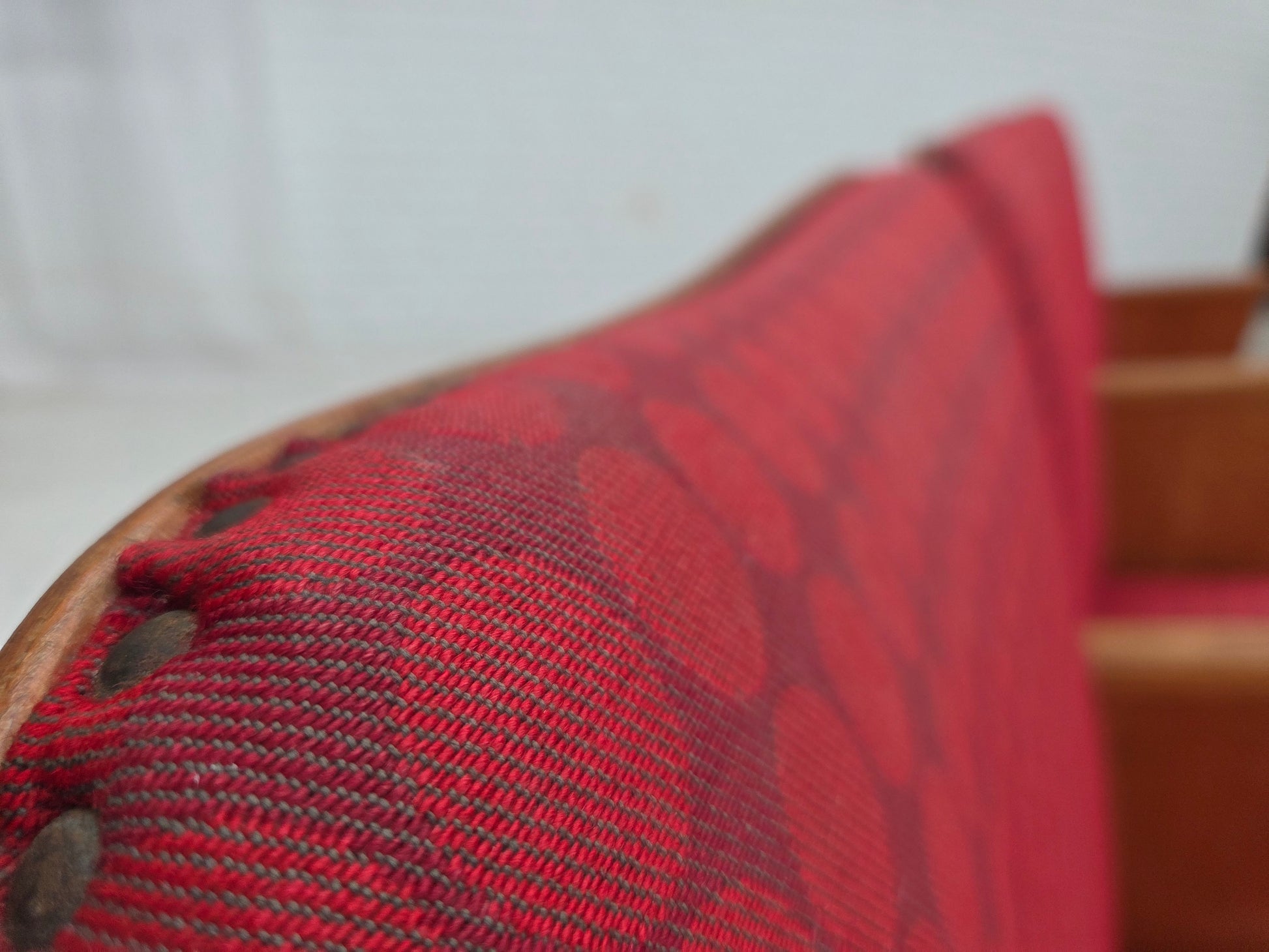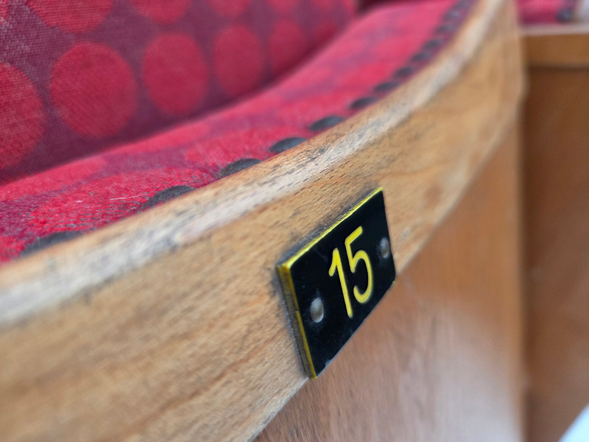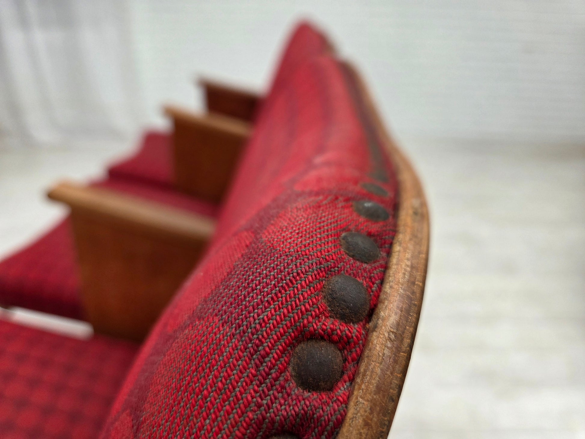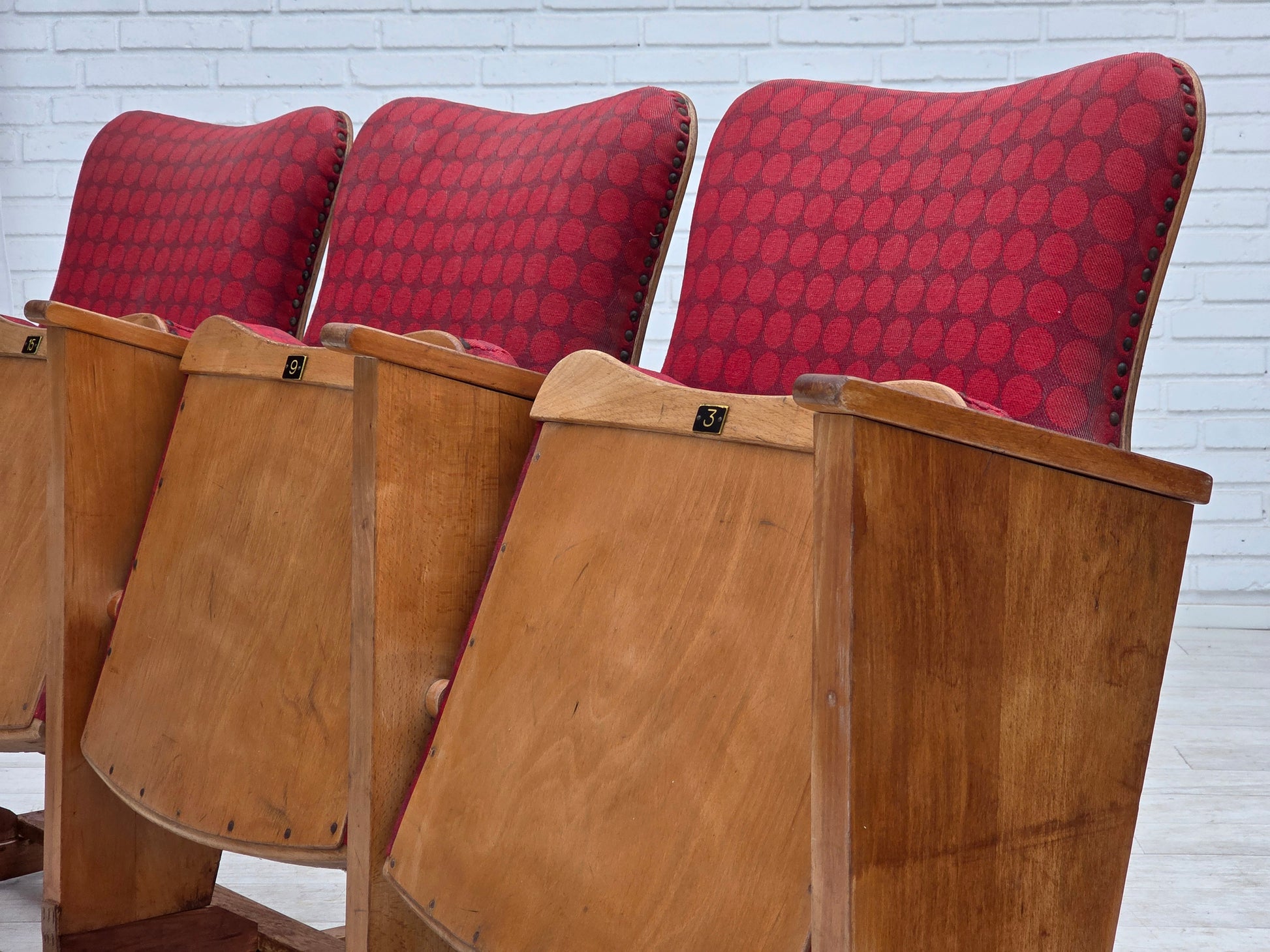 DESCRIPTION: 1960s, Danish cinema/theater chairs. Original red furniture fabric, plywood, oak wood. Added lower stiffening wooden construction. Original good condition: no smells, no stains and stable construction. Wear according to age. Manufactured by Danish furniture maker in about 1955-60s. Original Scandinavian vintage design directly from Denmark.