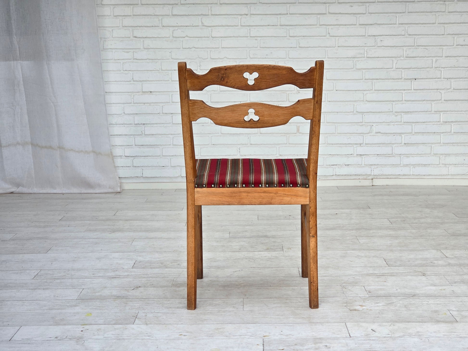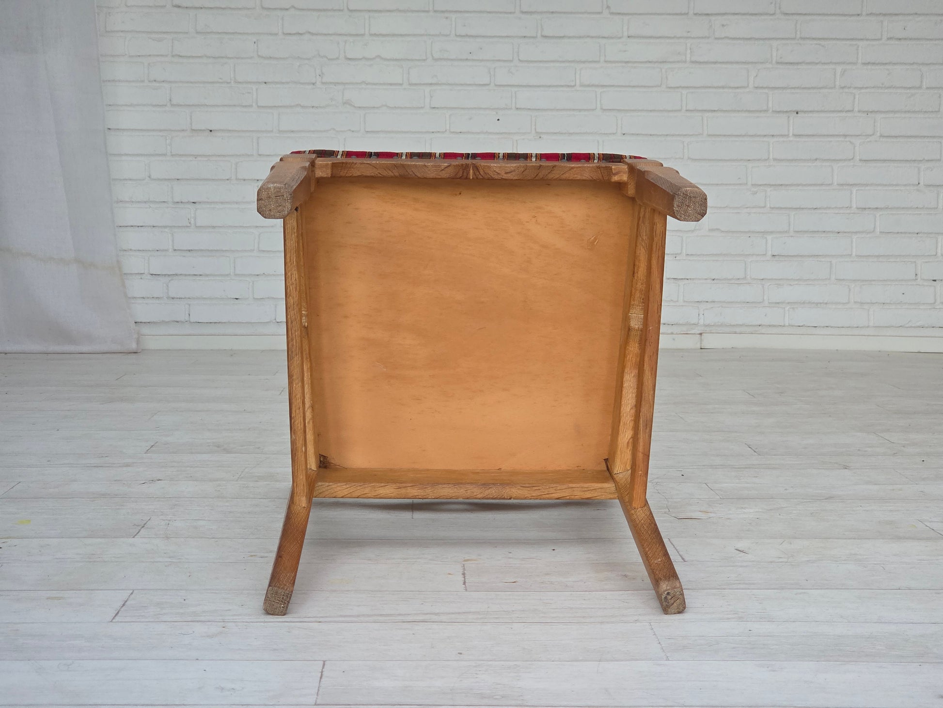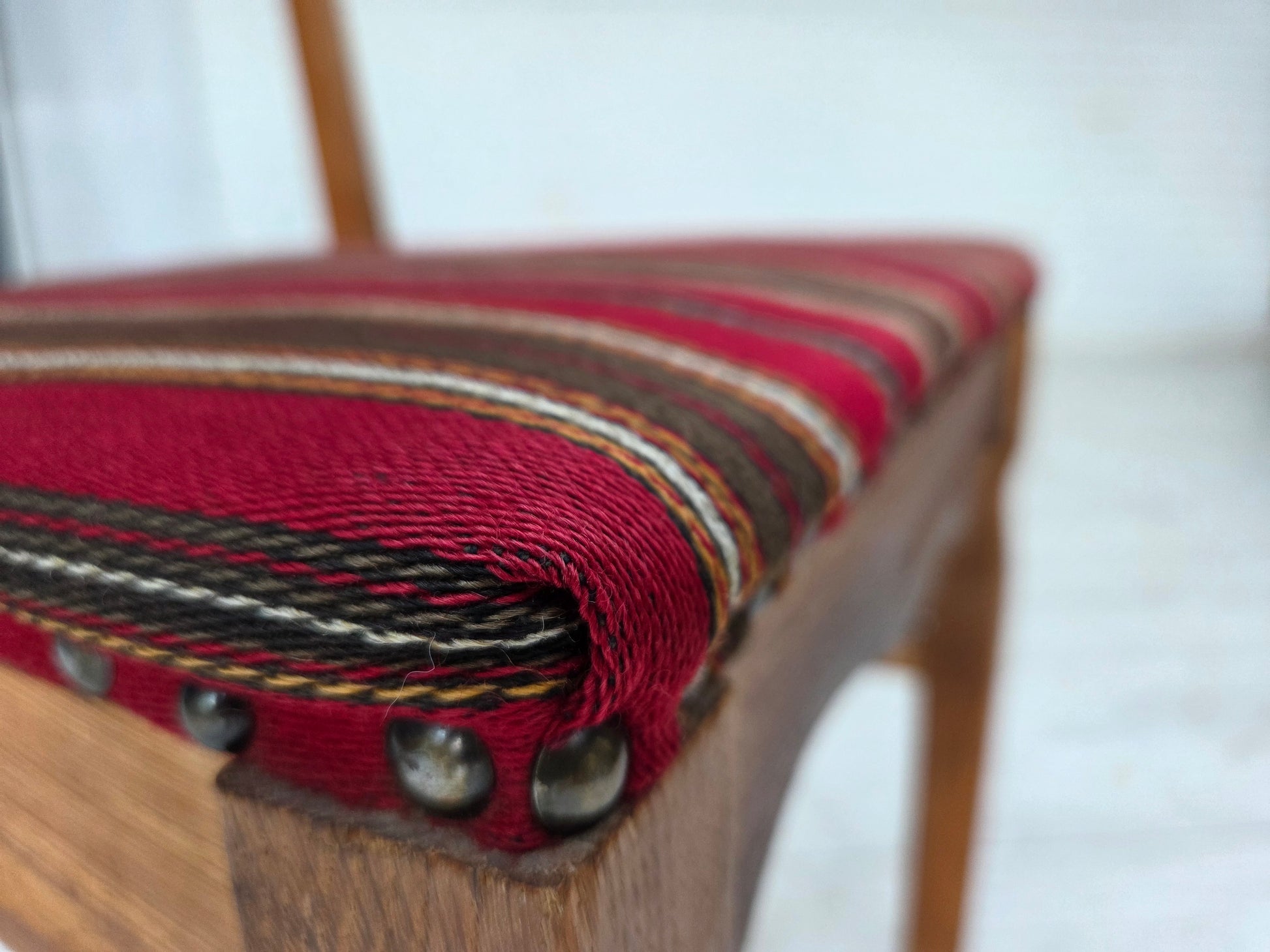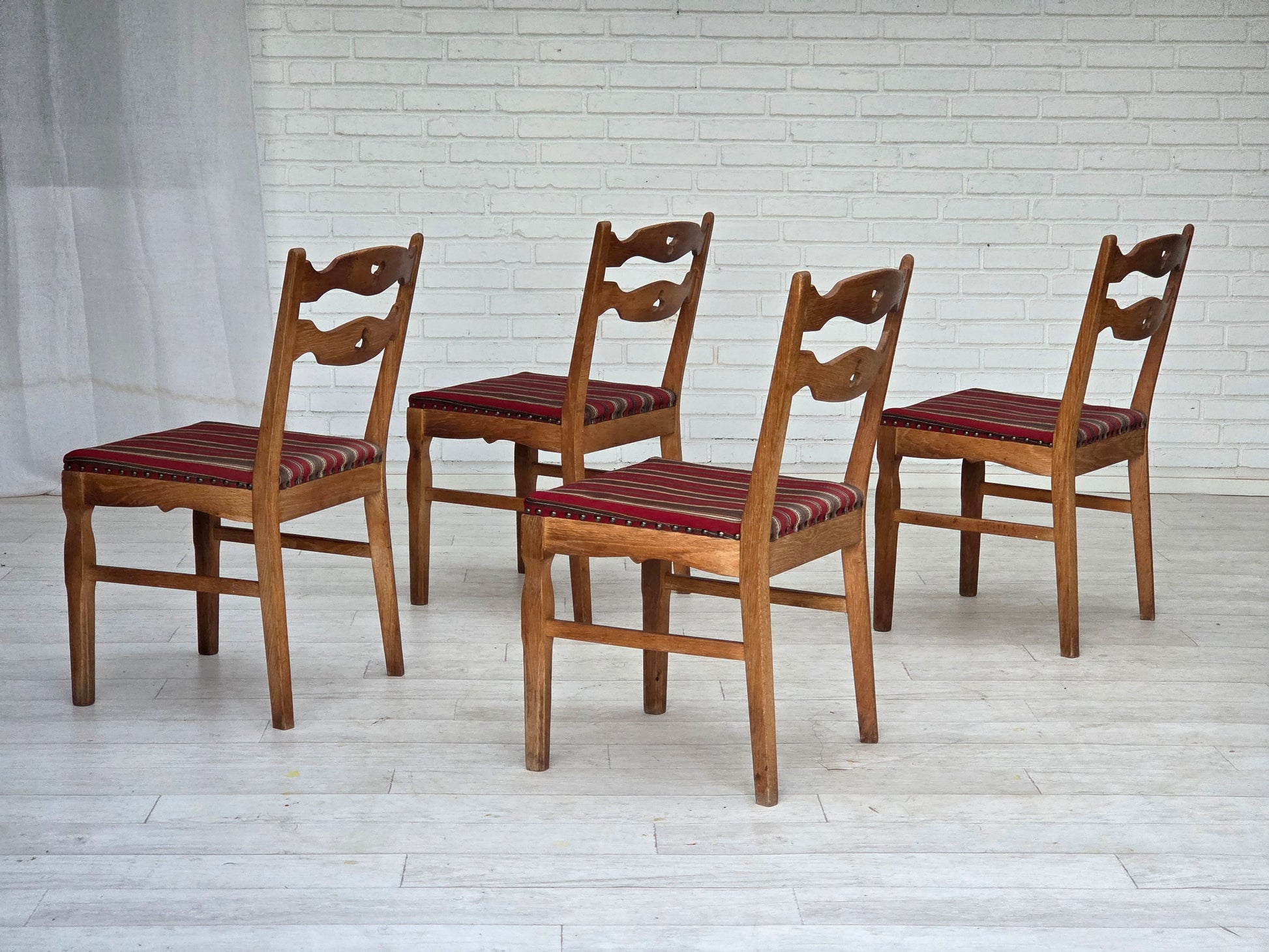 DESCRIPTION: 1960s, set of 4 pcs Danish dining chairs. Original red striped furniture wool, solid oak wood. Original good condition: no stains, no smells and stable construction. Manufactured by Danish furniture maker in about 1965-70s. Original Scandinavian vintage design directly from Denmark. The set were checked by craftsman.