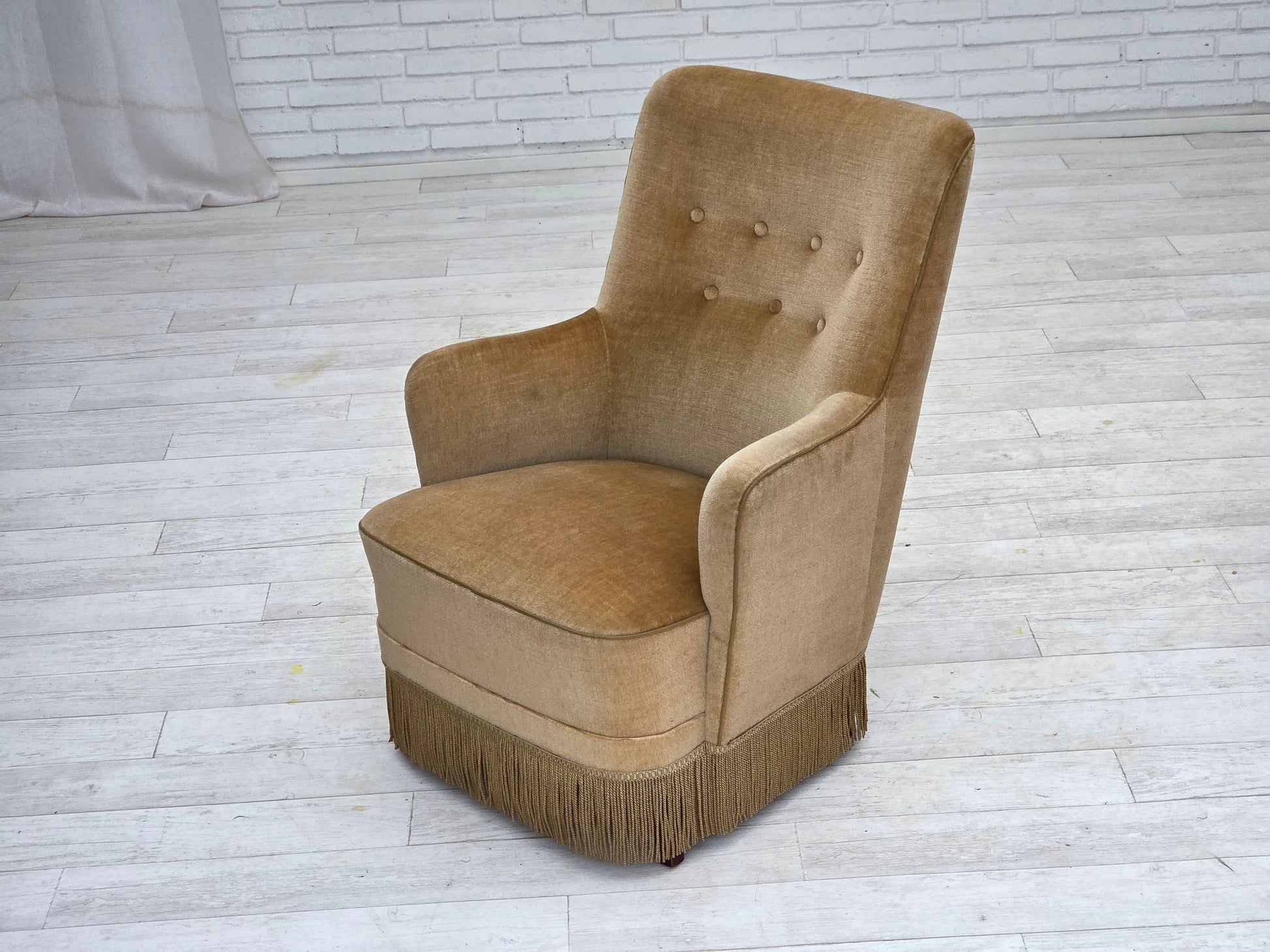 DESCRIPTION: 1970s, Danish highback armchair. Light green furniture velour, springs in the seat, beech wood legs. Original very good condition: no smells, no stains and stable construction. Manufactured by Danish furniture maker in about 1970-75s. Original Scandinavian vintage design directly from Denmark. The chair was checked by craftsman.