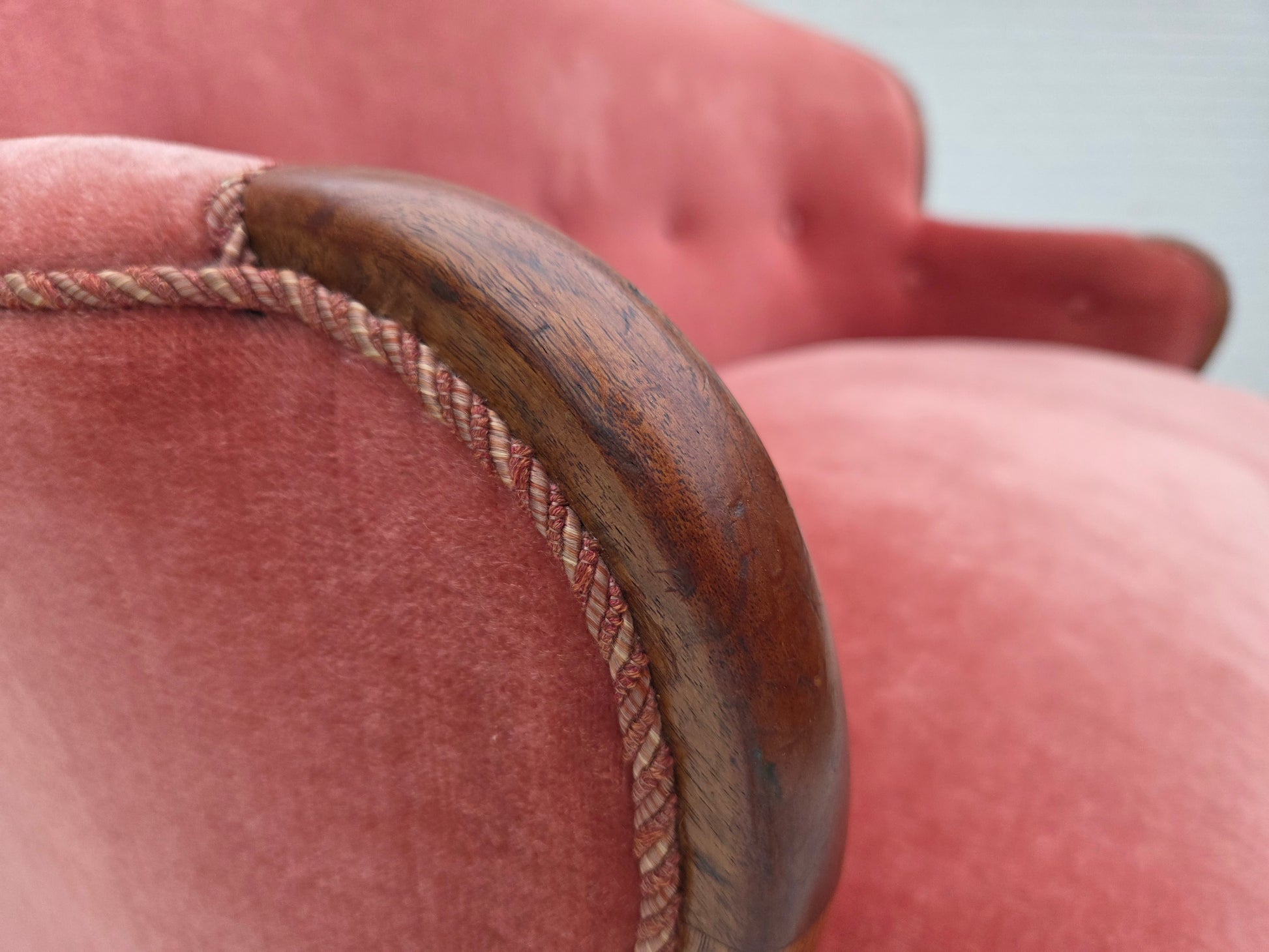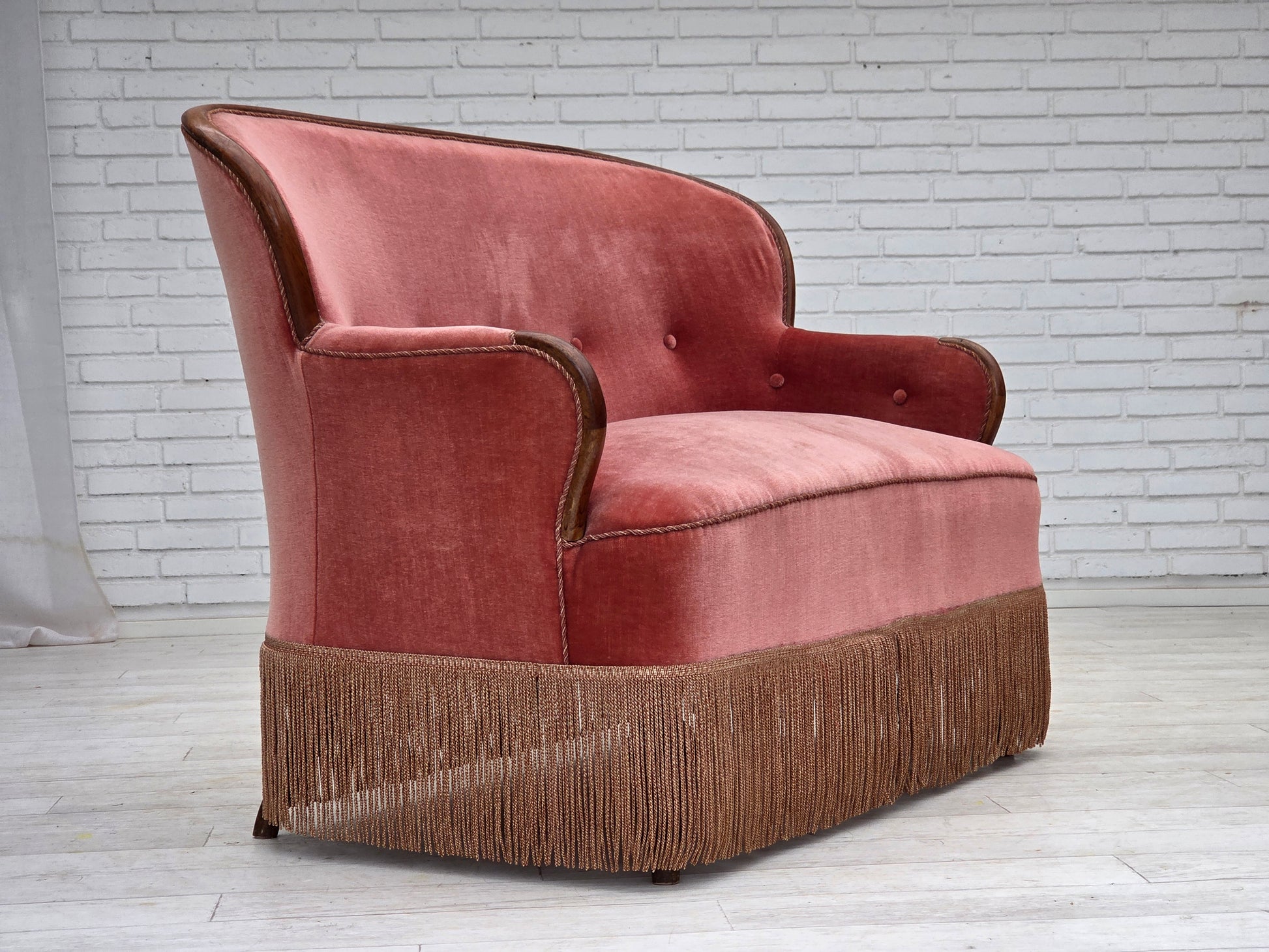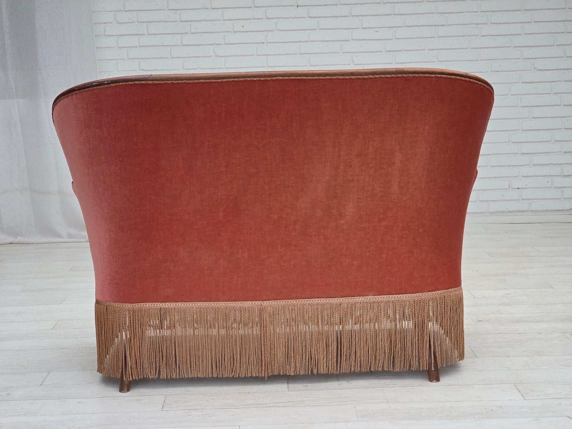 DESCRIPTION: 1930s, Danish 2-seater sofa. Salmon pink furniture velour, ash wood, springs in the seat. Sofa was reupholstered by craftsman about 15 years ago. Manufactured by Danish furniture craftsman in about 1930-35s. Original Scandinavian vintage design directly from Denmark. The sofa was checked by craftsman.