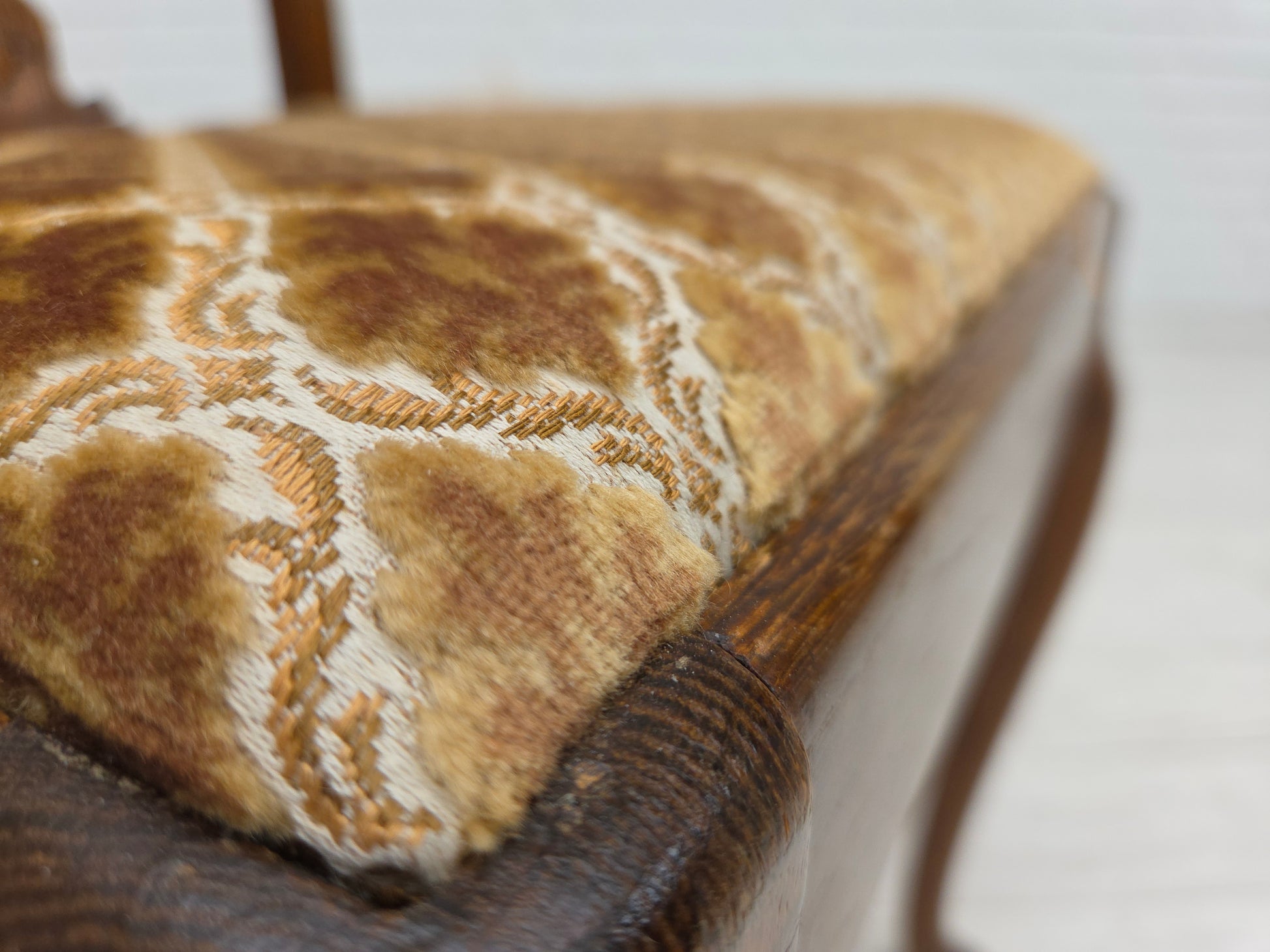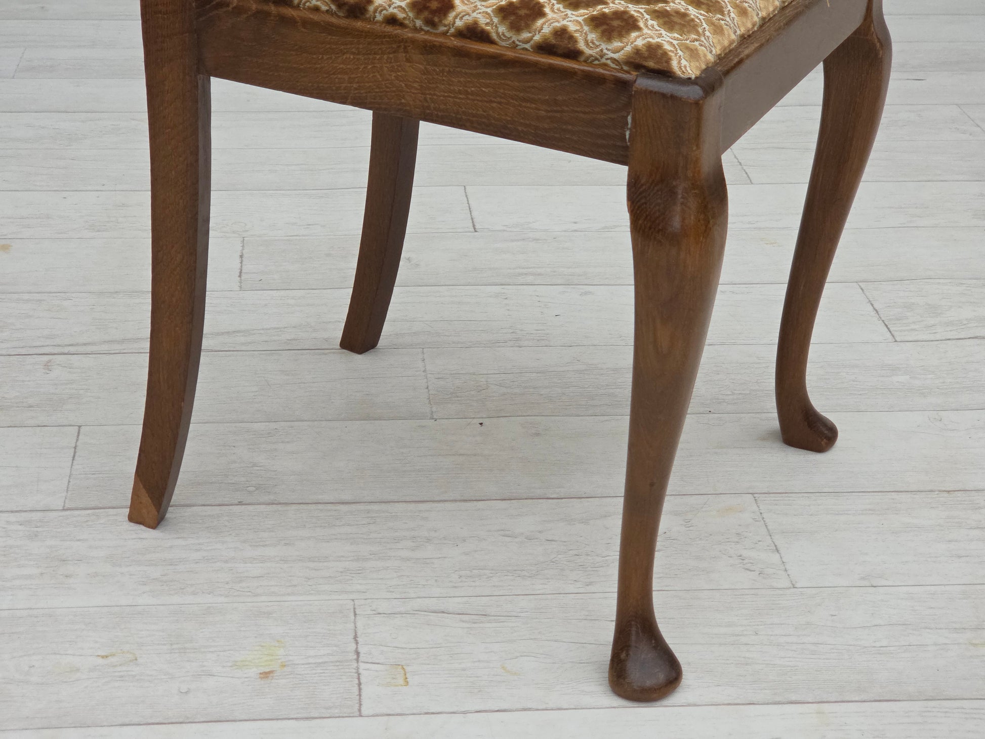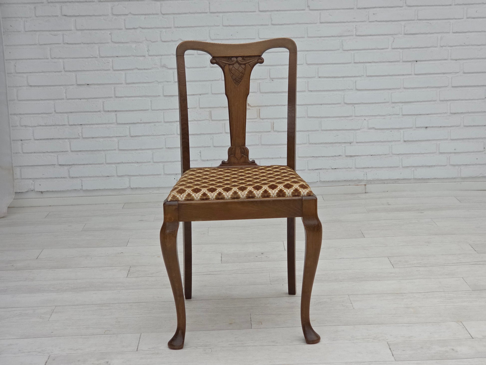 1930s, set of 6 Danish vintage chairs, furniture velour, oak wood, reupholstered.