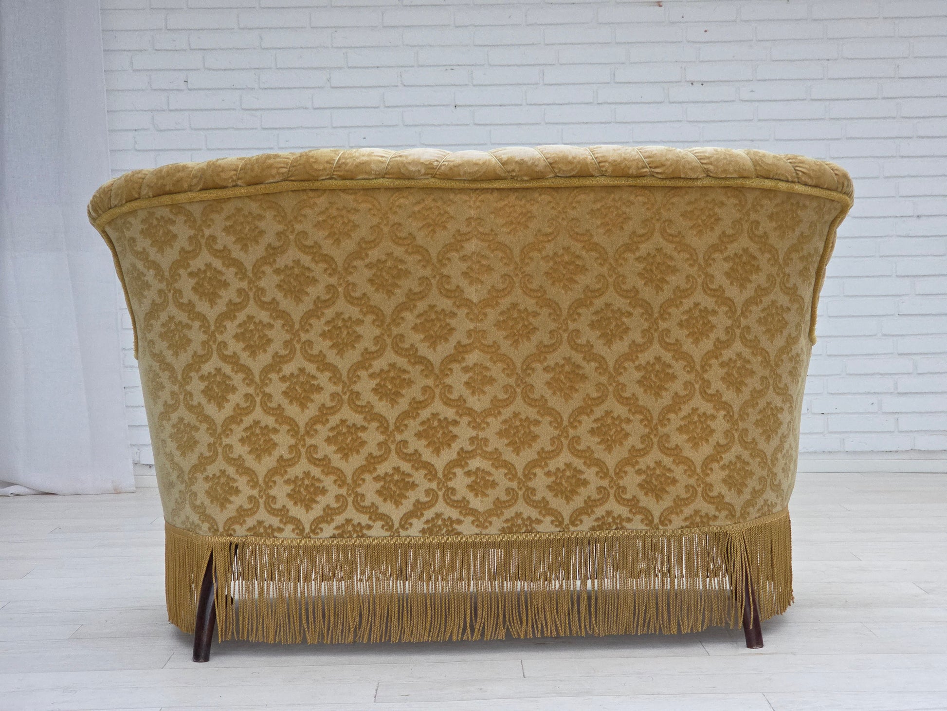 DESCRIPTION: 1950s, Danish 2-seater sofa. Green/honing furniture velour, beech wood legs, brass wheels on the front legs. Brass springs in the seat. Sofa was reupholstered by craftsman about 20 years ago. Very good condition: no smells, no stains and stable construction. Original Scandinavian craftsmanship vintage design directly from Denmark. Manufactured by Danish furniture maker in about 1950-55s. The sofa was checked by craftsman.