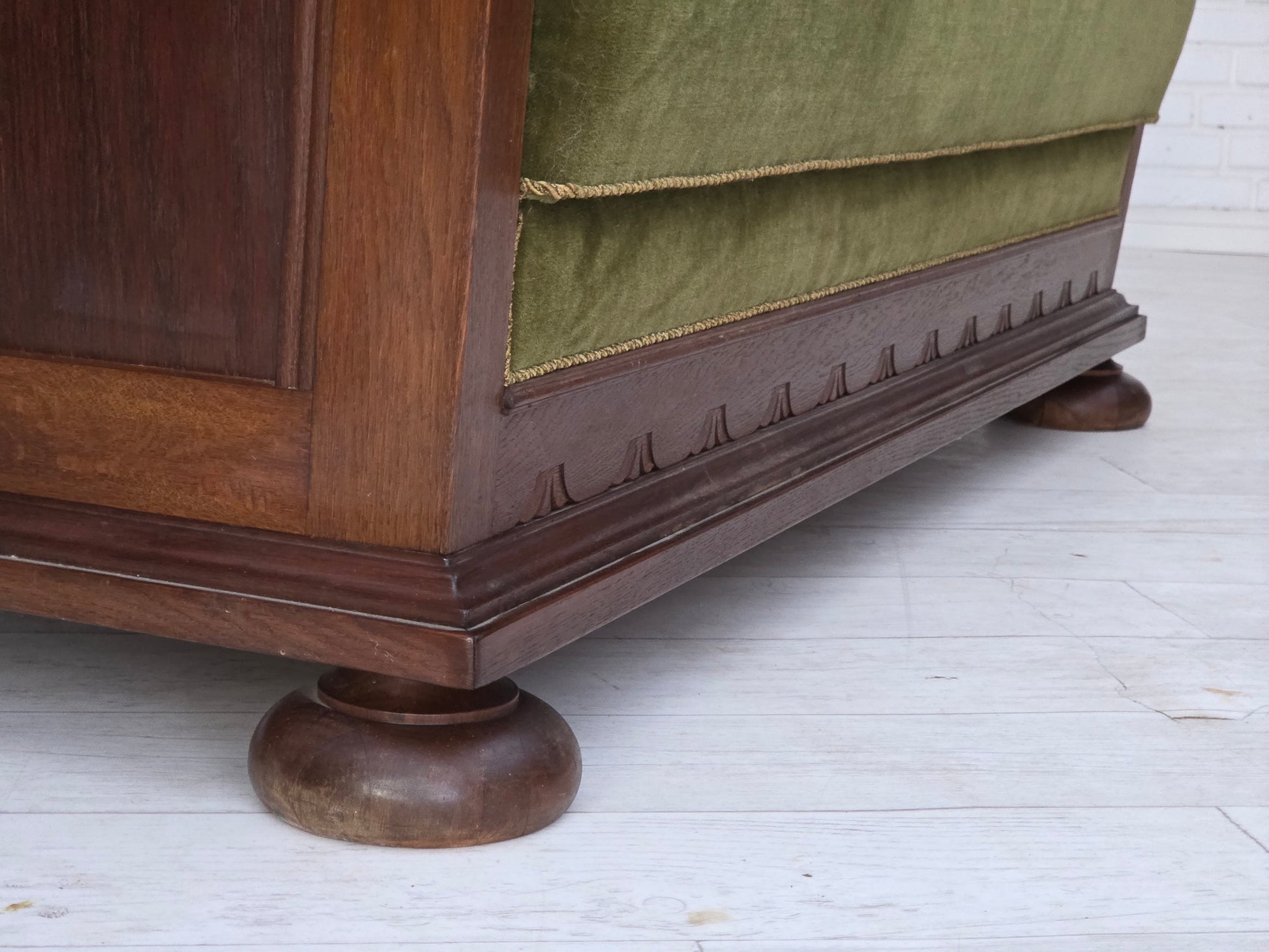 1950s, Danish 2-seater sofa, original green furniture velour, oak wood.