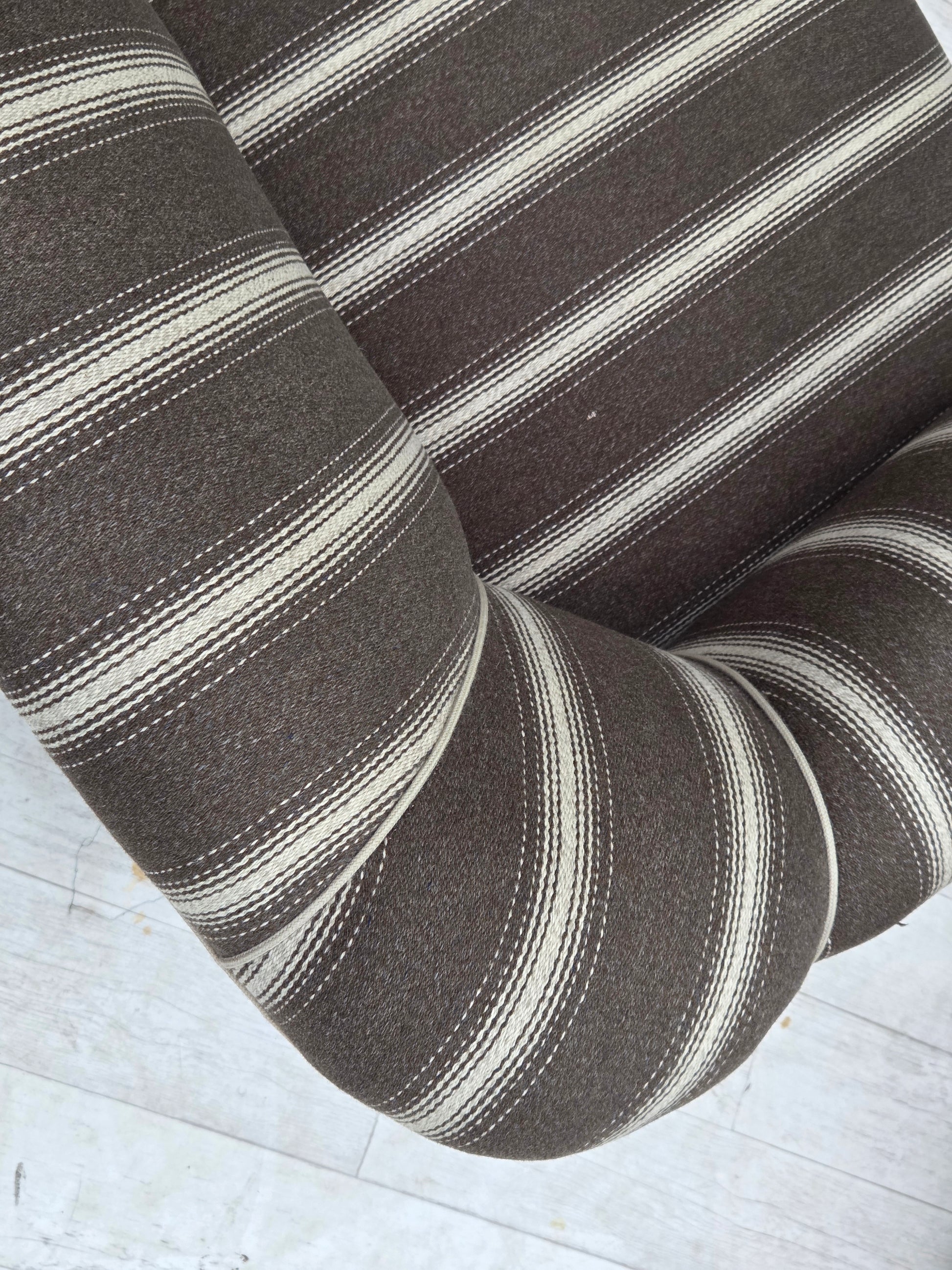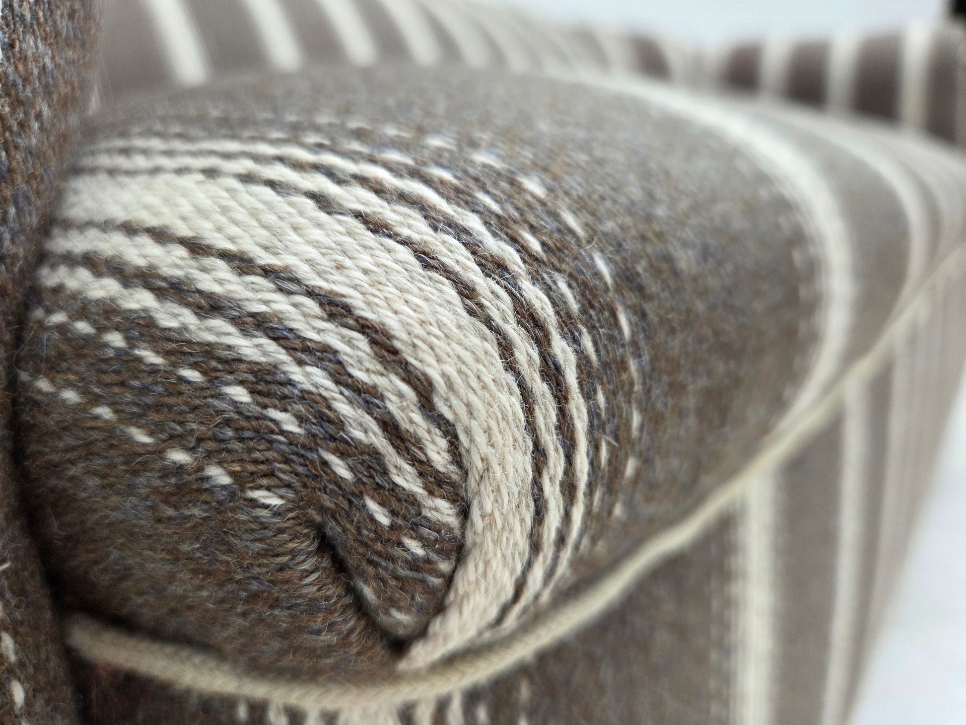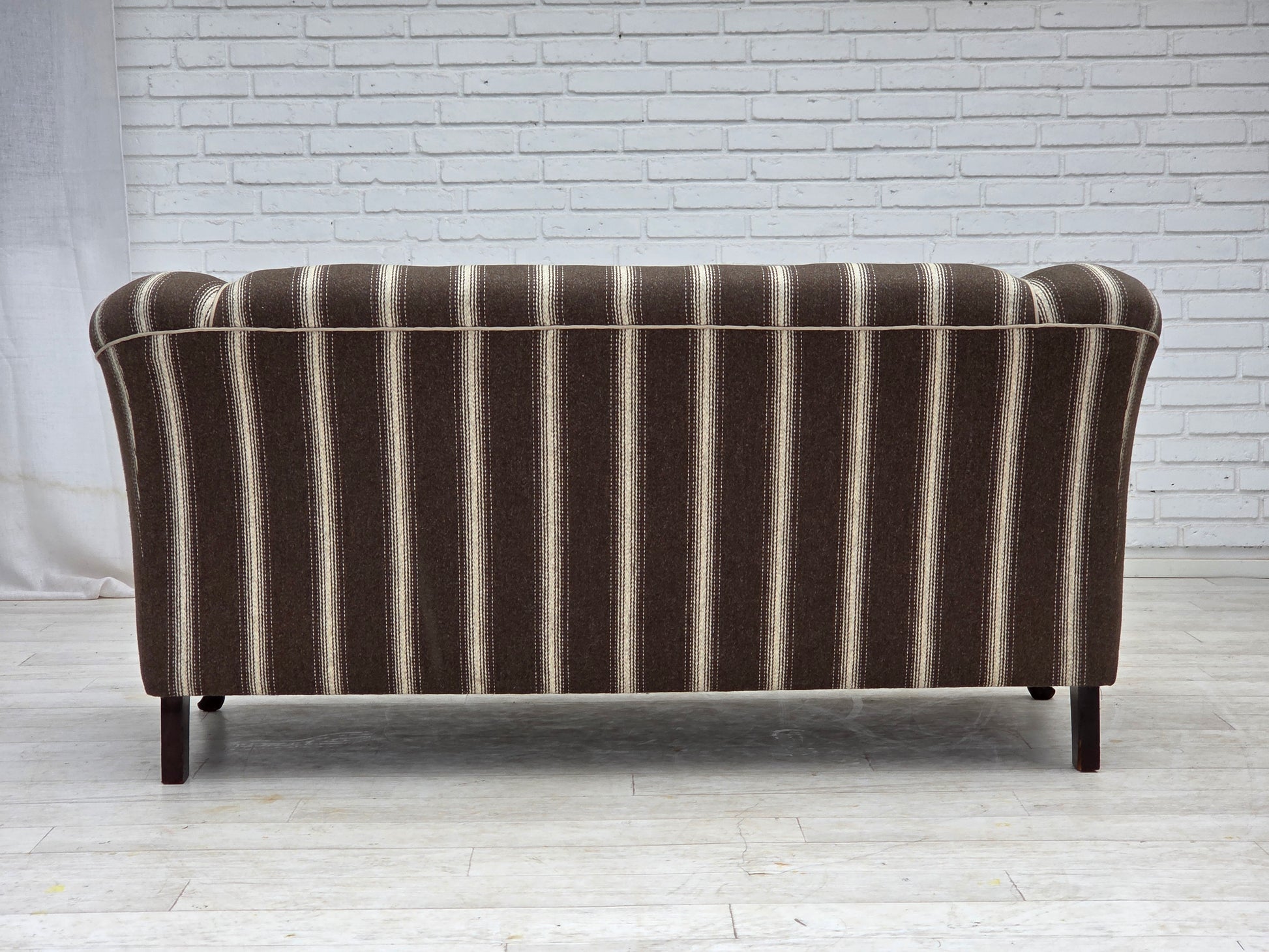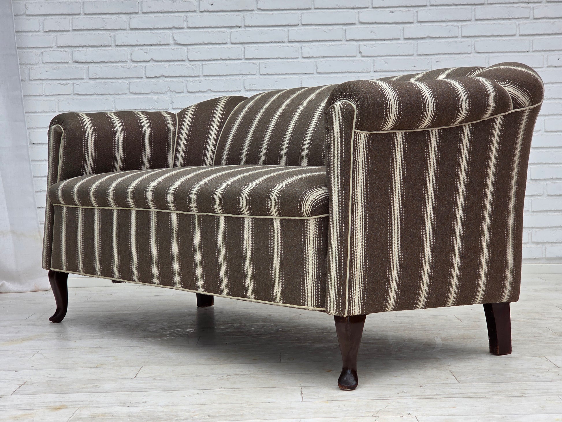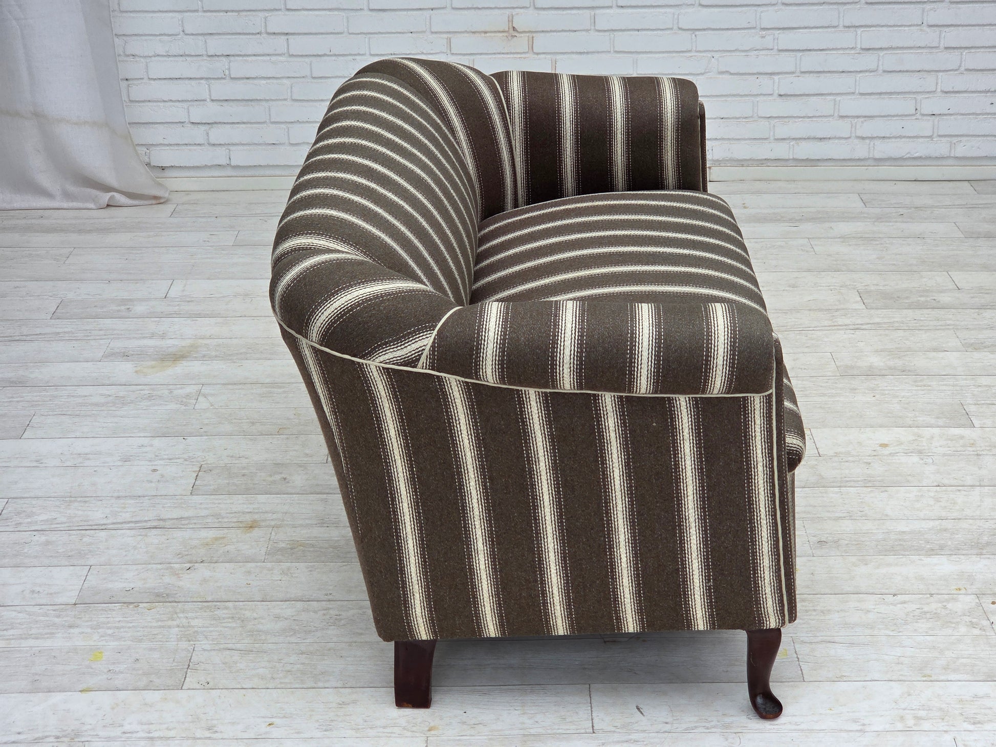 DESCRIPTION: 1950s, Danish 2-seater sofa. Striped furniture wool, ash wood legs, springs in the seat. Sofa was reupholstered by craftsman about 10-15 years ago. Manufactured by Danish furniture maker in about 1950s. Very good condition: no smells, no stains and stable construction. Original Scandinavian vintage design directly from Denmark. The sofa was checked by craftsman.