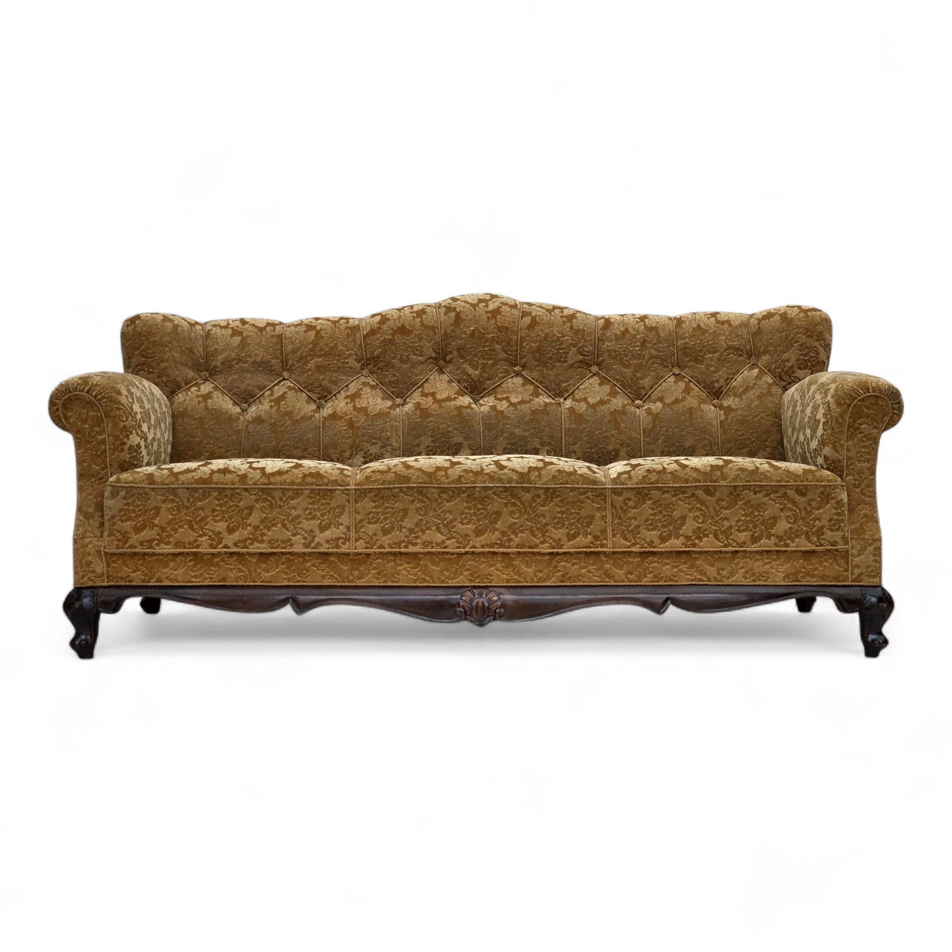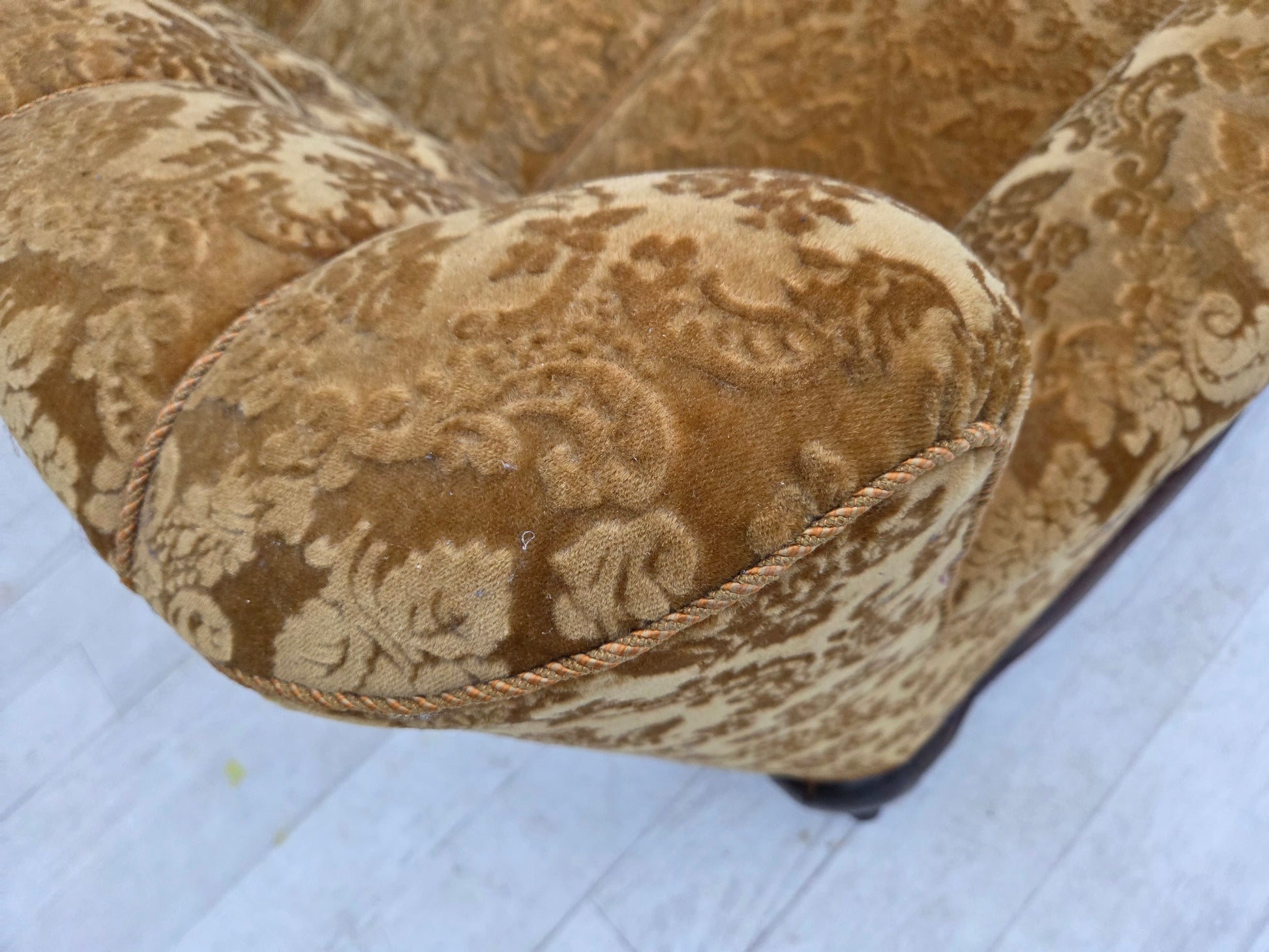 1950s, Danish 3-seater sofa, furniture velour, carved oak wood.