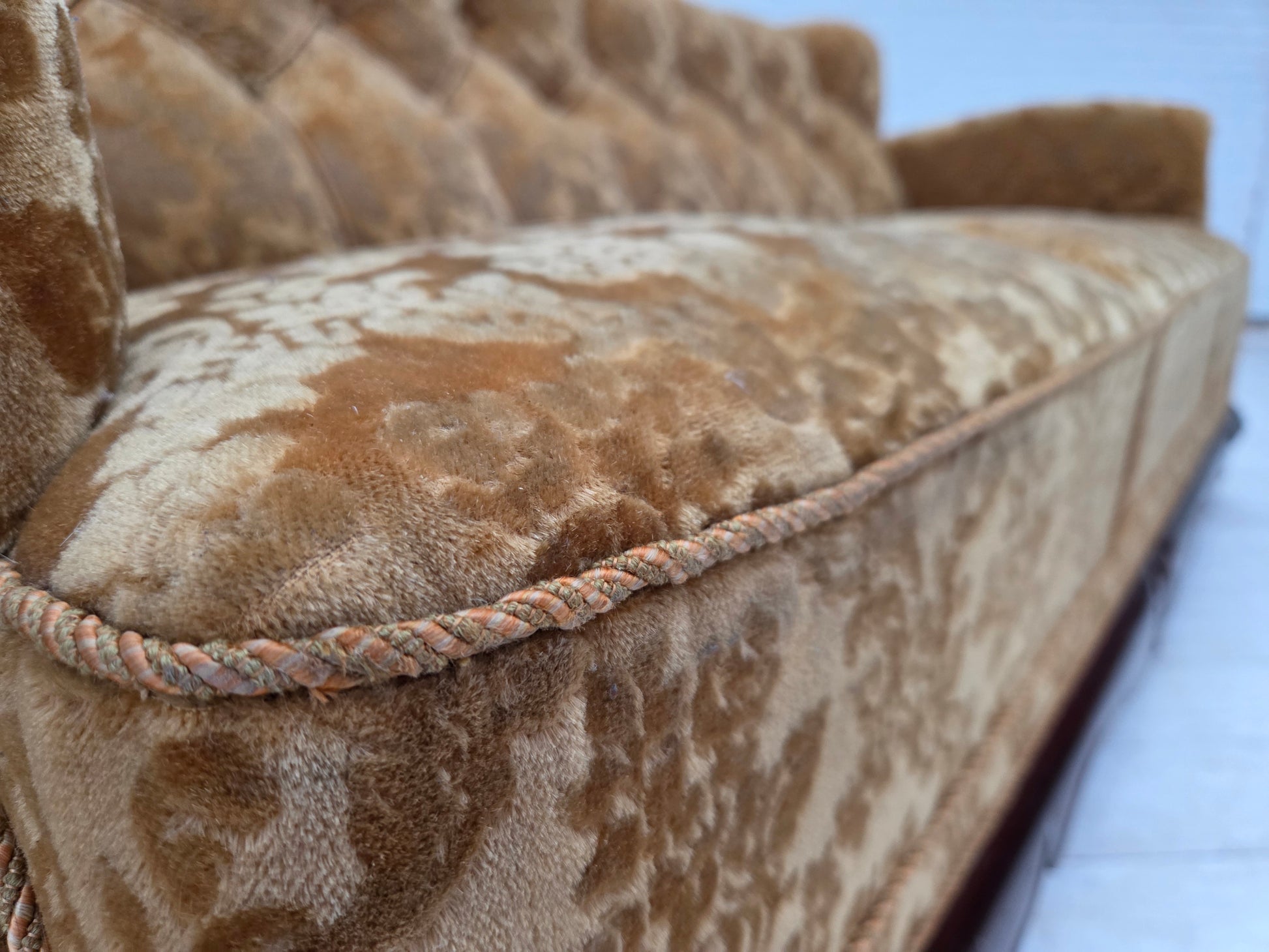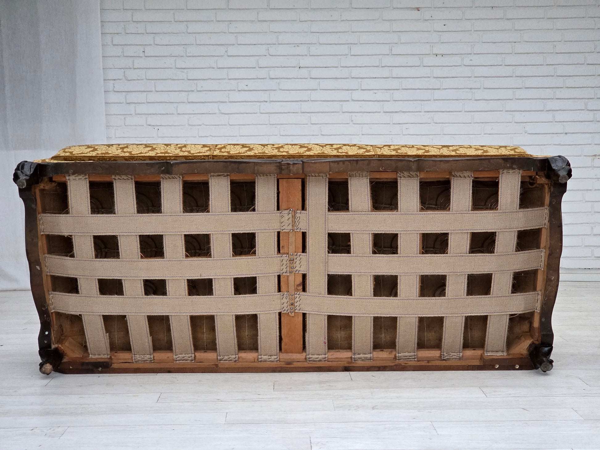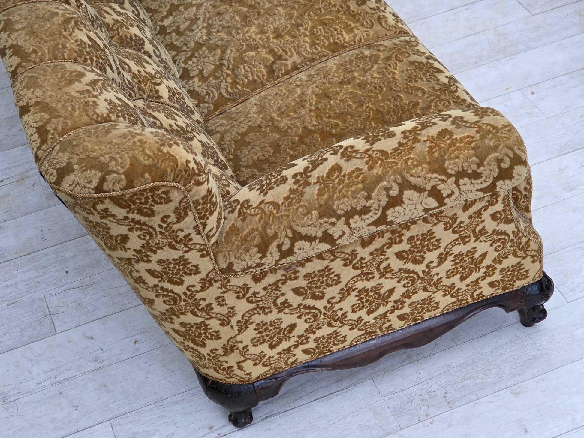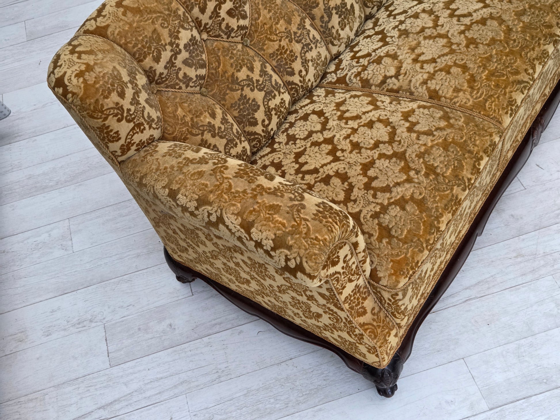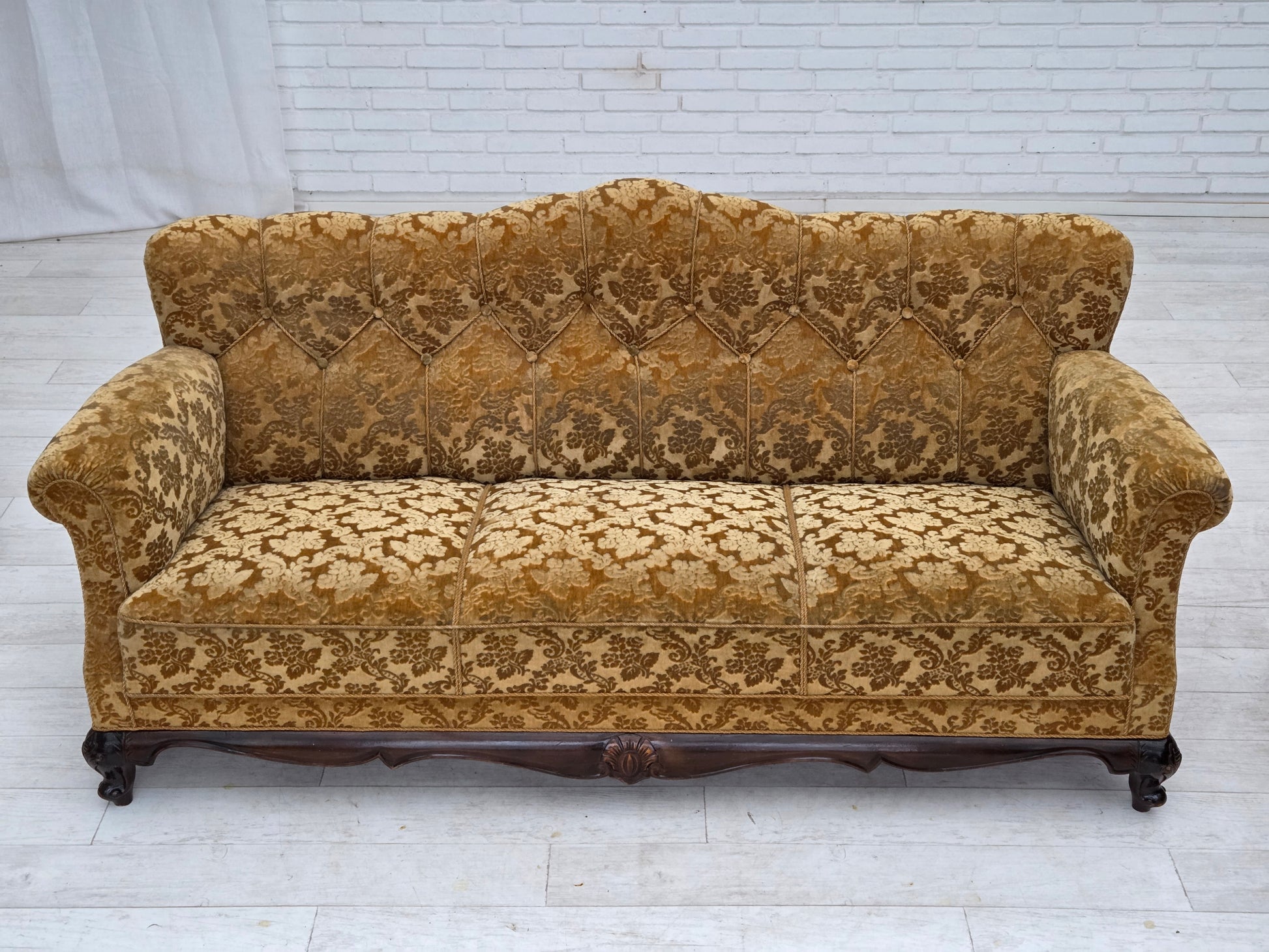 DESCRIPTION: 1950s, Danish 3-seater sofa. Original honey yellow furniture velour, carved oak wood, brass springs in the seat. Original good condition: no smells, no stains and stable construction. Manufactured by Danish furniture craftsman in about 1950-55s. Original Scandinavian vintage design directly from Denmark. The sofa was checked by craftsman.