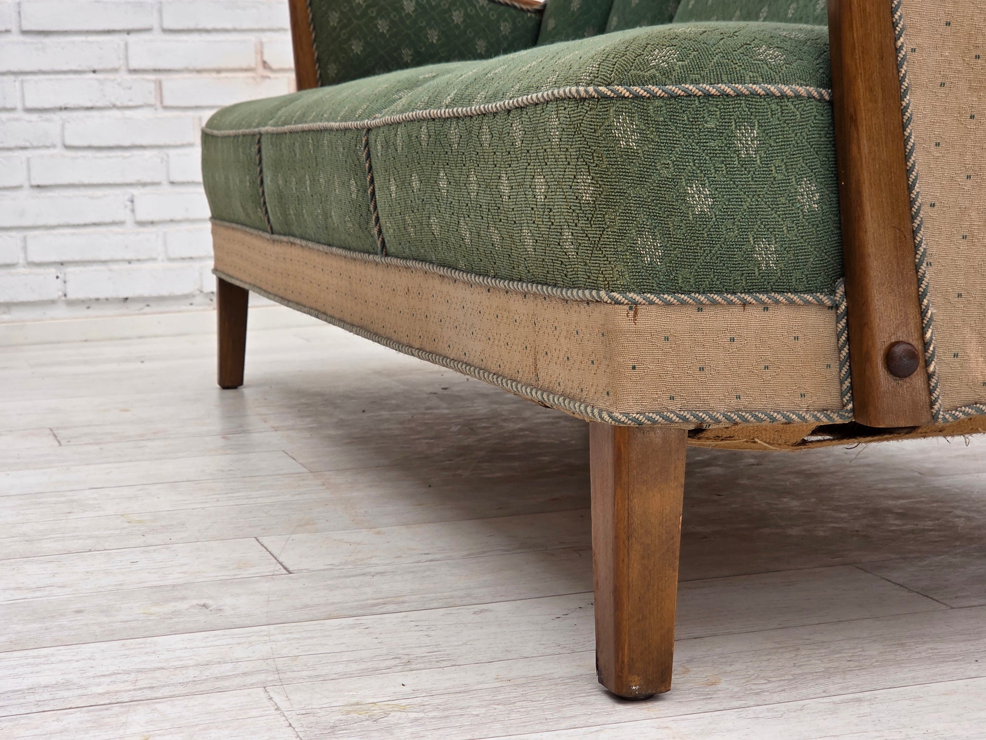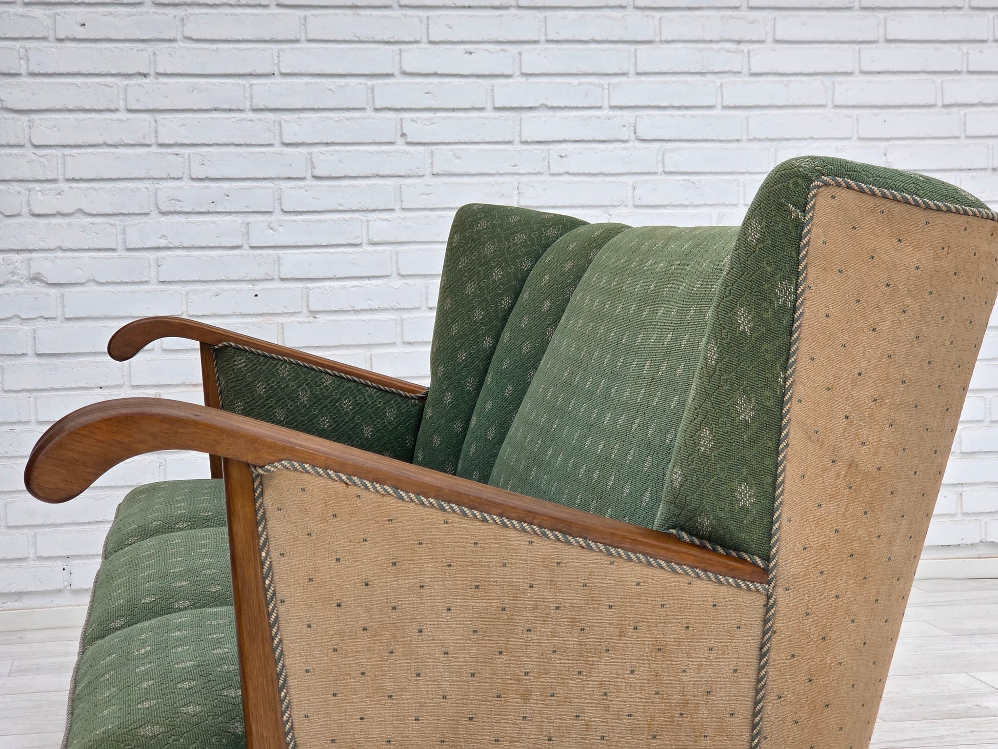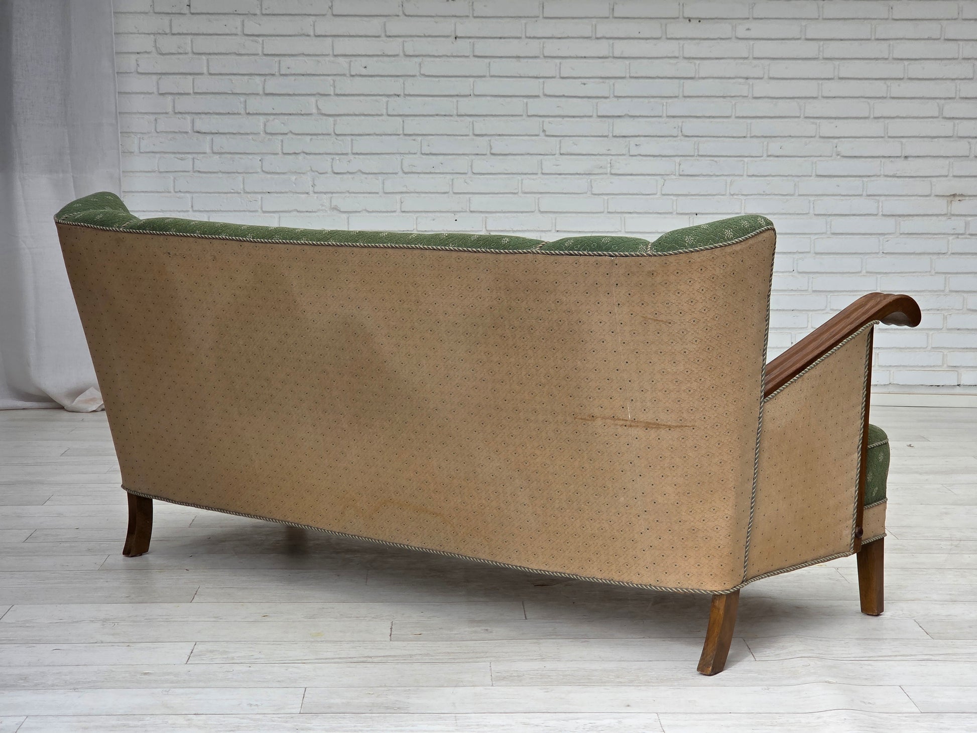DESCRIPTION: 1950s, Danish 3-seater sofa. Original green and beige furniture wool fabric, oak wood, brass springs in the seat. Original good condition: no smells, no stains and stable construction. Sun discoloration of the beige material on the back and sides. Manufactured by Danish furniture maker in about 1955-60s. Original Scandinavian craftsmanship vintage design directly from Denmark. The sofa was checked by craftsman.