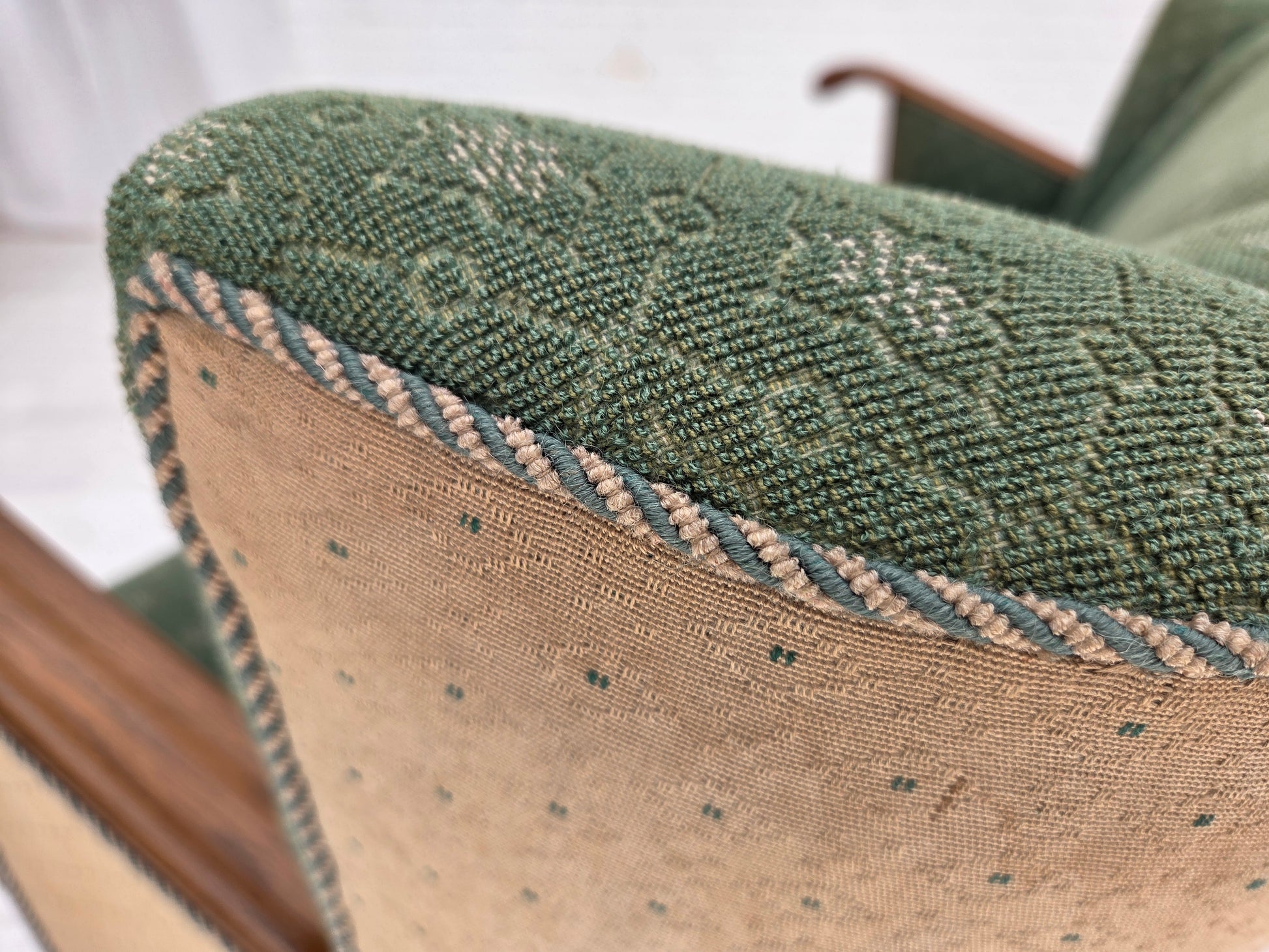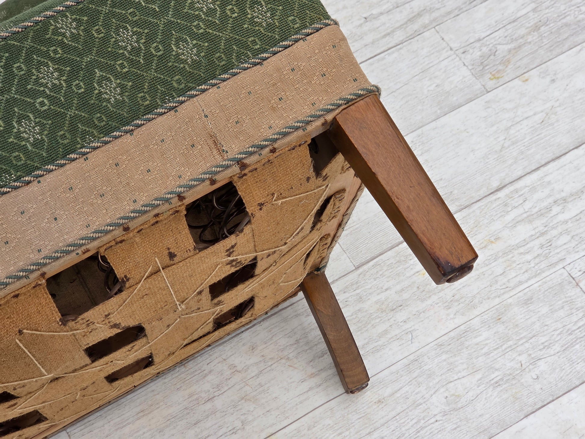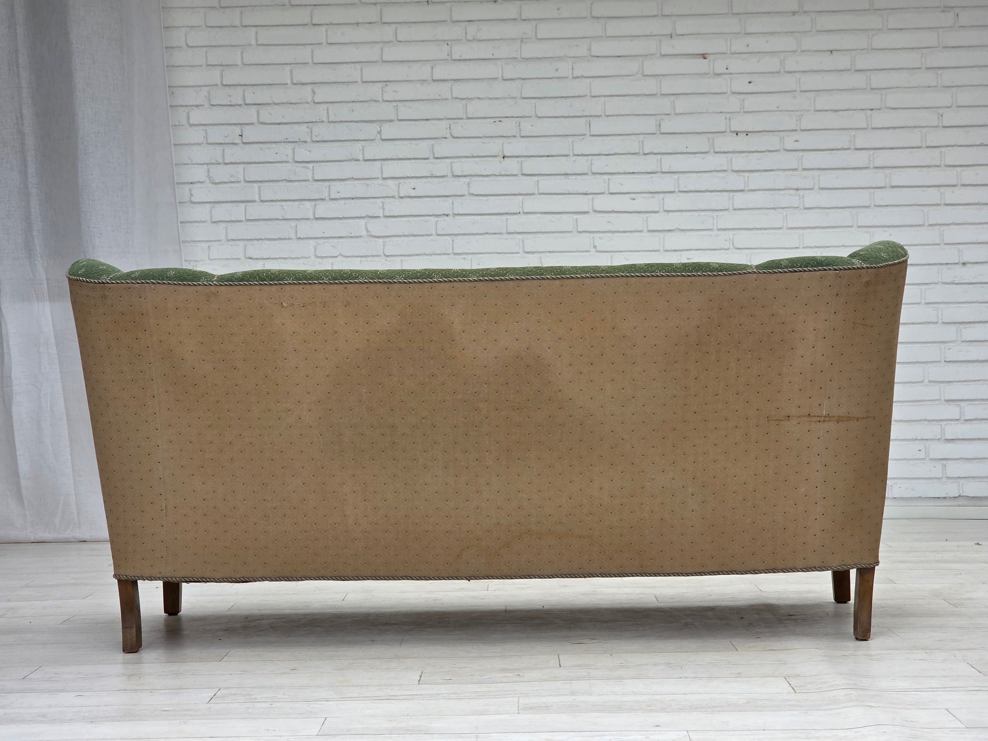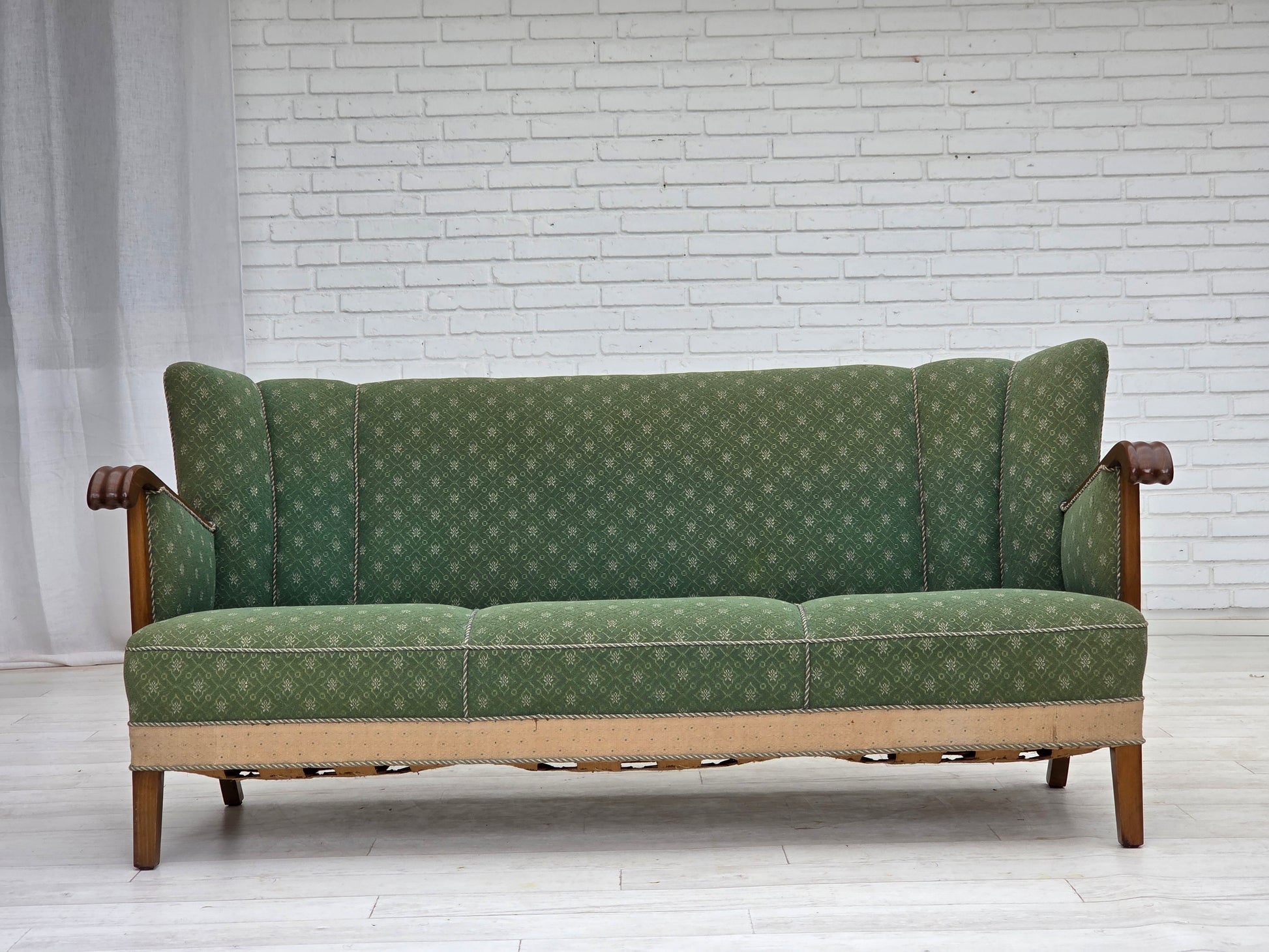 DESCRIPTION: 1950s, Danish 3-seater sofa. Original green and beige furniture wool fabric, oak wood, brass springs in the seat. Original good condition: no smells, no stains and stable construction. Sun discoloration of the beige material on the back and sides. Manufactured by Danish furniture maker in about 1955-60s. Original Scandinavian craftsmanship vintage design directly from Denmark. The sofa was checked by craftsman.