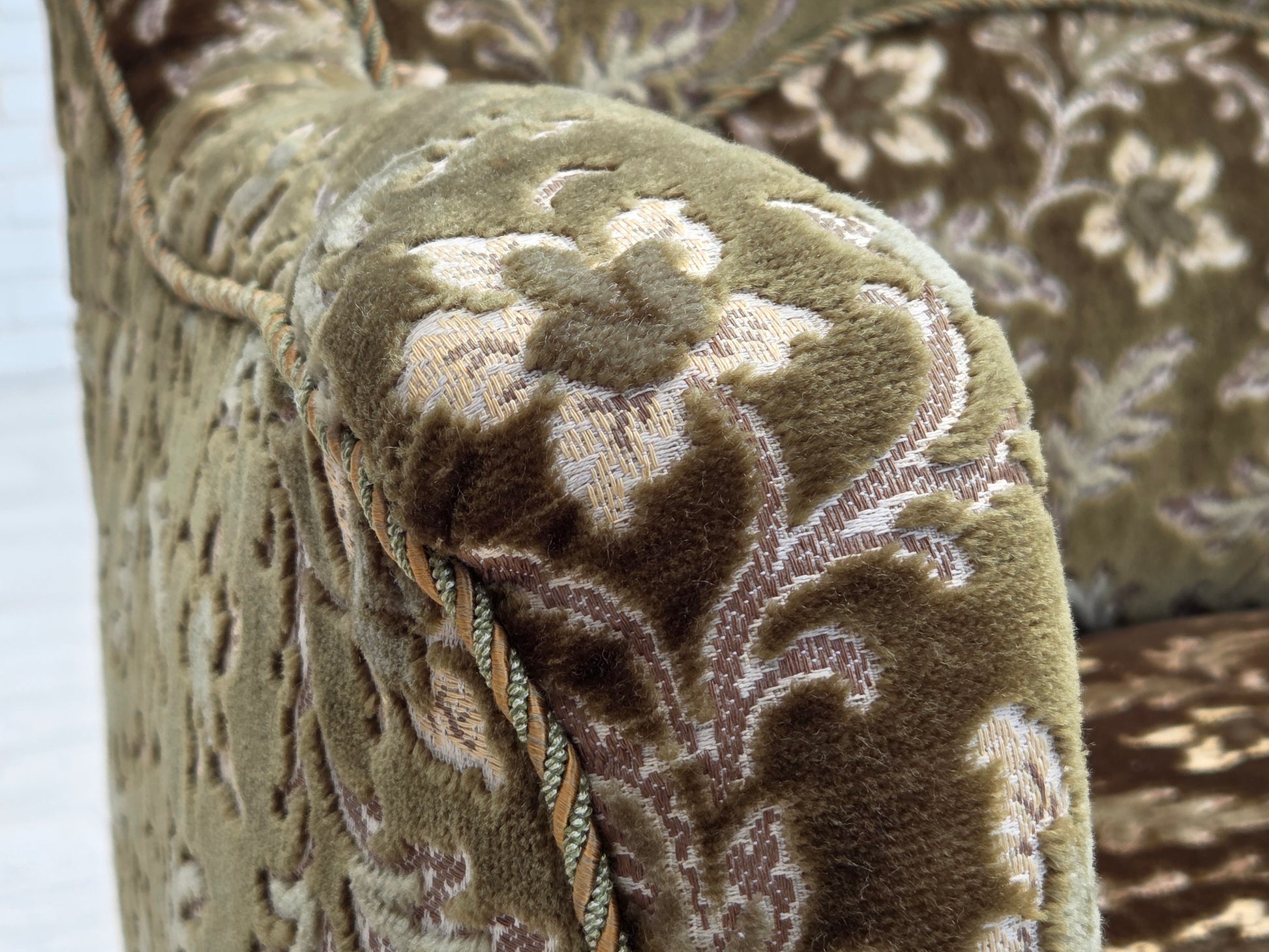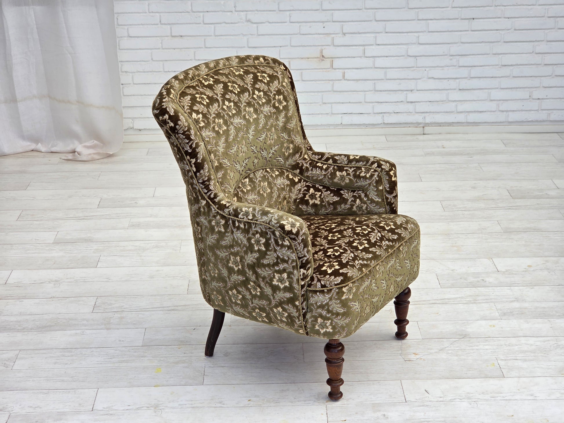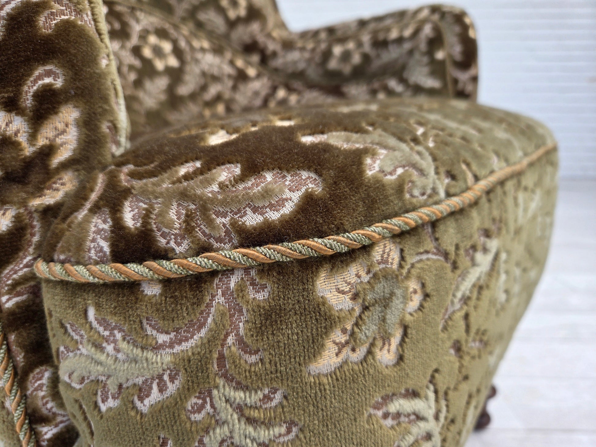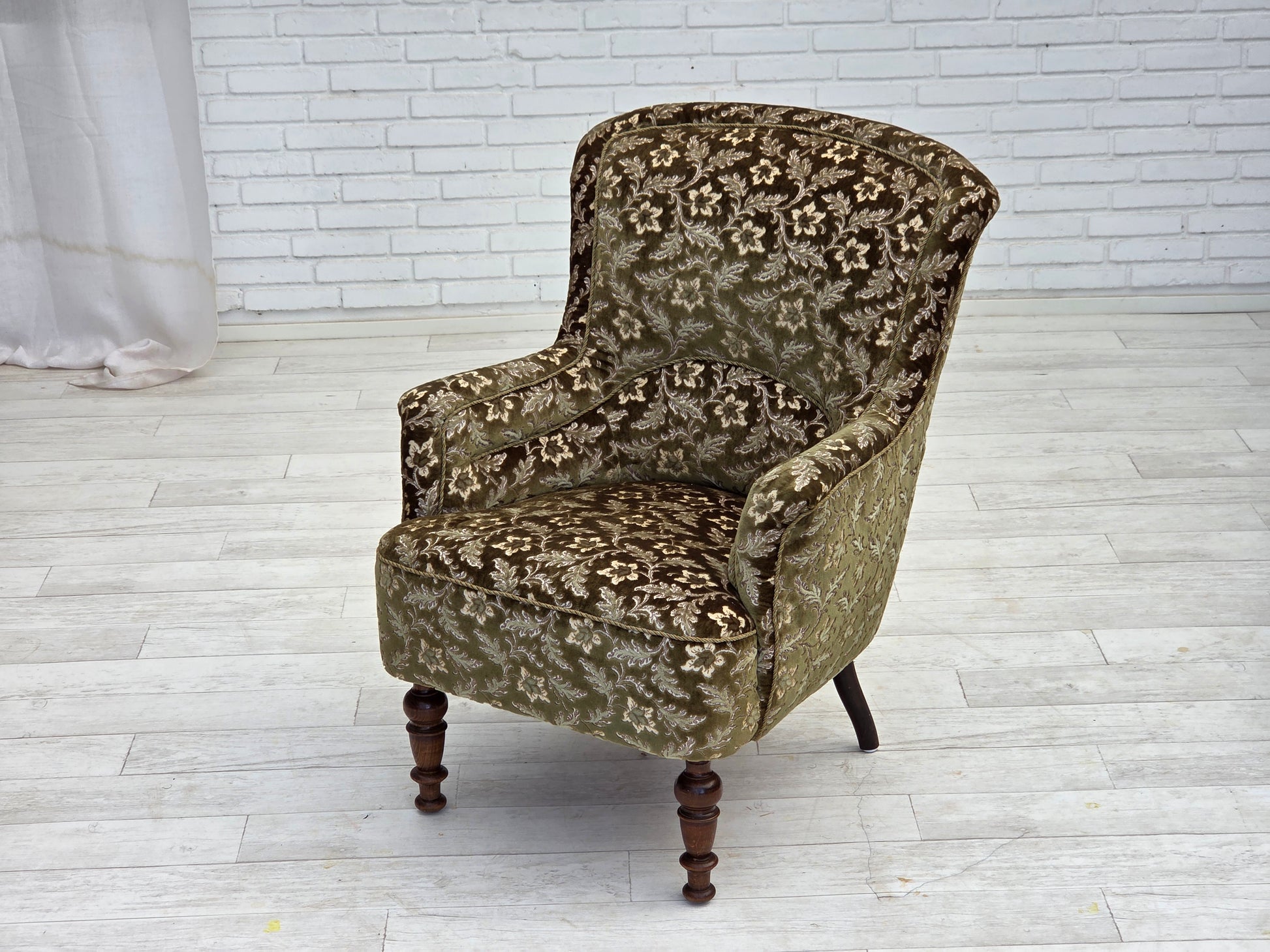 DESCRIPTION: 1950s, Danish armchair. Green furniture velour, ash wood legs, springs in the seat. Chair was reupholstered by craftsman about 15 years ago. Very good condition: no smells, no stains and stable construction. Manufactured by Danish furniture craftsman in about 1950-55s. Original Scandinavian vintage design directly from Denmark. The chair was checked by craftsman.