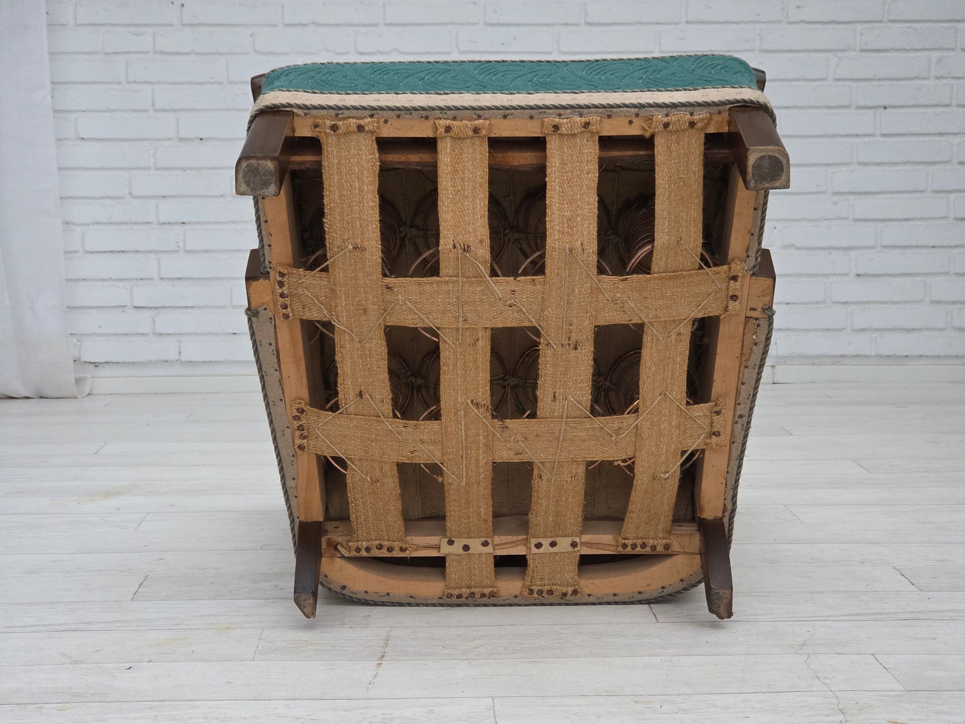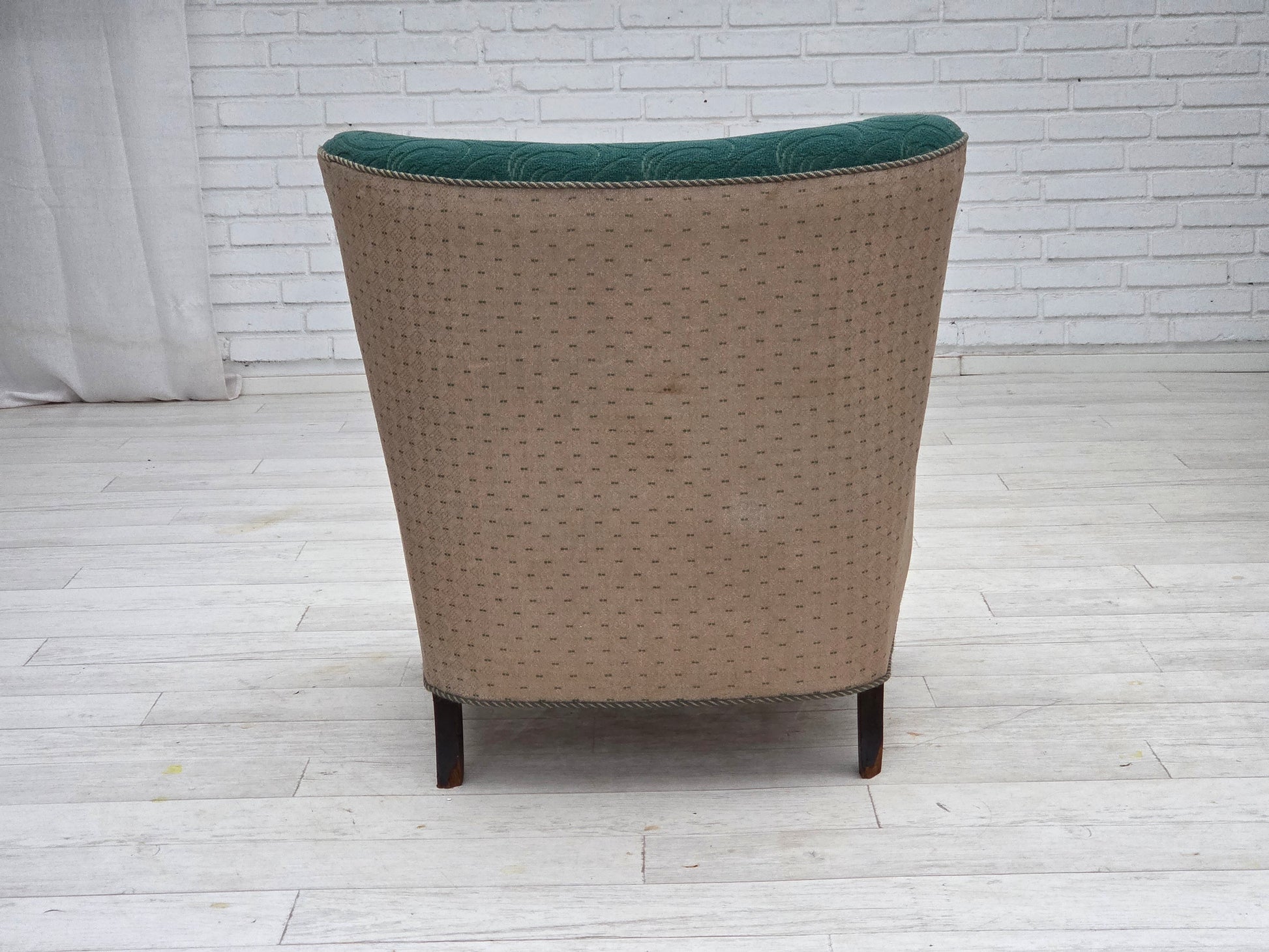 DESCRIPTION: 1950s, Danish armchair. Original green/beige furniture wool, beech wood, brass springs in the seat. Original good condition: no smells, no stains and stable construction. Manufactured by Danish furniture maker in about 1950-55s. Original Scandinavian vintage design directly from Denmark. The chair was checked by craftsman.