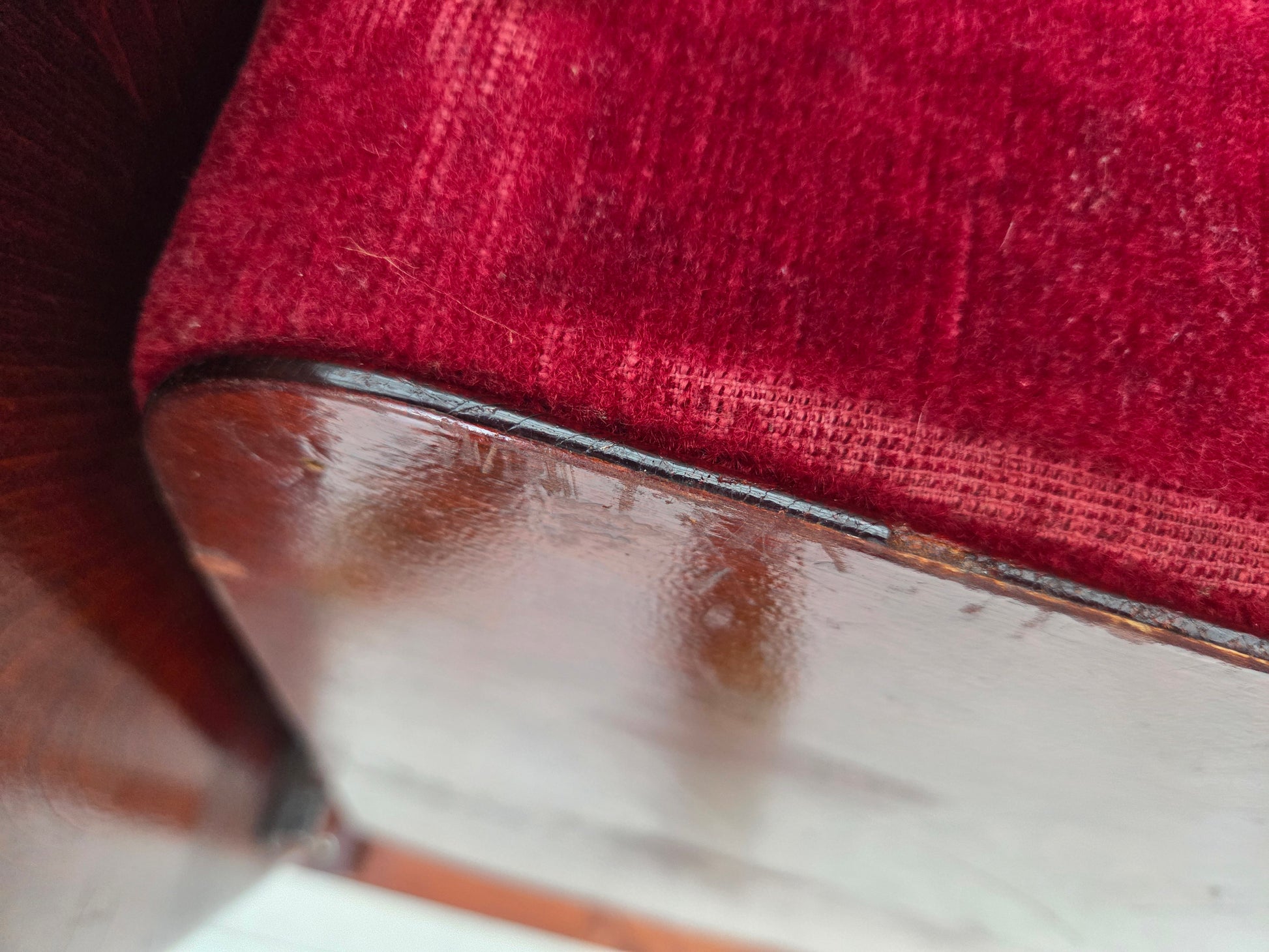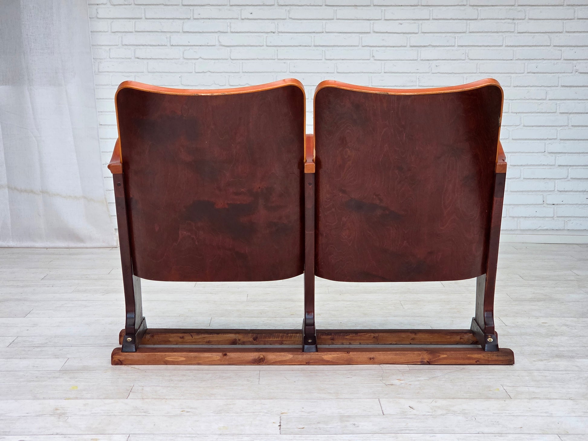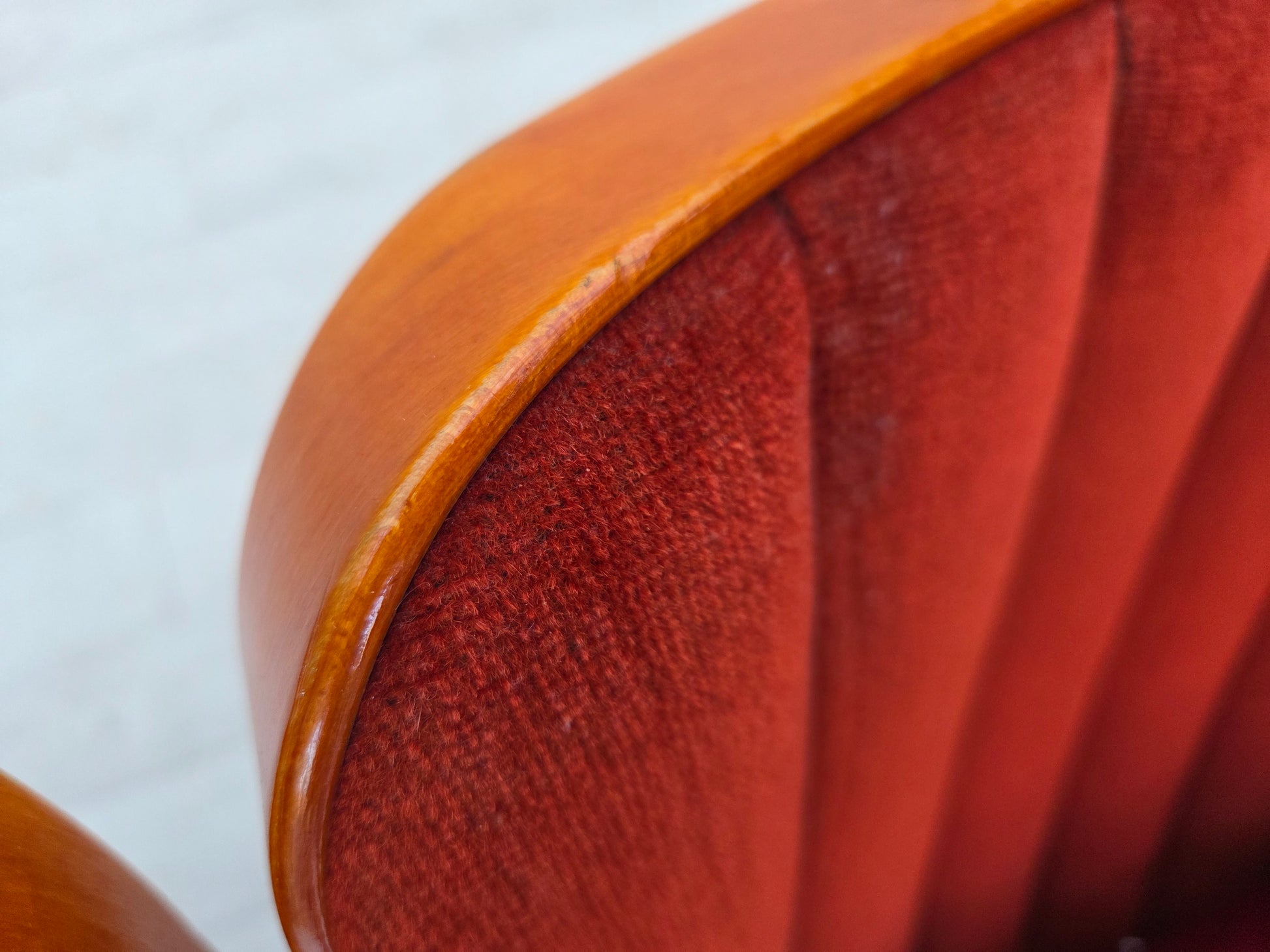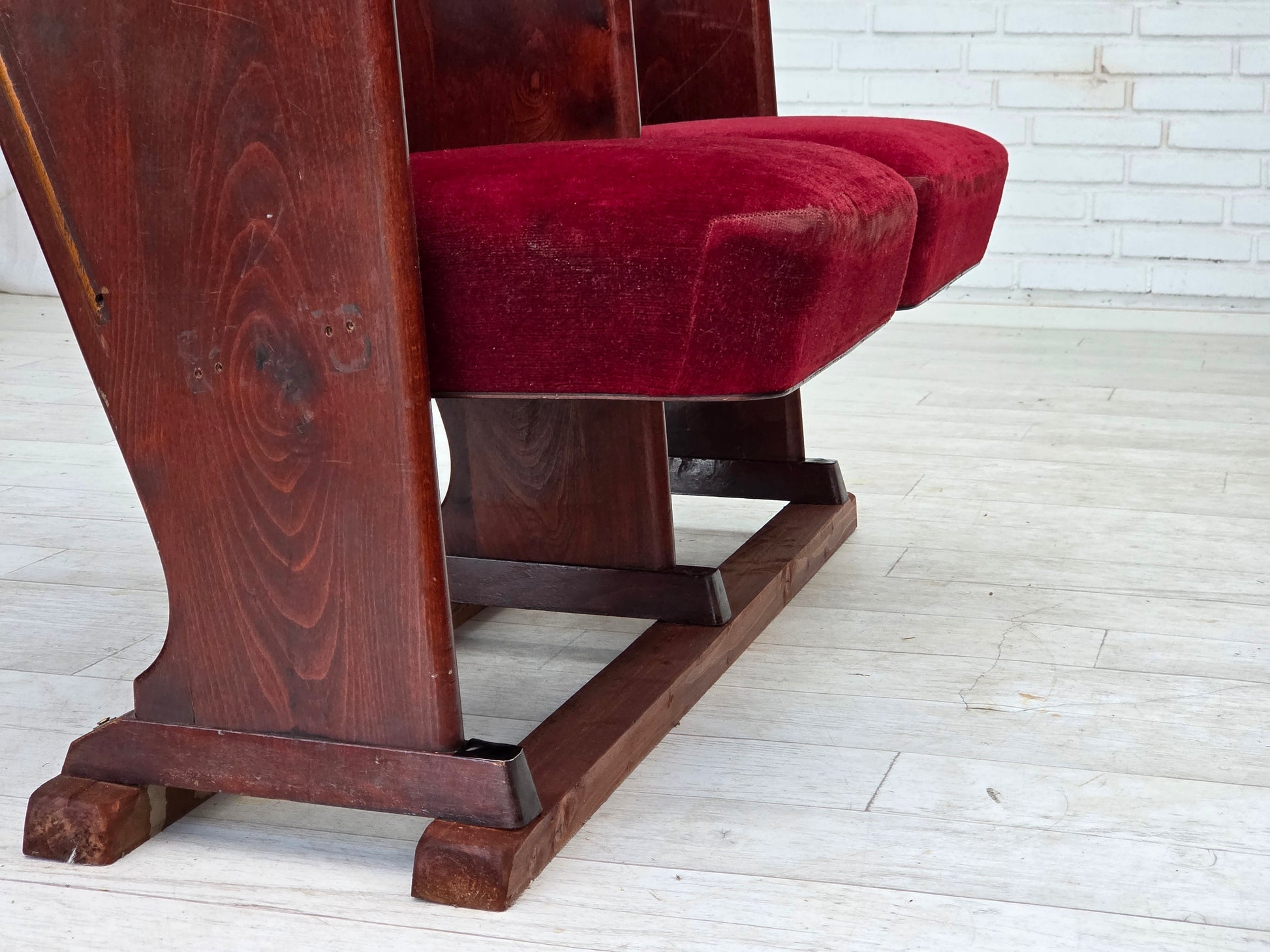DESCRIPTION: 1950s, Danish cinema/theater armchairs. Red and dark orange furniture velour, ash/beech wood. Original good condition: use according to age, no smells and no stains, slightly worn fabric on the seats. Manufactured by Danish furniture maker in about 1950s. Original Scandinavian vintage design directly from Denmark.