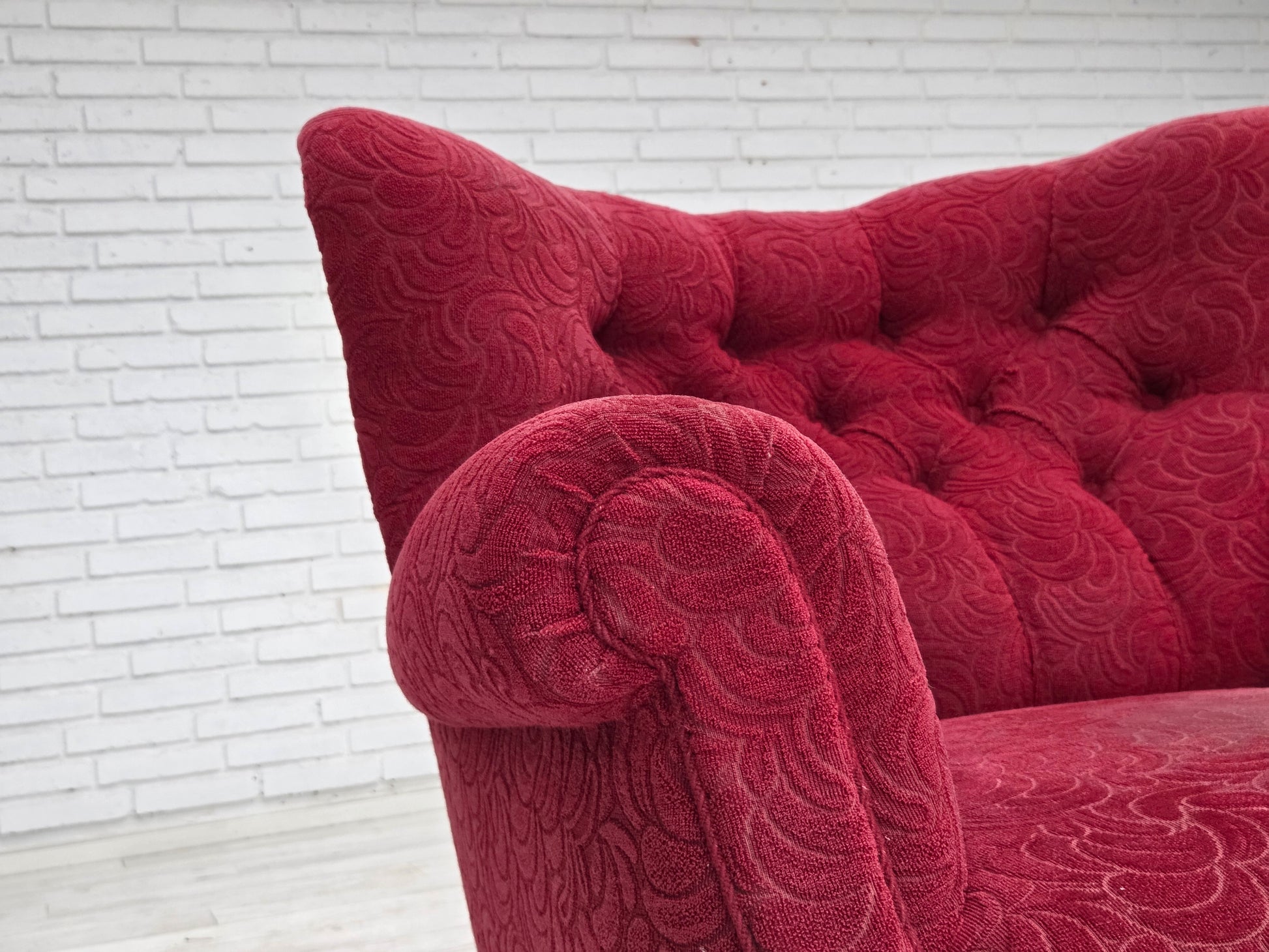 DESCRIPTION: 1950s, Danish relax armchair. Red furniture fabric, ash wood legs, springs in the seat. Original good condition: no smells, no stains and stable construction. Wear due to age and use: slightly worn fabric on the seat. Manufactured by Danish furniture maker in about 1950-55s. Original Scandinavian vintage design directly from Denmark. The chair was checked by craftsman.