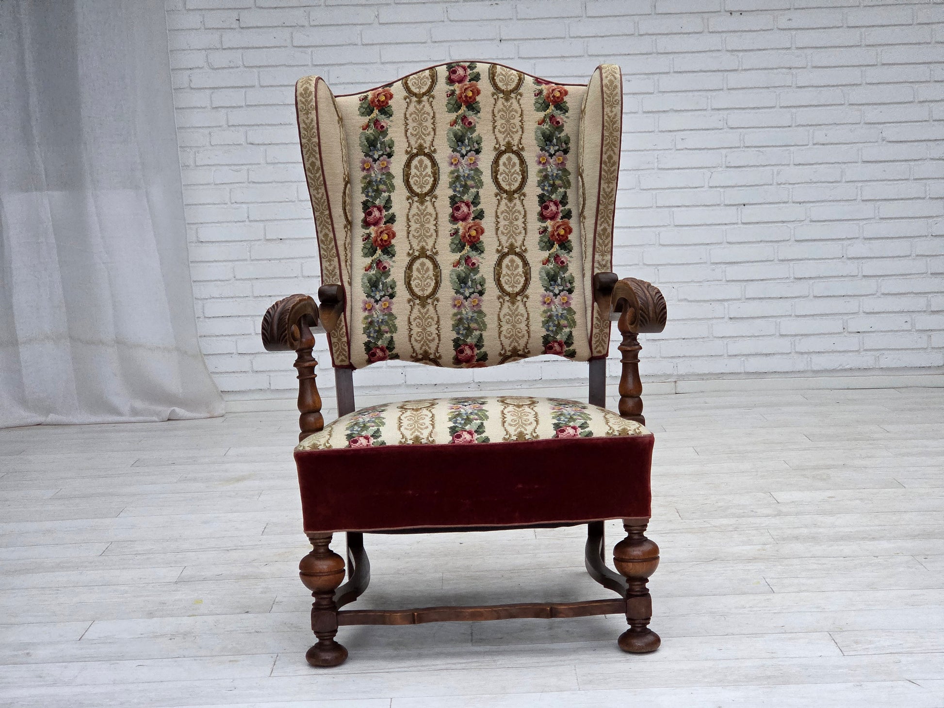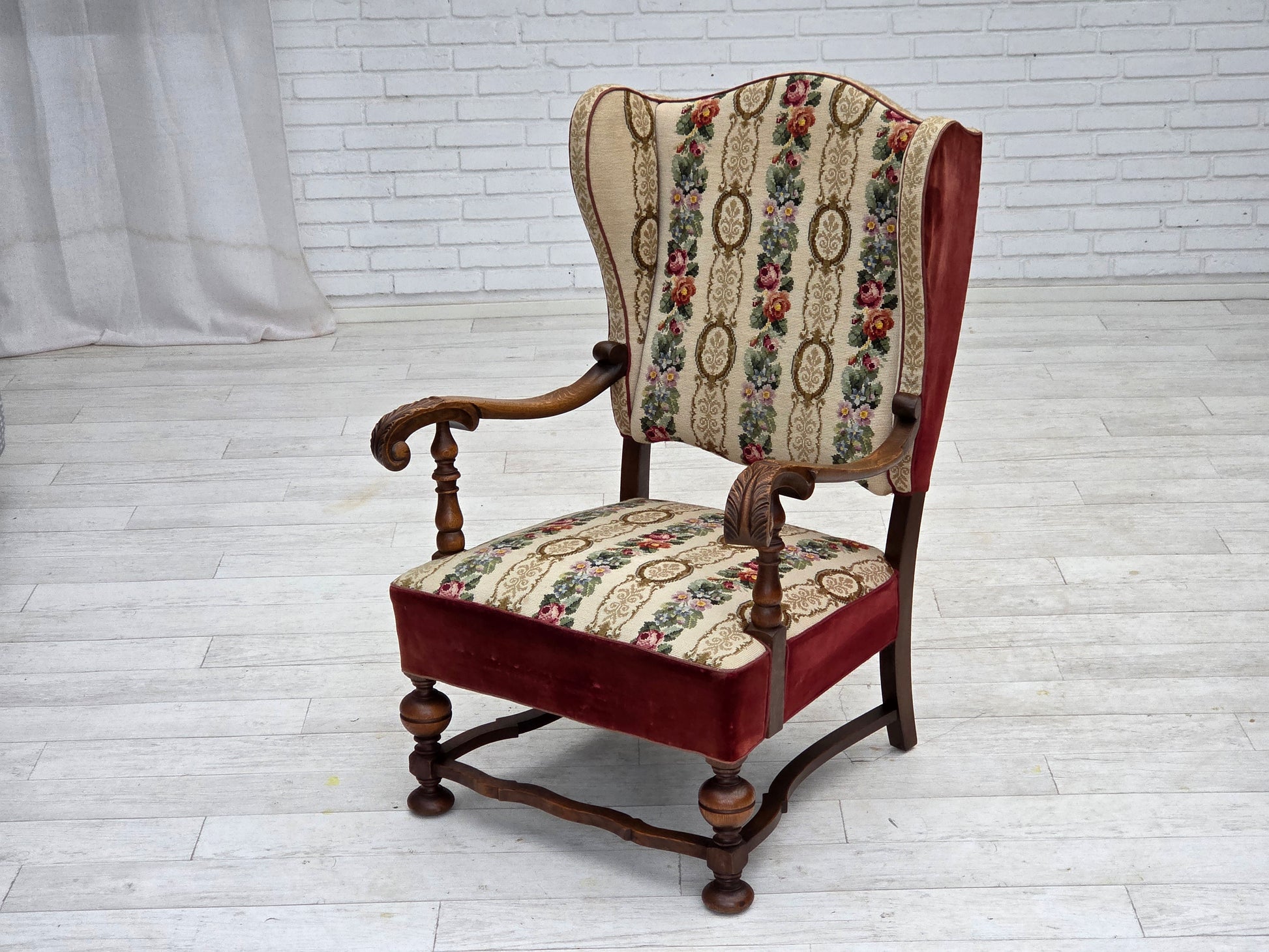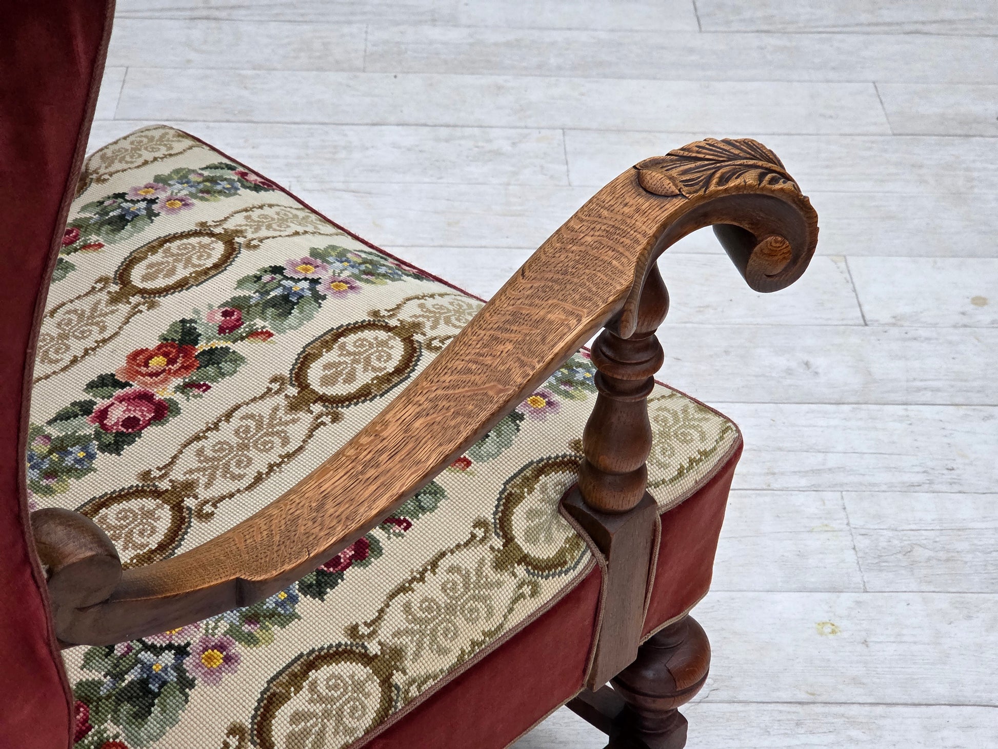 DESCRIPTION: 1950s, Danish wingback armchair. Furniture traditional Danish woven wool fabric, red furniture velour, ash wood legs, springs in the seat. Original good condition: no smells, no stains and stable construction. Manufactured by Danish furniture craftsman in about 1950s. Original Scandinavian vintage design directly from Denmark. The chair was checked by craftsman.